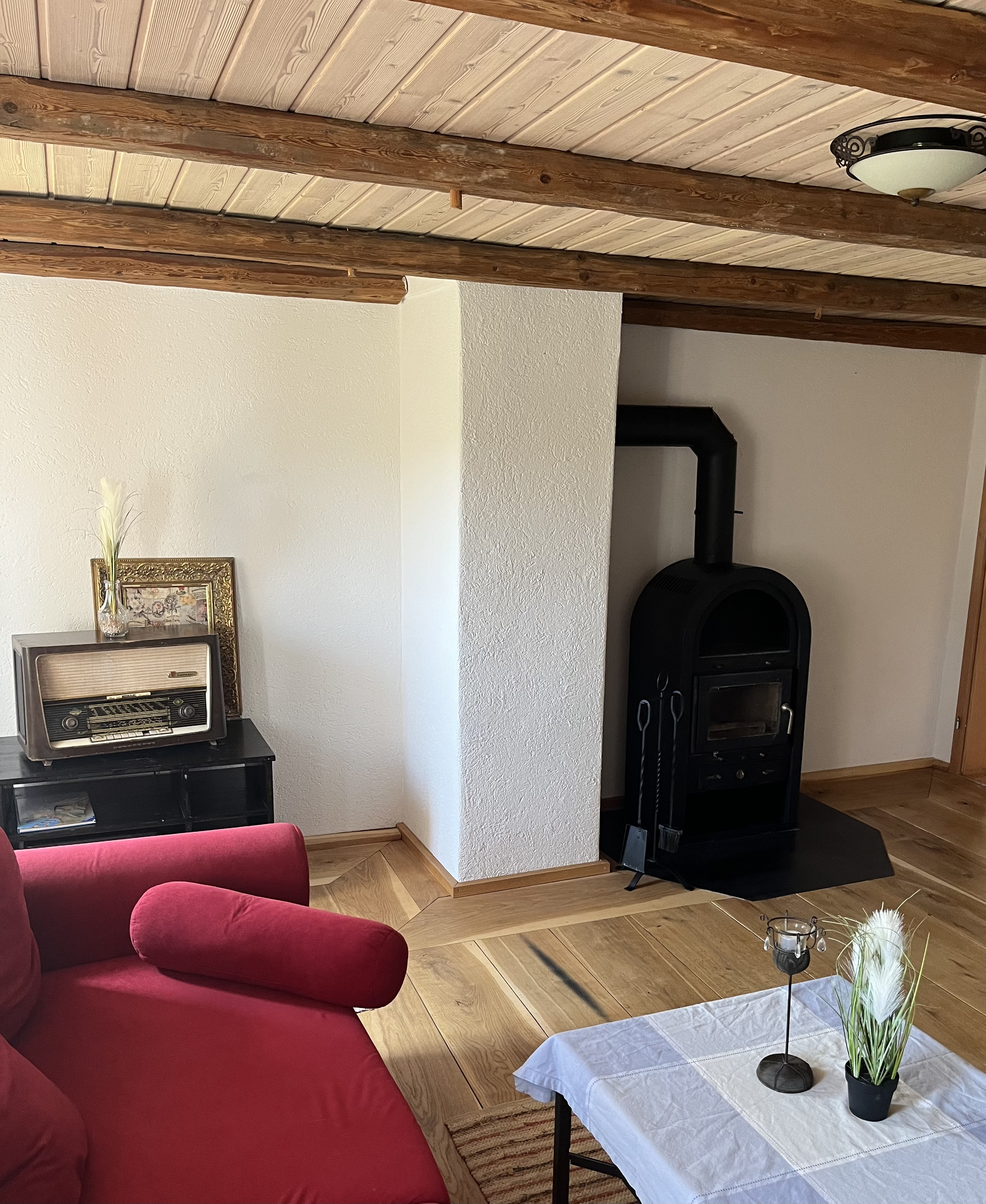 Im Wohnzimmer befindet sich eine schöne Couch mit einem LED TV und einem Holzofen.