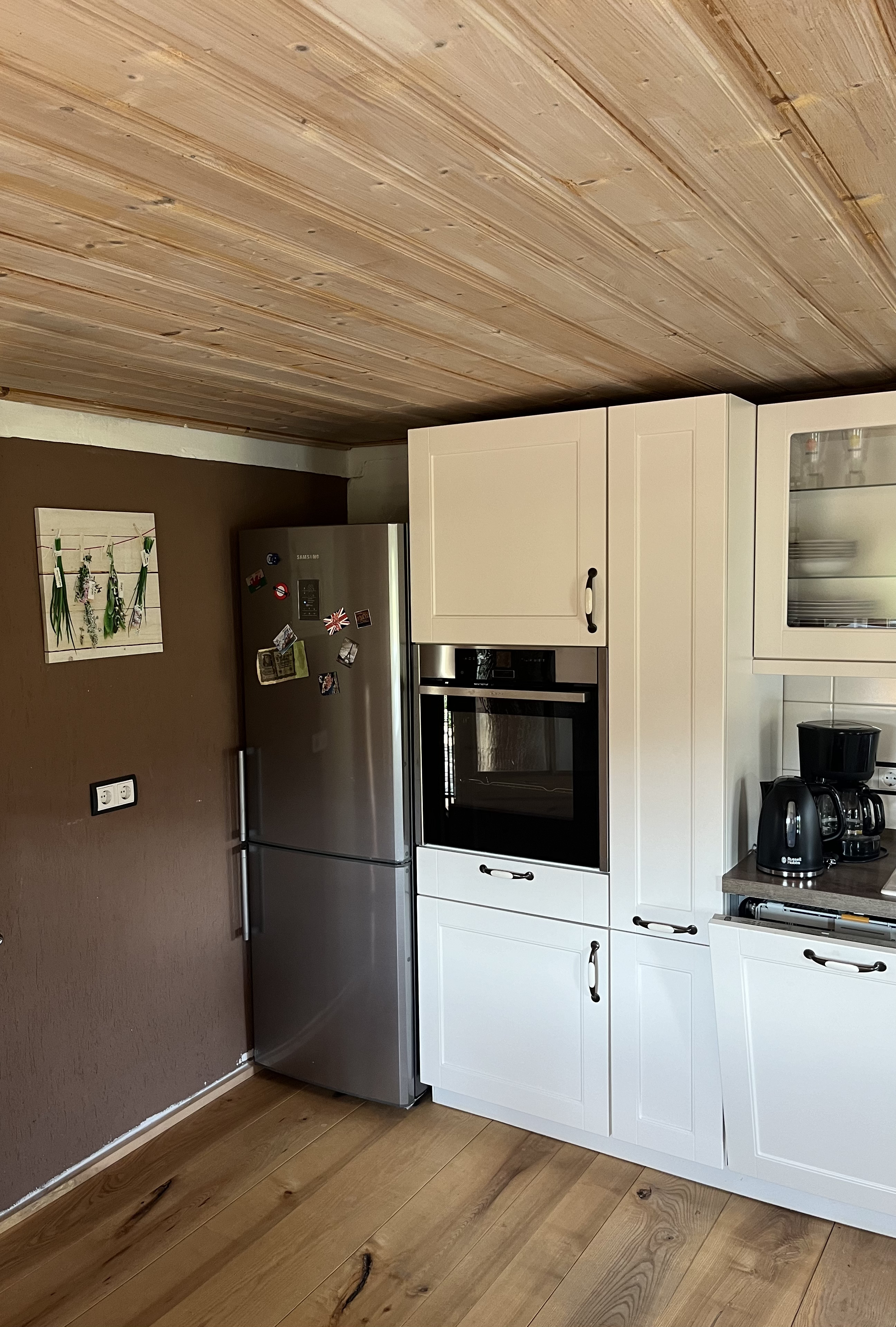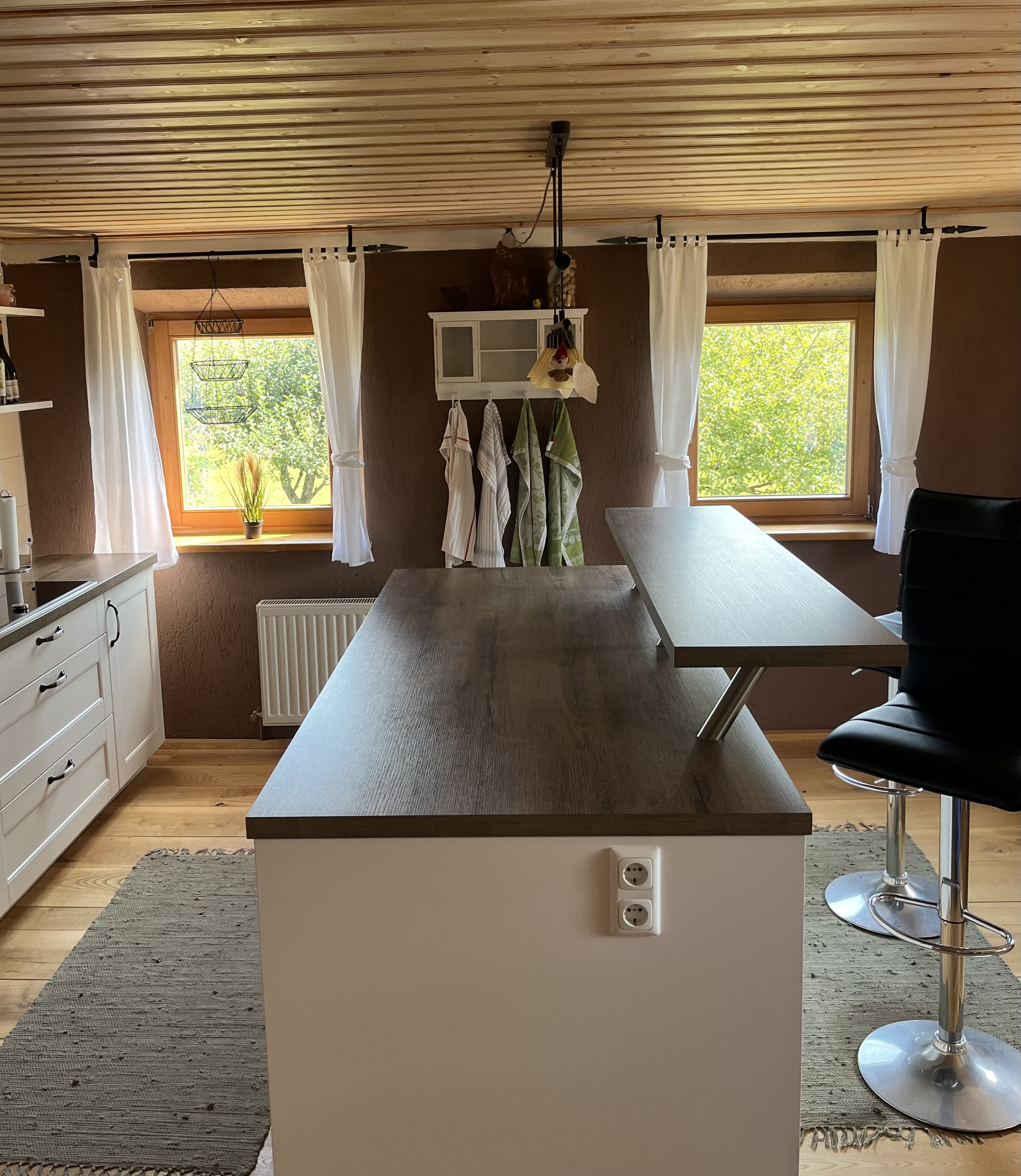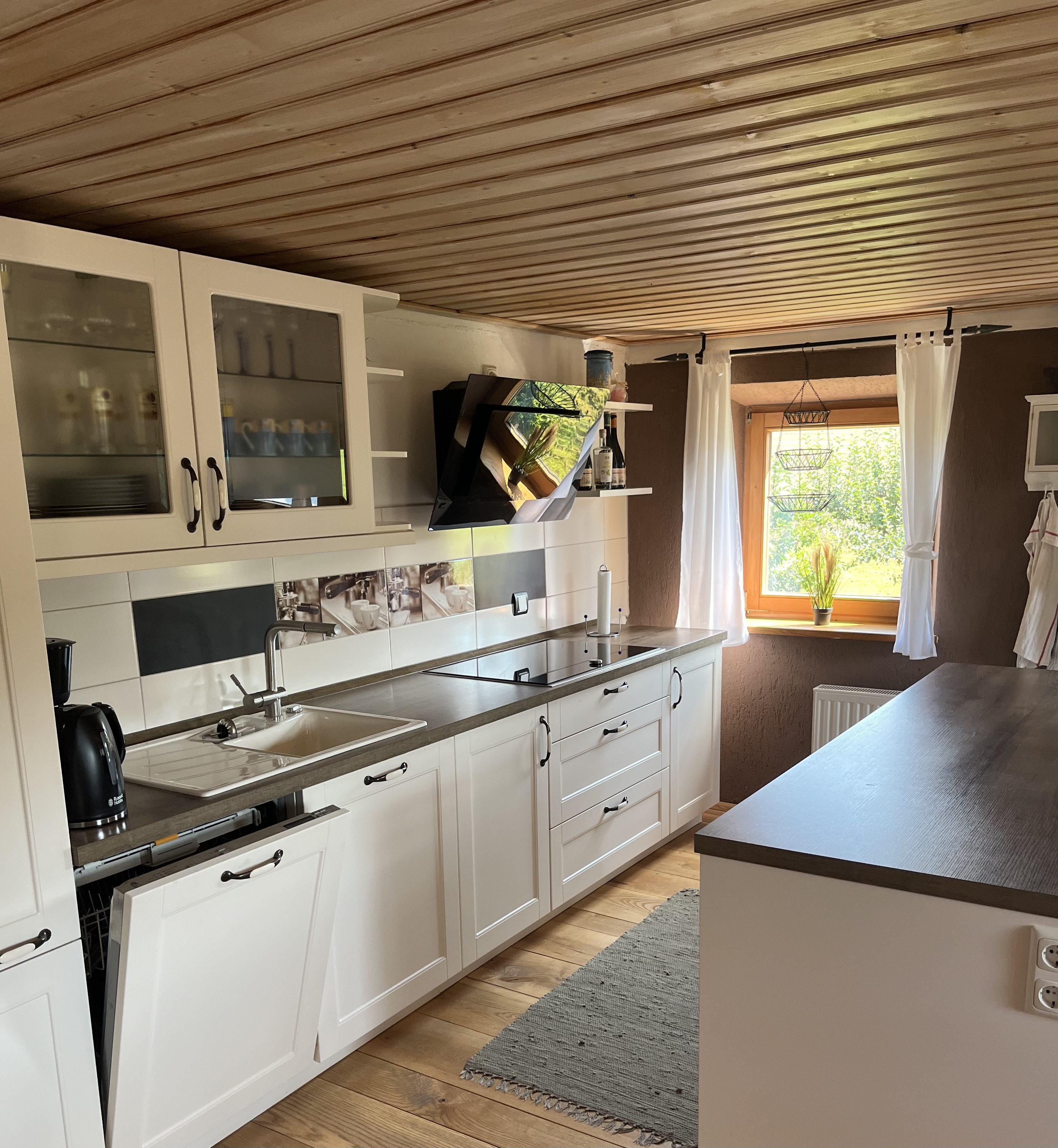 In der Küche befindet sich ein Induktions-Kochfeld, Geschirrspüler, Wasserkocher, Toaster Mikrowelle und ein schöner Esstisch.