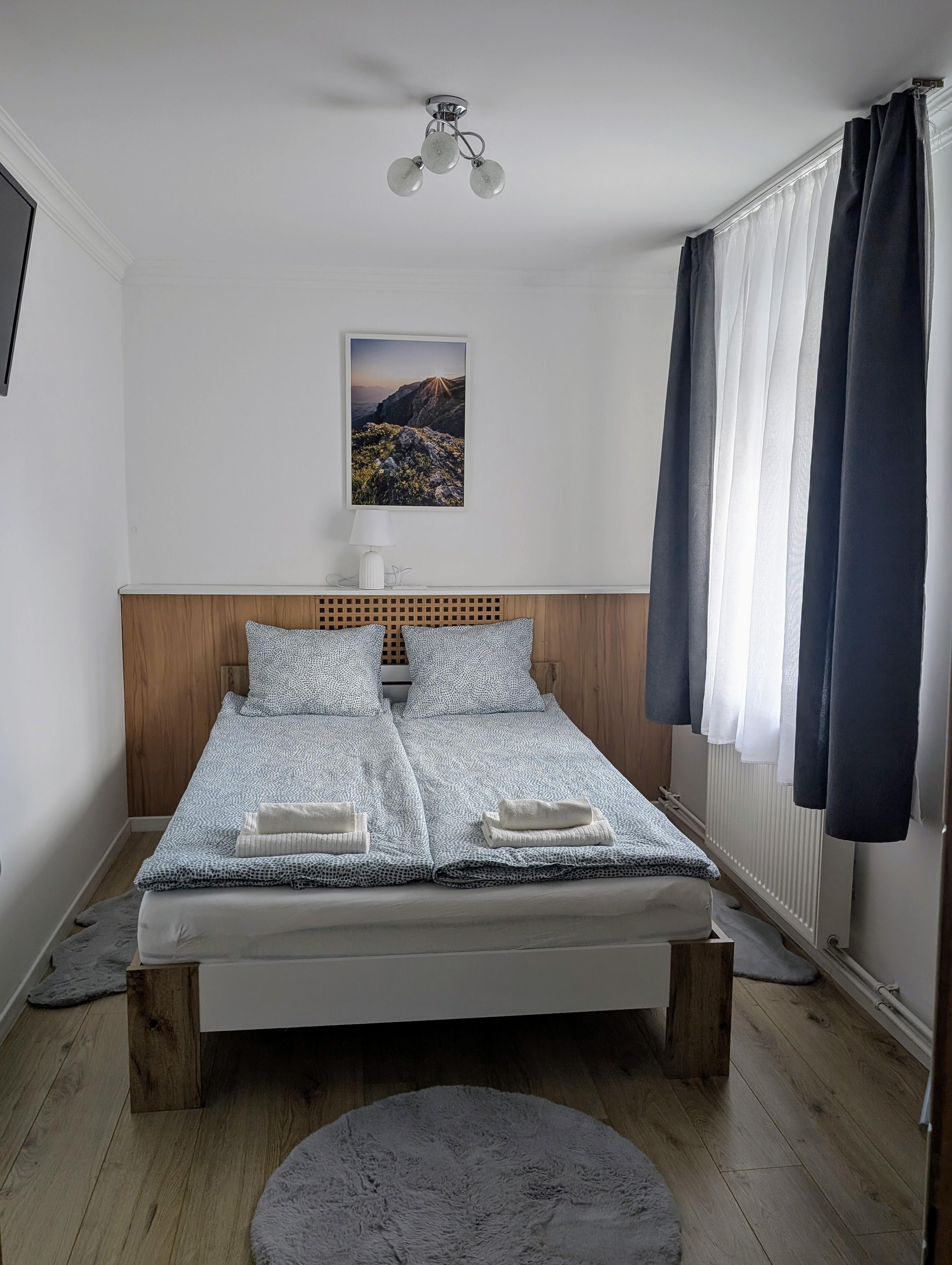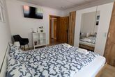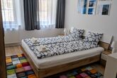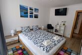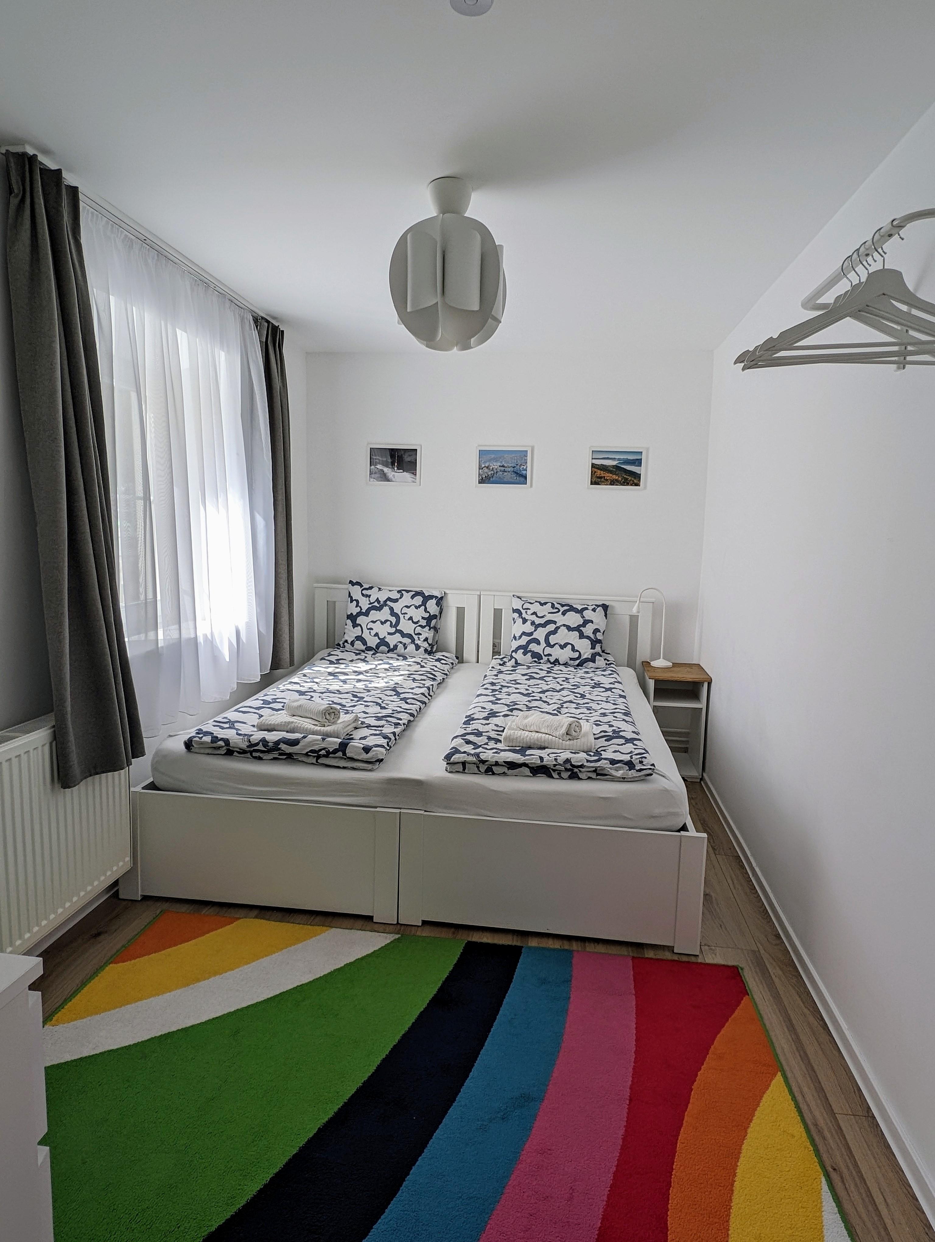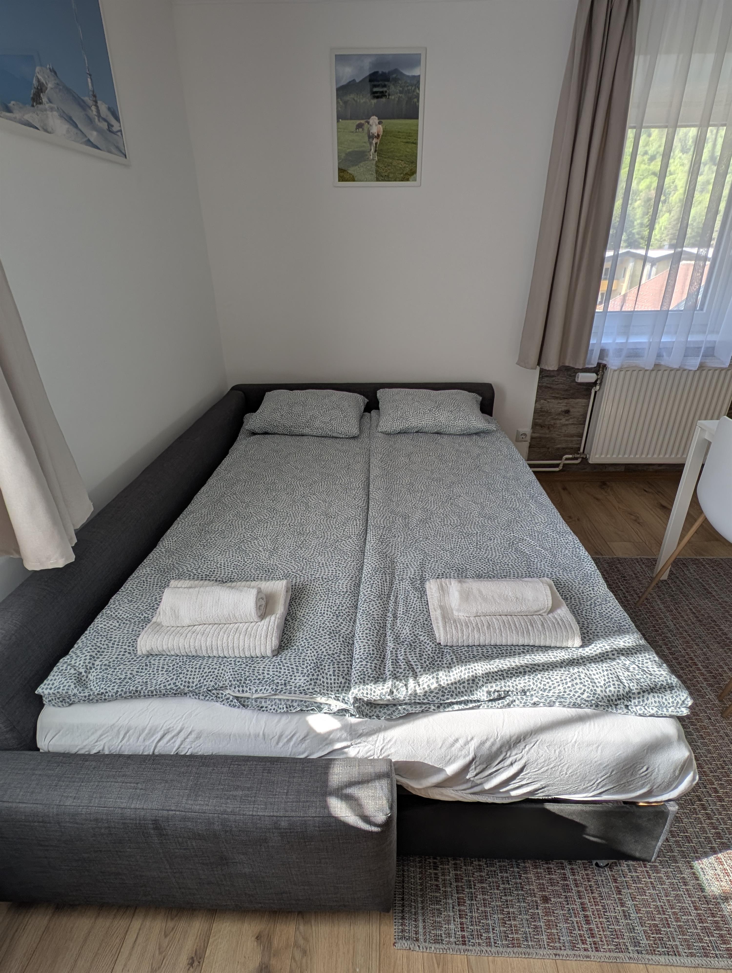 Das große Schlafzimmer hat ein Doppelbett von 180 cm, das kleine Schlafzimmer hat ein 140 cm breites Bett. Das Sofa im Wohnzimmer bietet außerdem Platz für einen Gast auf einem 120 cm breiten Schlafsofa.