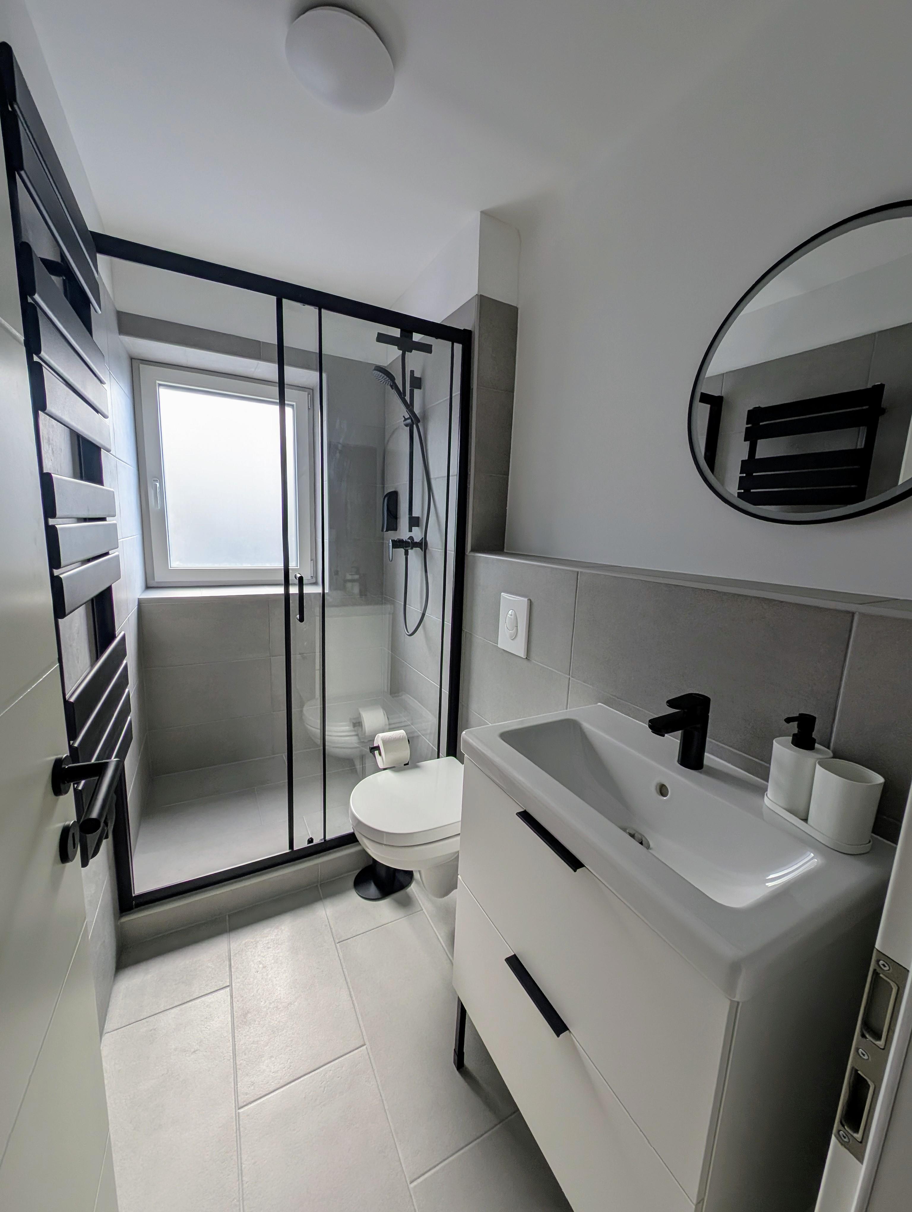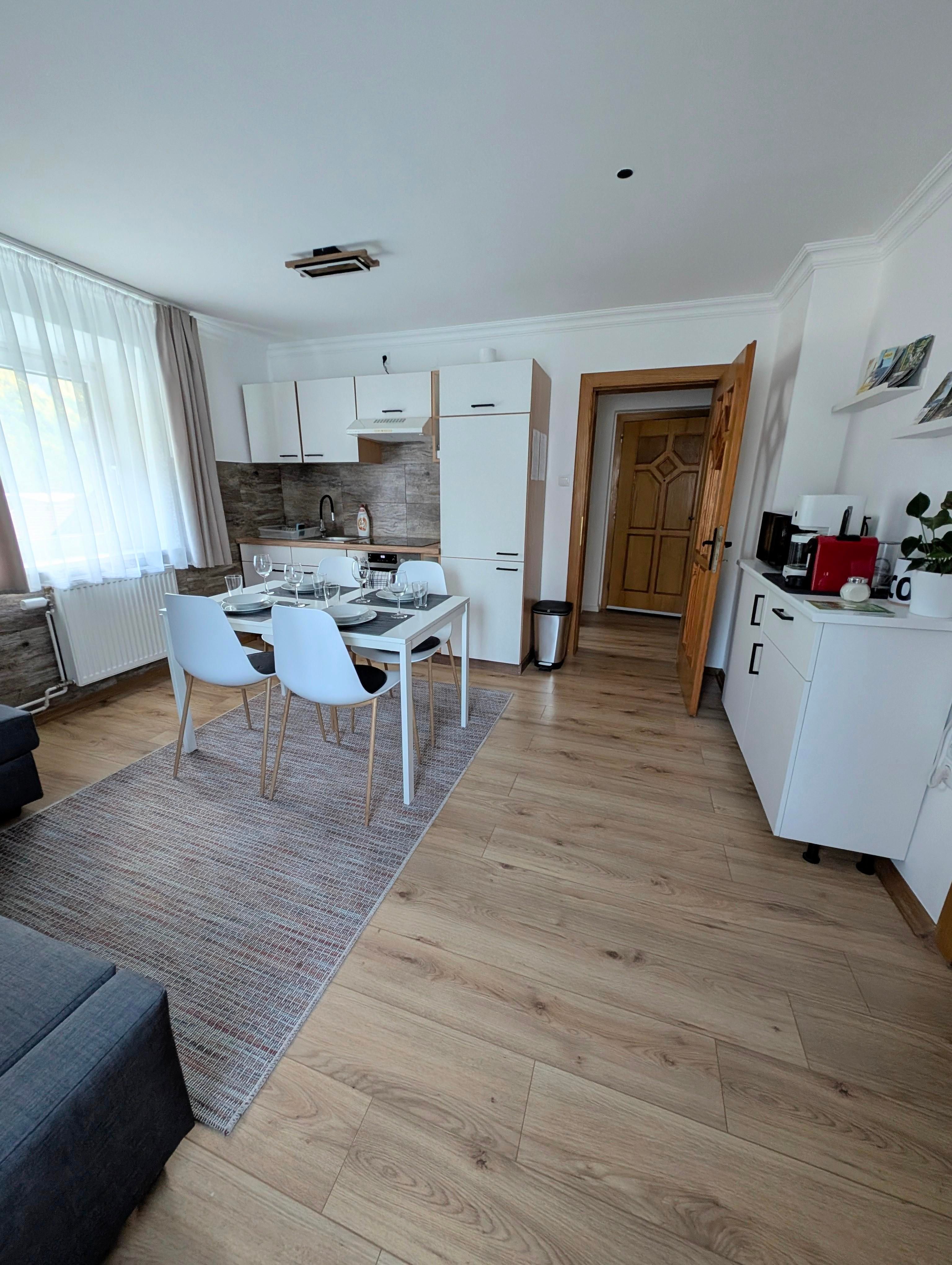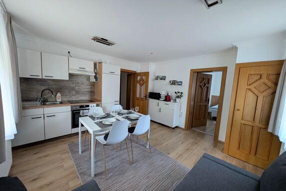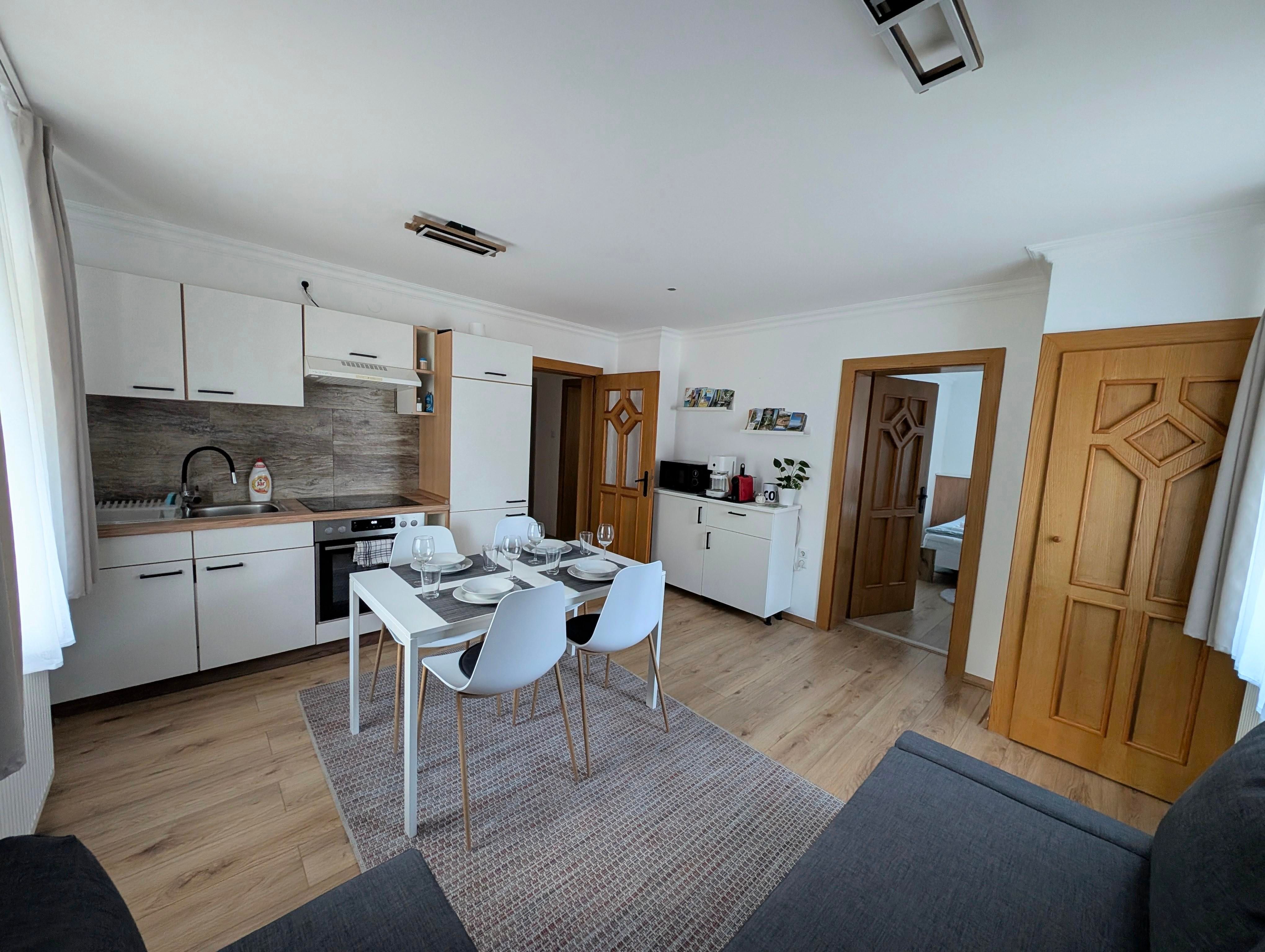 Die Wohnung verfügt über eine voll ausgestattete Küche mit Elektroherd, Backofen, Mikrowelle, Nespresso-Kaffeemaschine, Filterkaffeemaschine, Toaster, Wasserkocher und Kühlschrank, Bad mit Dusche und WC.