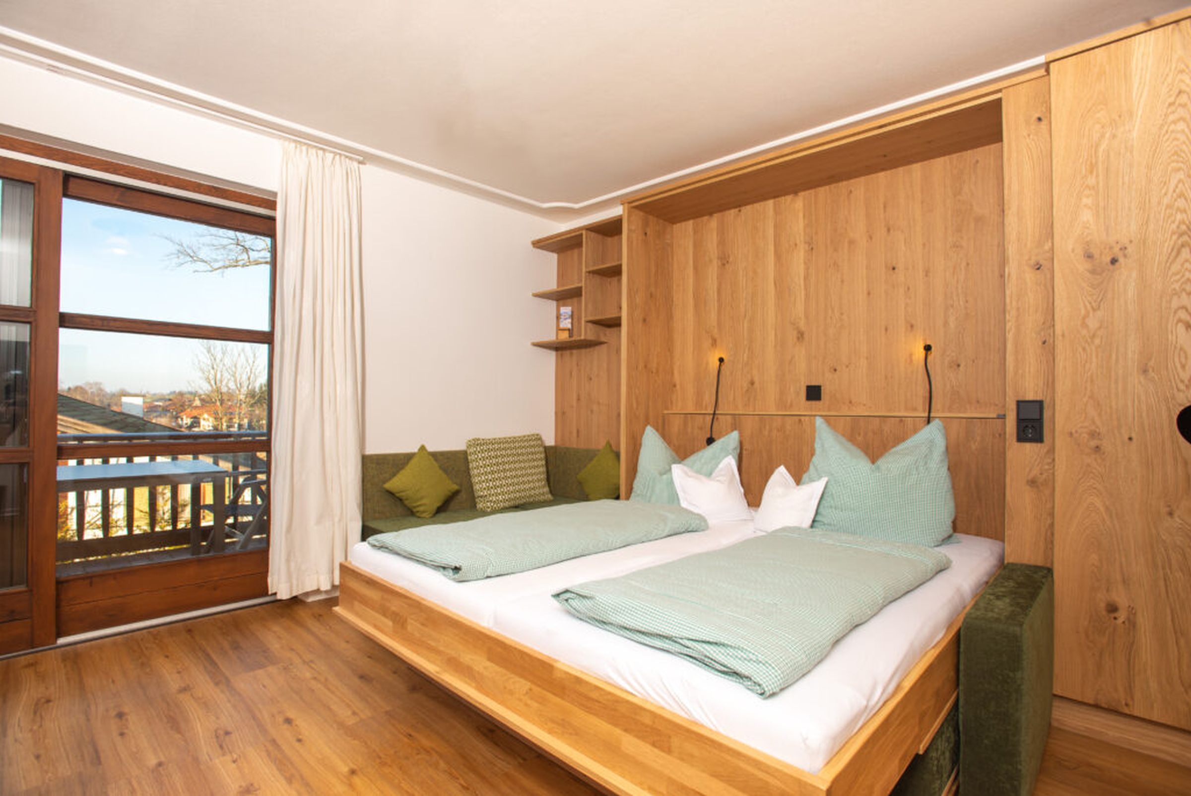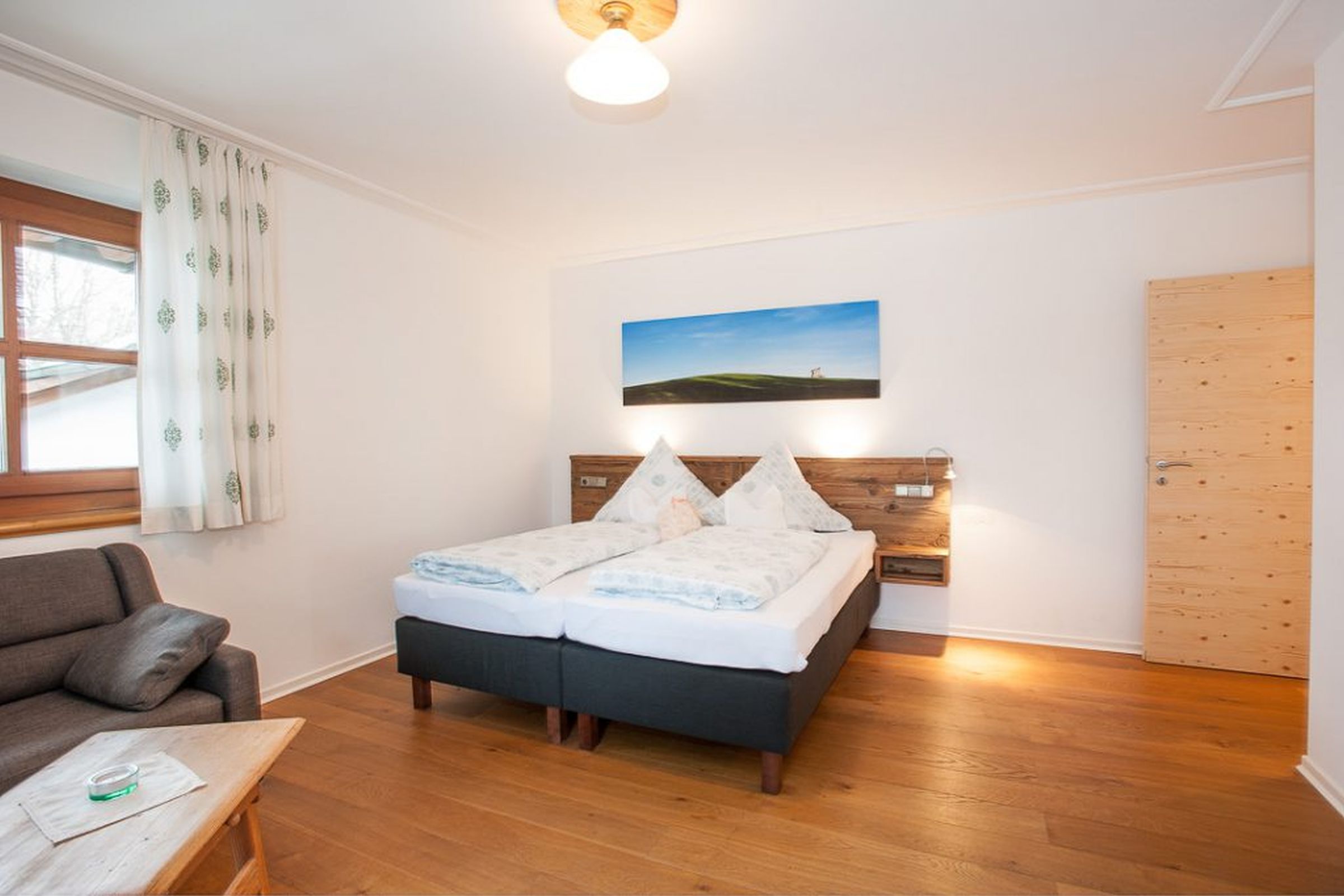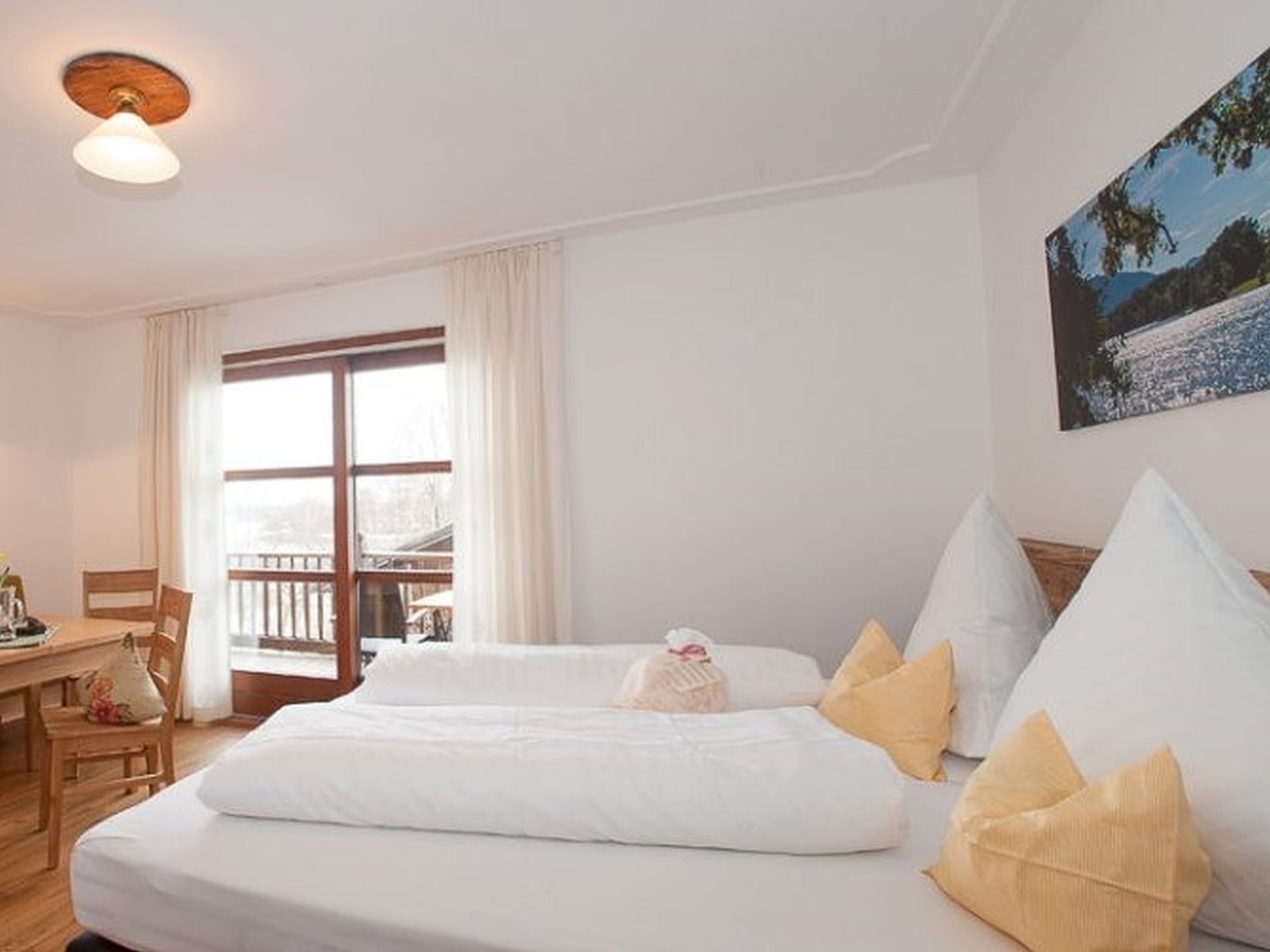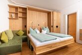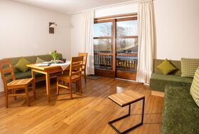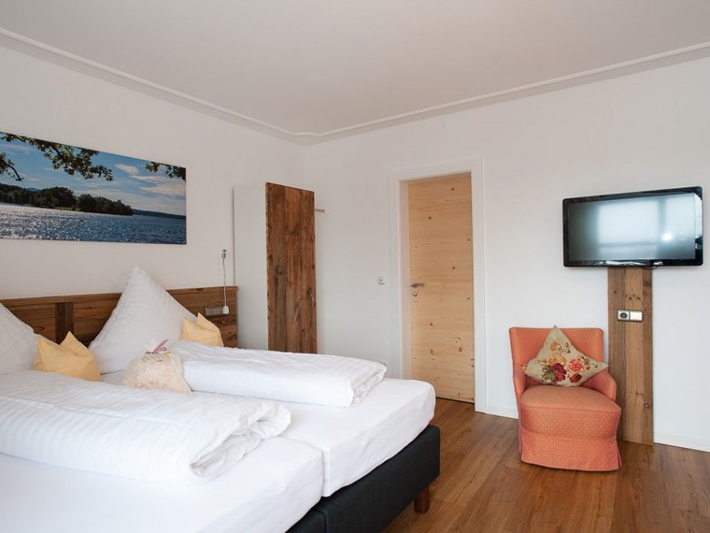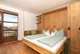 Gemütlich, bayerisch – modern – alpin eingerichtetes großes Apartment mit zwei komplett von einander getrennten Räumen. Schlafmöglichkeit bis zu sechs Personen. Jedes Zimmer ist von der mittendrin befindlichen Küche getrennt, hat ein eigenes Bad mit Dusche und WC. Ebenfalls gibt es in jedem Zimmer einen Flachbildschirm-TV. Großer Schrank mit Spiegel in Raumhöhe. Die Balkone im Osten und auch im Norden Richtung See und Dorf sind ausgestattet mit Tisch, Stühlen und einer Liege. Abdunkelbar mit Rollo. Insektenschutztüren und -gitter zur guten und ausreichenden Lüftung verbaut. Im Sommer wunderbar kühl – im Winter kuschelig und gemütlich warm.