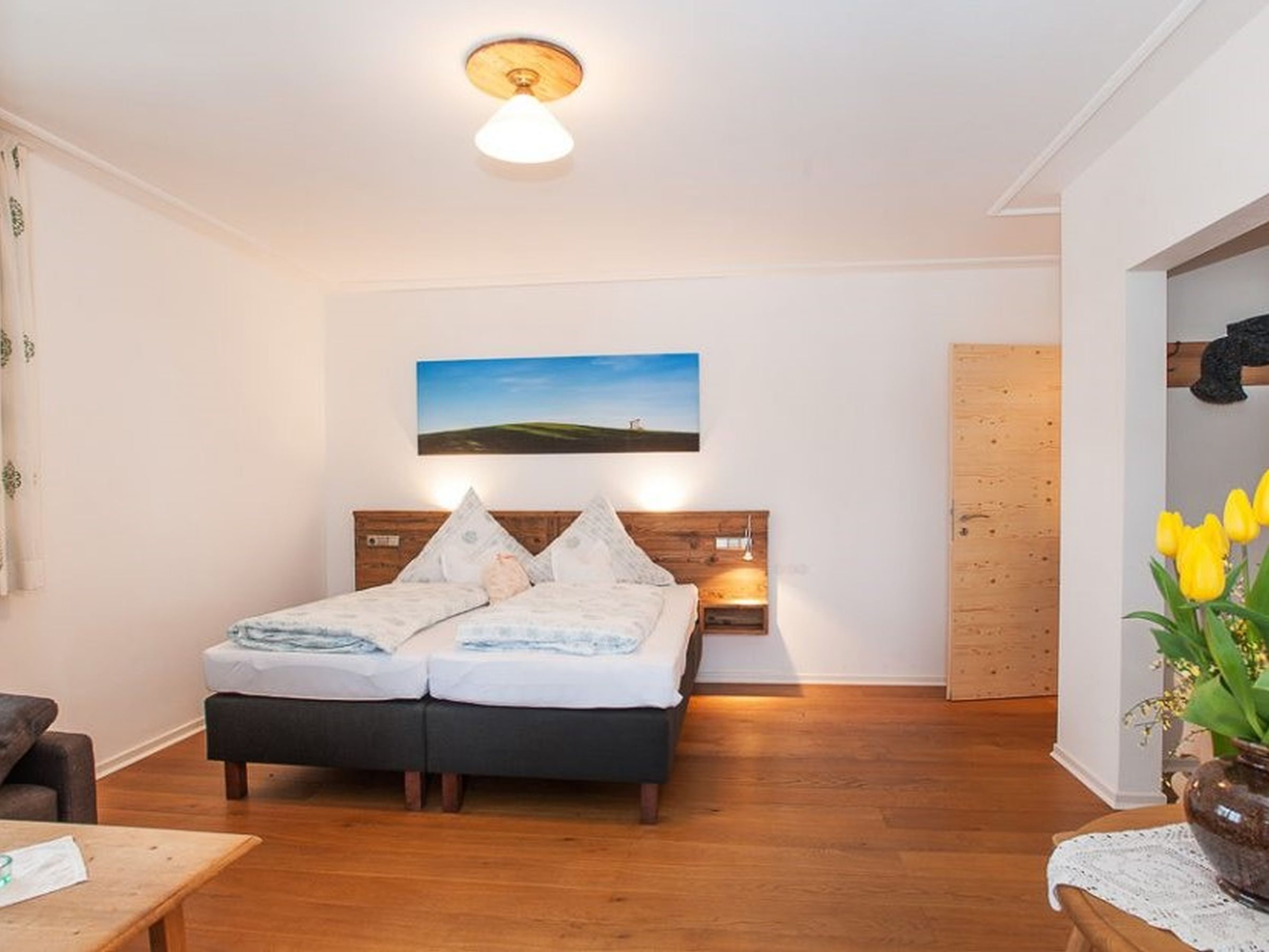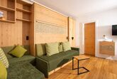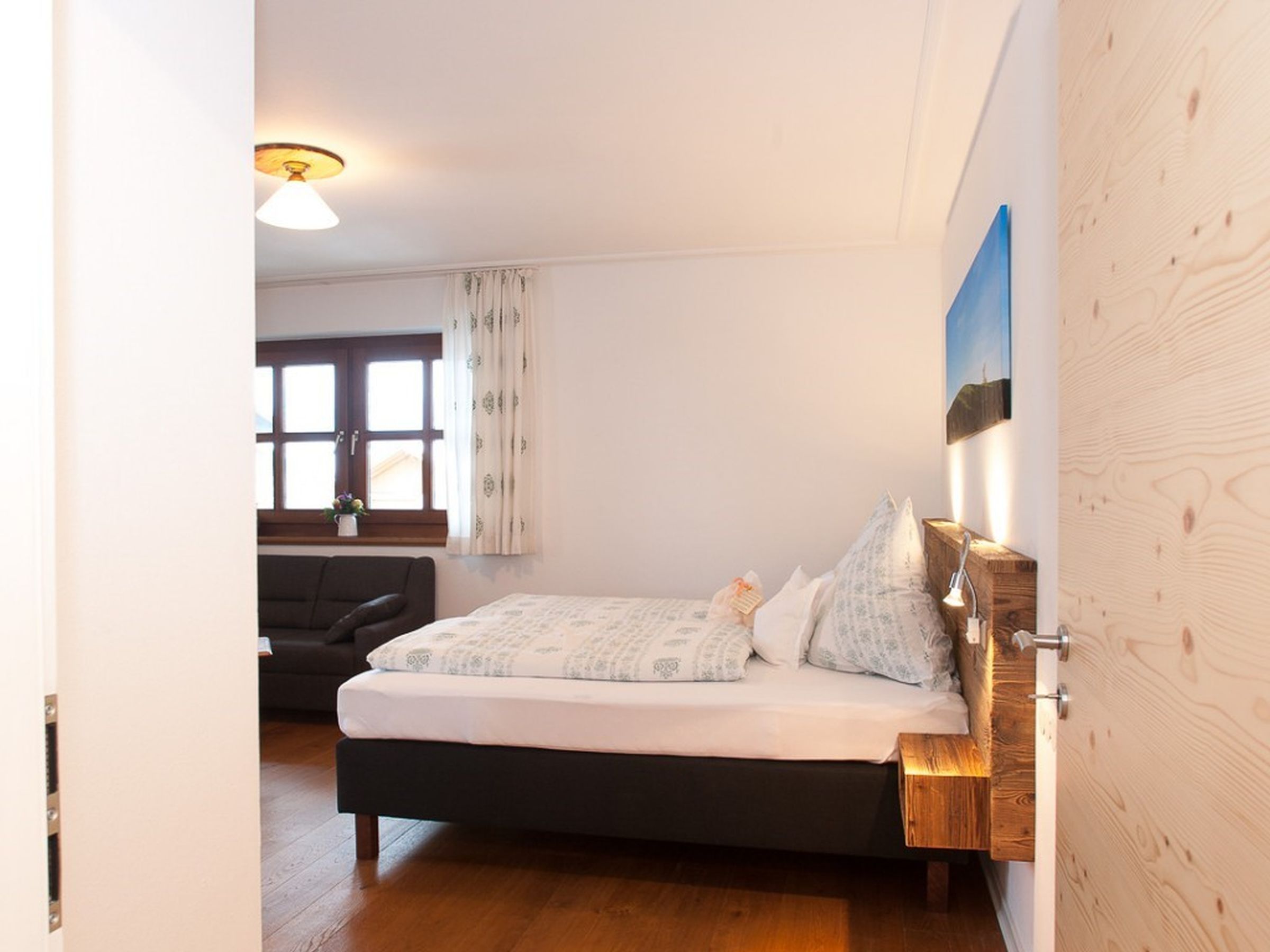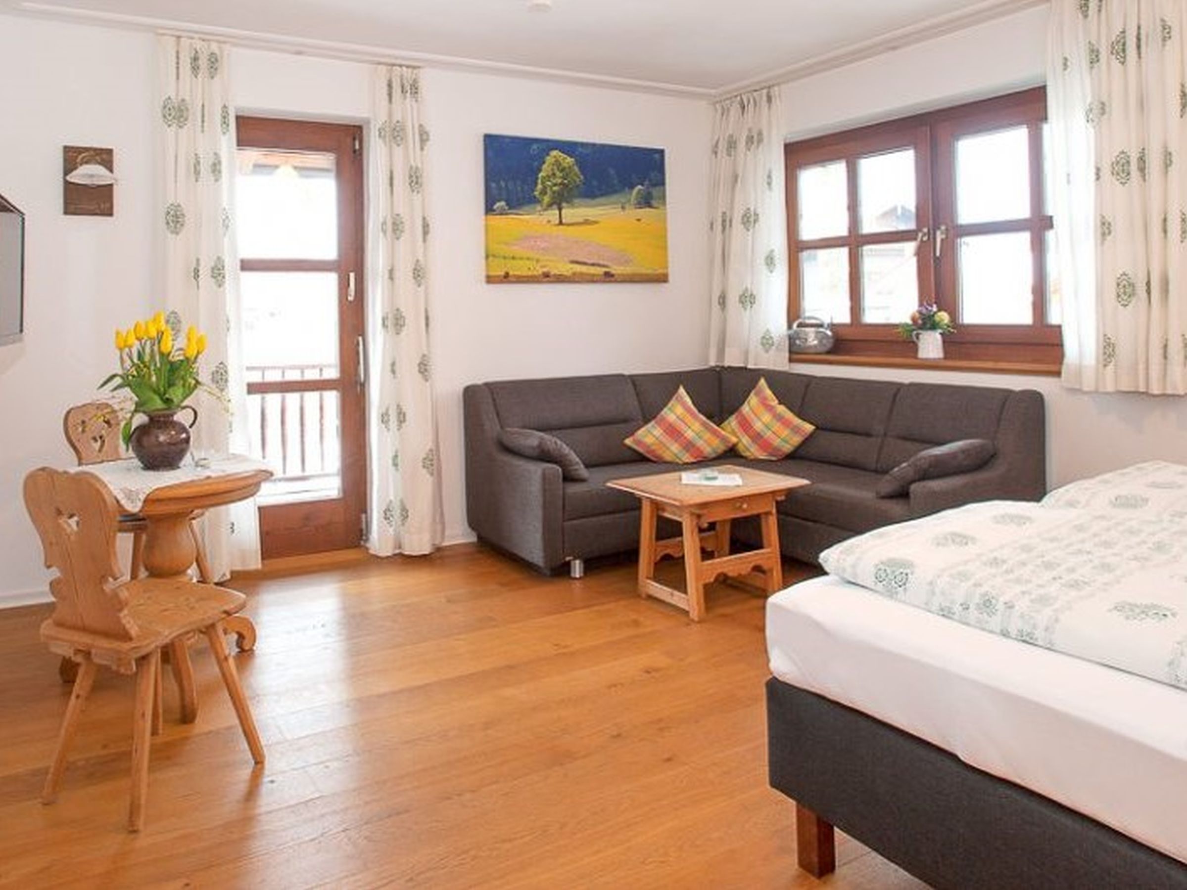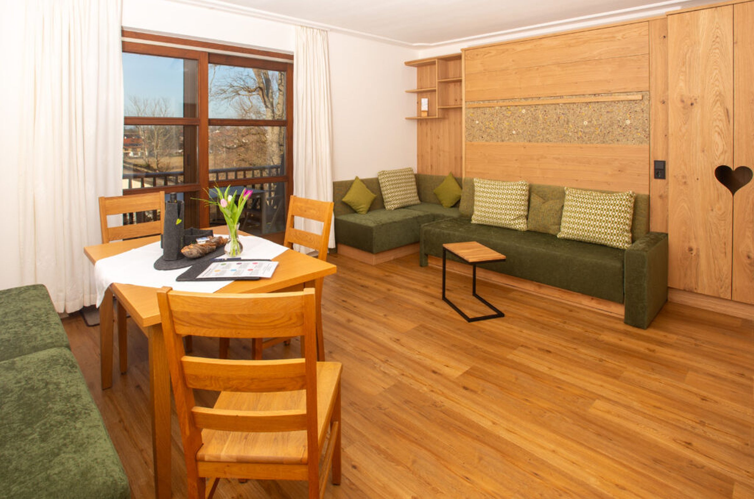 Gemütlich, bayerisch – modern – alpin eingerichtetes großes Apartment mit zwei komplett von einander getrennten Räumen. Schlafmöglichkeit bis zu sechs Personen. Jedes Zimmer ist von der mittendrin befindlichen Küche getrennt, hat ein eigenes Bad mit Dusche und WC. Ebenfalls gibt es in jedem Zimmer einen Flachbildschirm-TV. Großer Schrank mit Spiegel in Raumhöhe. Die Balkone im Osten und auch im Norden Richtung See und Dorf sind ausgestattet mit Tisch, Stühlen und einer Liege. Abdunkelbar mit Rollo. Insektenschutztüren und -gitter zur guten und ausreichenden Lüftung verbaut. Im Sommer wunderbar kühl – im Winter kuschelig und gemütlich warm.