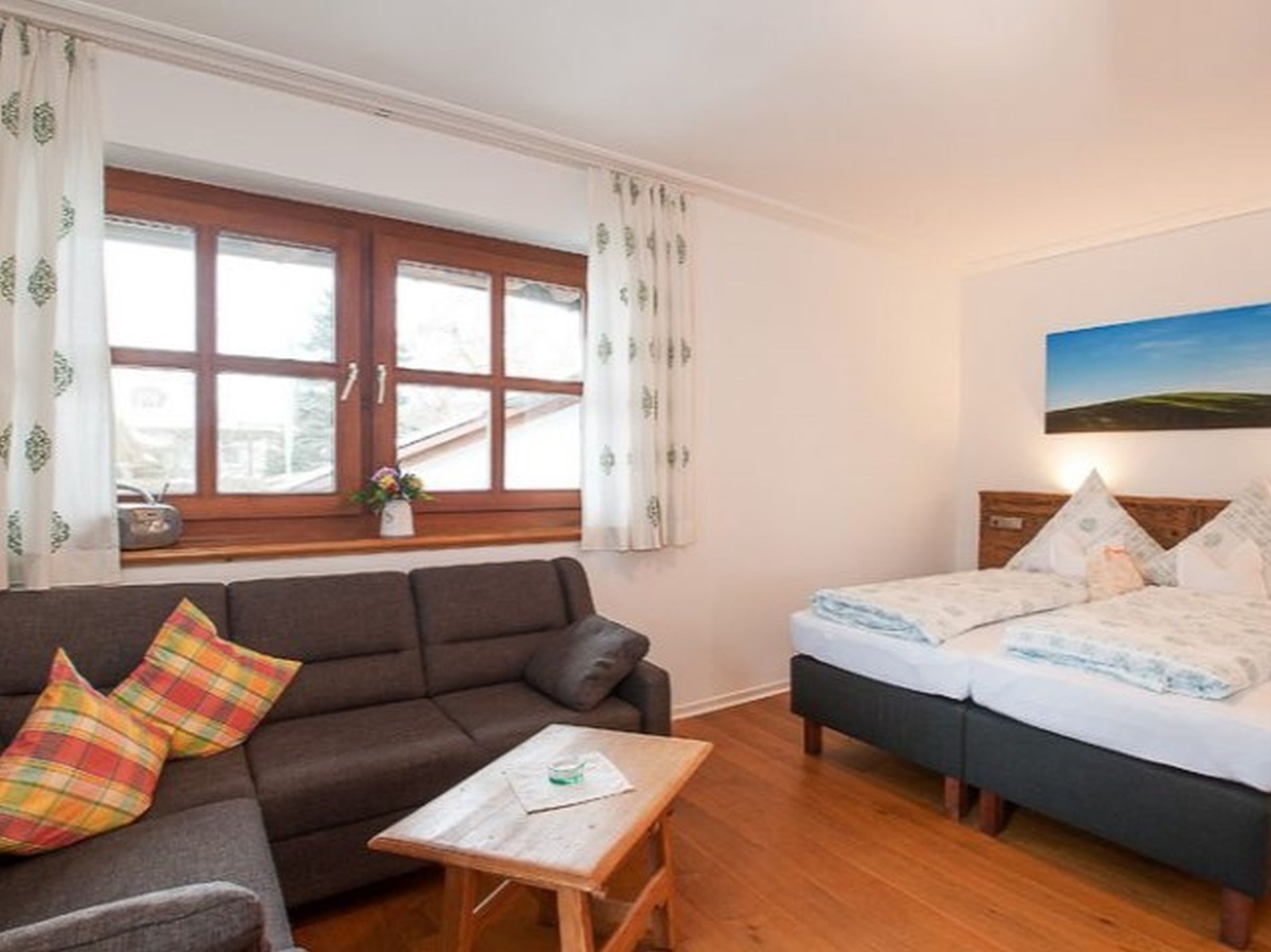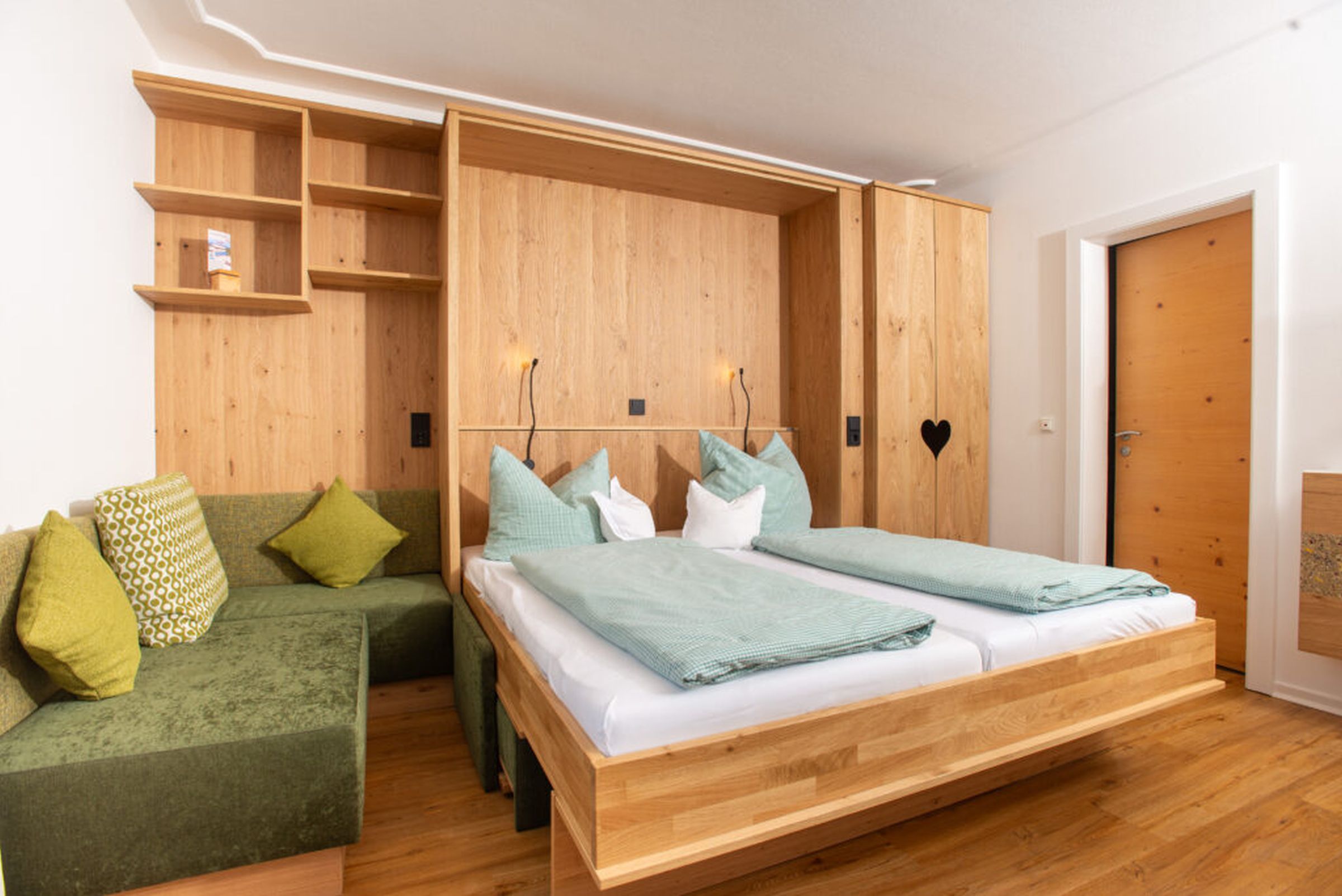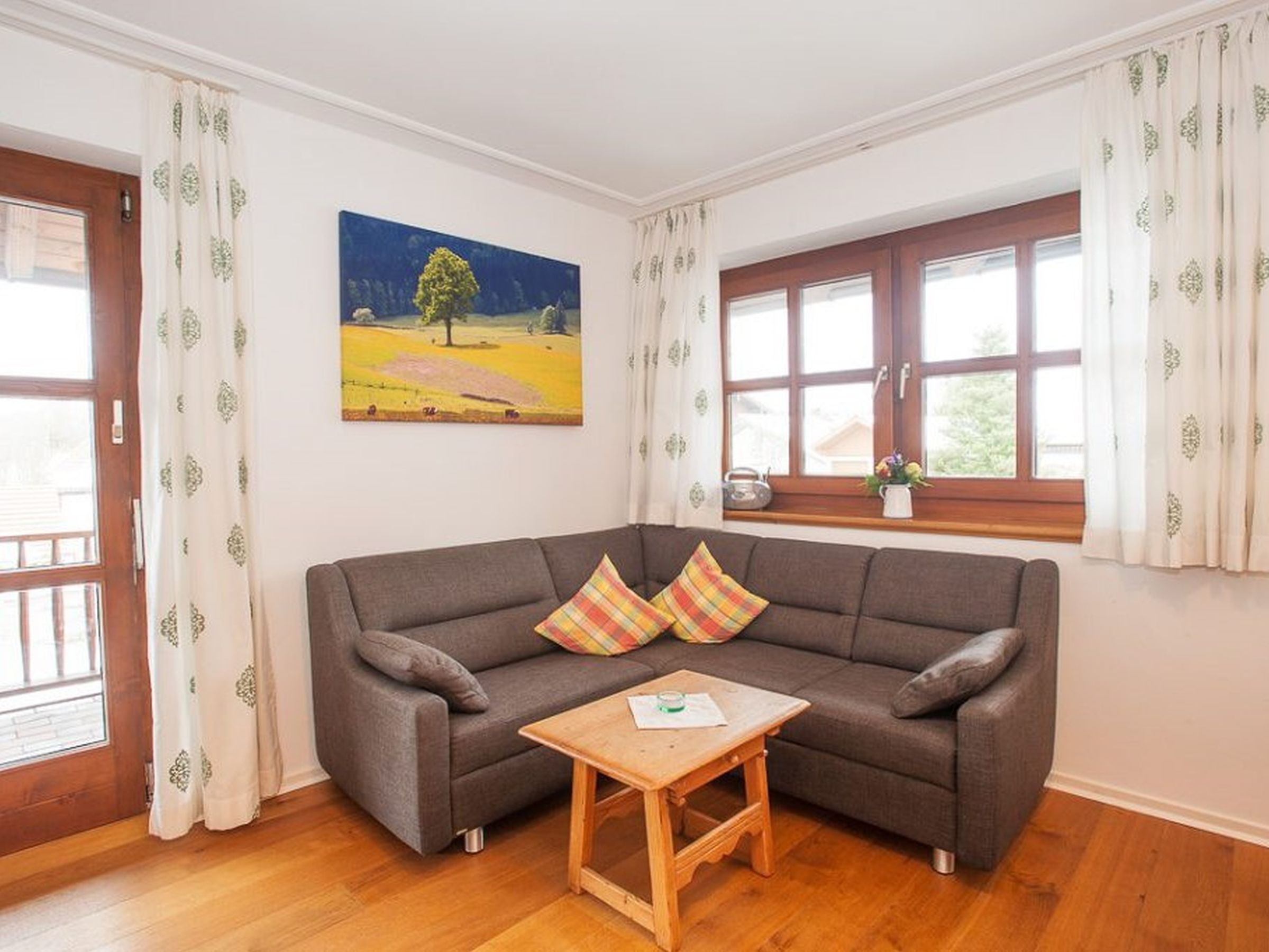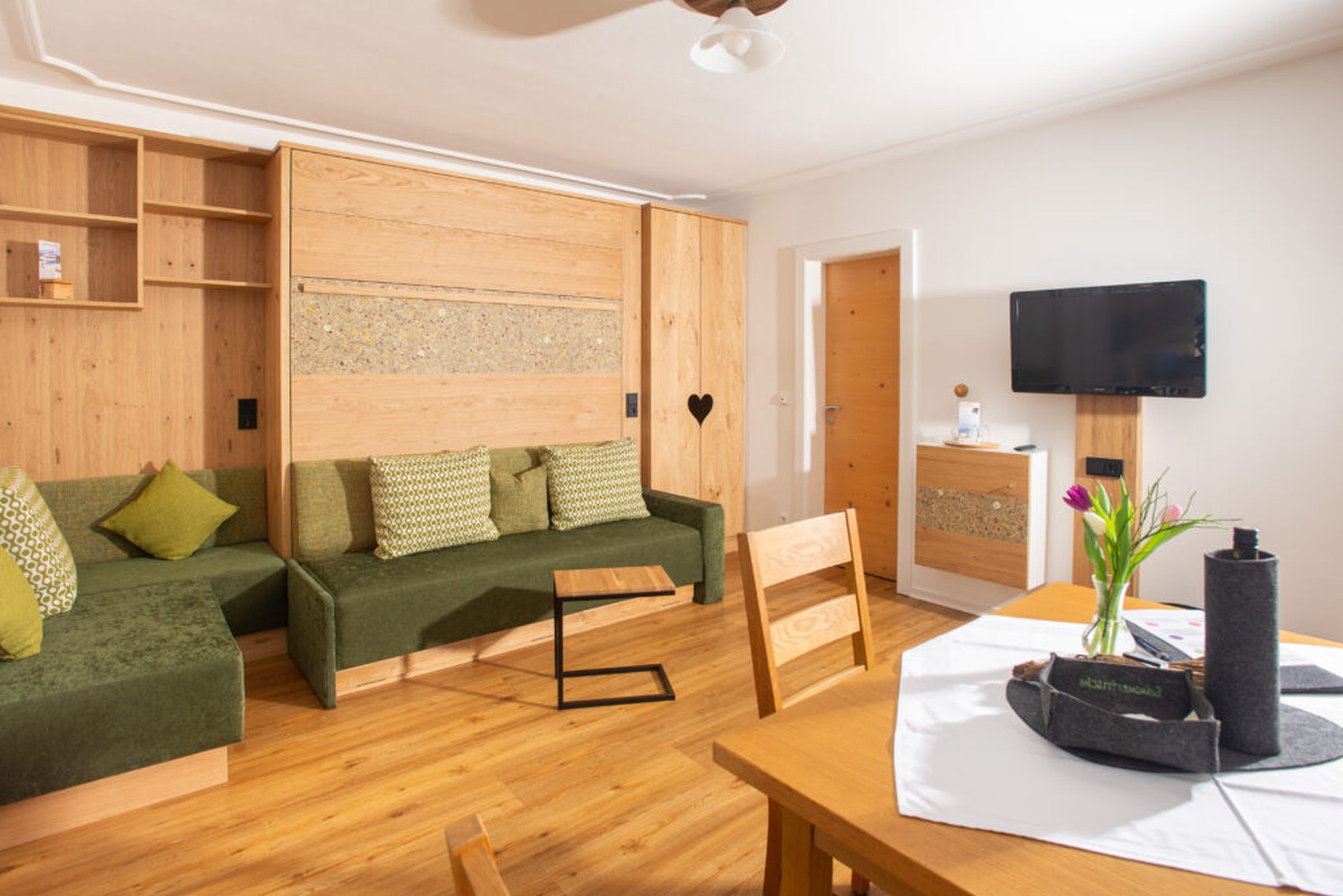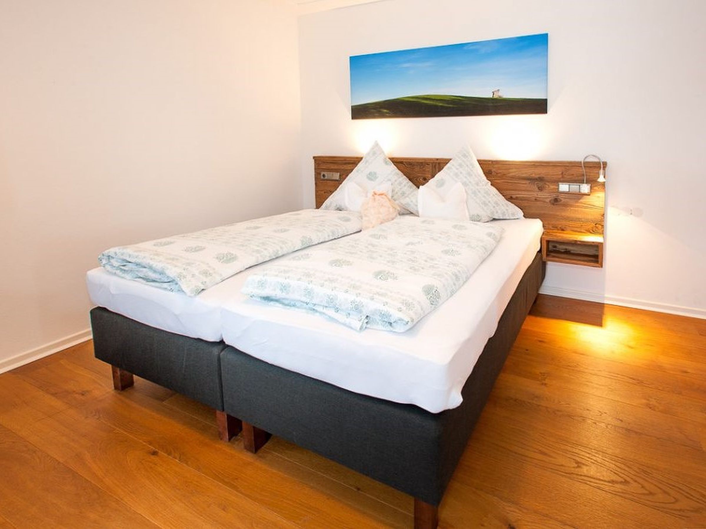 Gemütlich, bayerisch – modern – alpin eingerichtetes großes Apartment mit zwei komplett von einander getrennten Räumen. Schlafmöglichkeit bis zu sechs Personen. Jedes Zimmer ist von der mittendrin befindlichen Küche getrennt, hat ein eigenes Bad mit Dusche und WC. Ebenfalls gibt es in jedem Zimmer einen Flachbildschirm-TV. Großer Schrank mit Spiegel in Raumhöhe. Die Balkone im Osten und auch im Norden Richtung See und Dorf sind ausgestattet mit Tisch, Stühlen und einer Liege. Abdunkelbar mit Rollo. Insektenschutztüren und -gitter zur guten und ausreichenden Lüftung verbaut. Im Sommer wunderbar kühl – im Winter kuschelig und gemütlich warm.