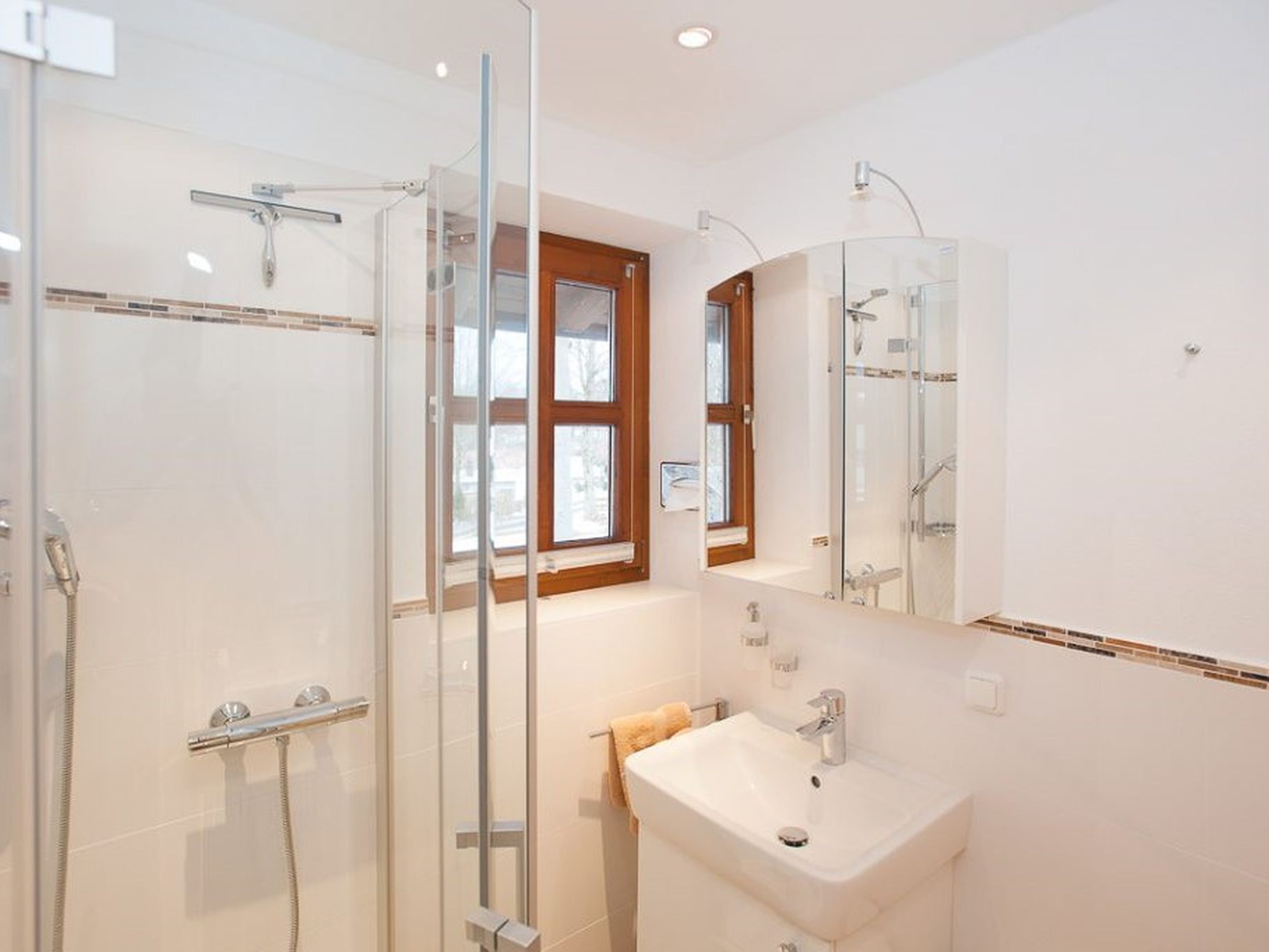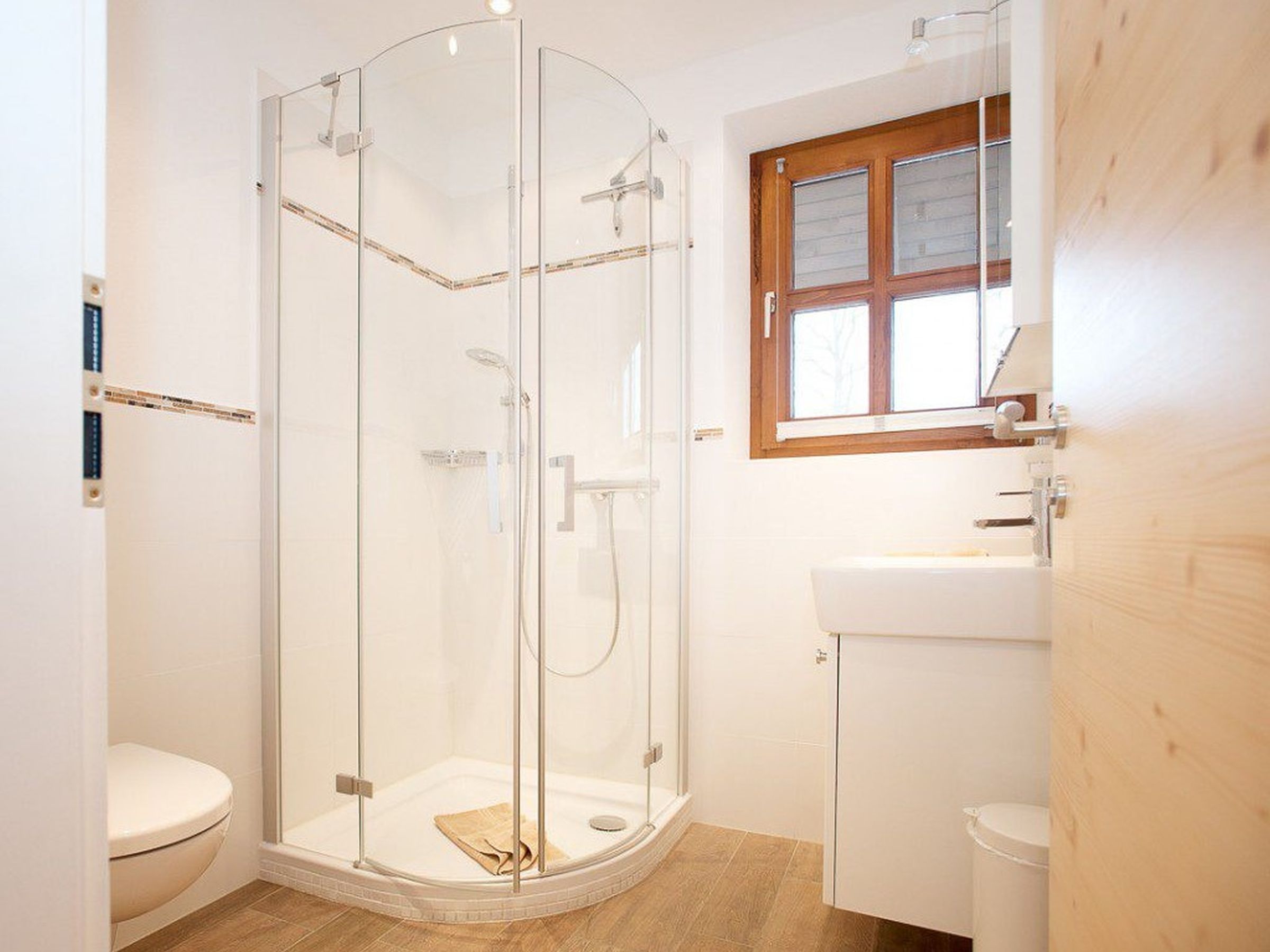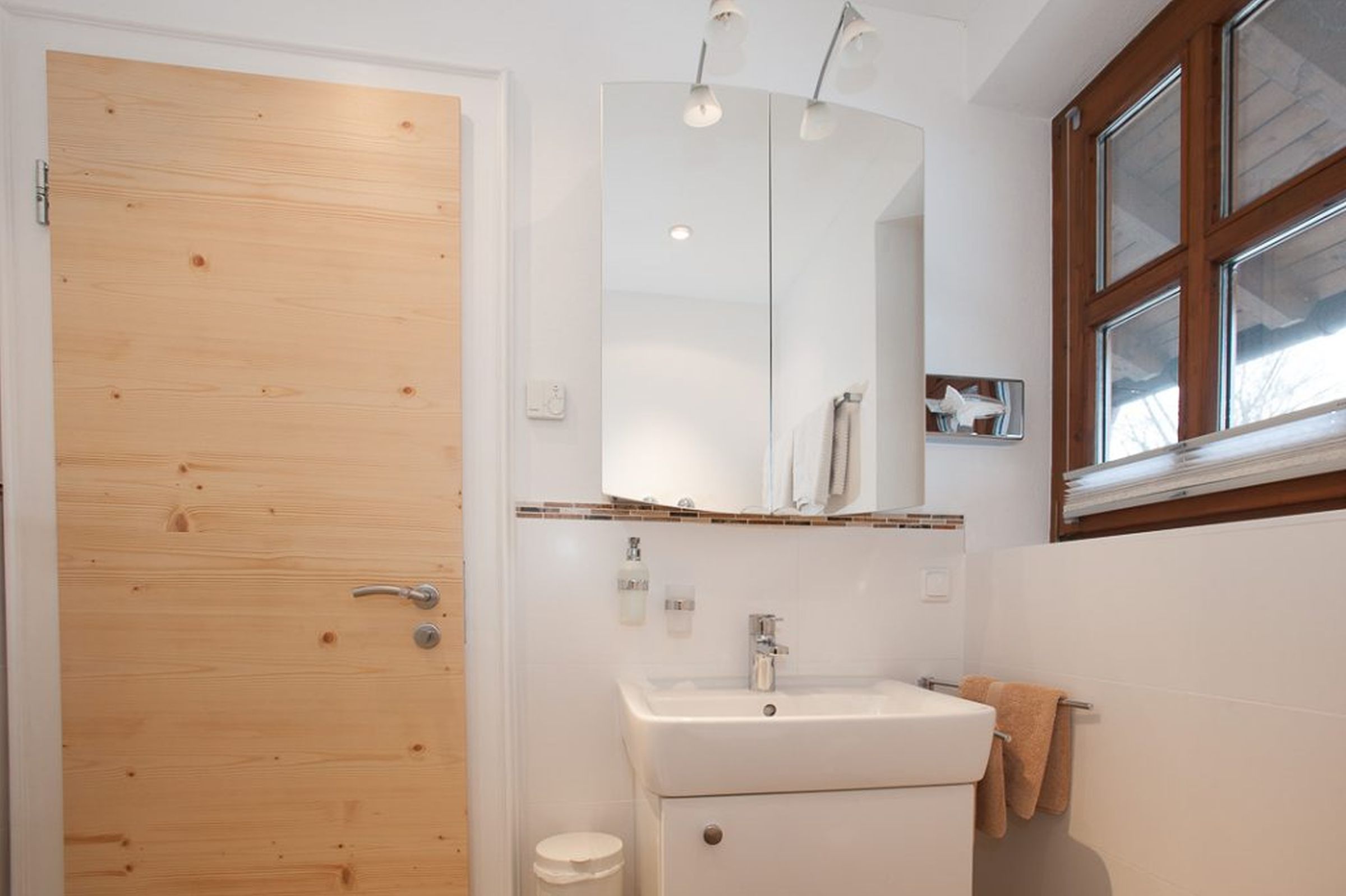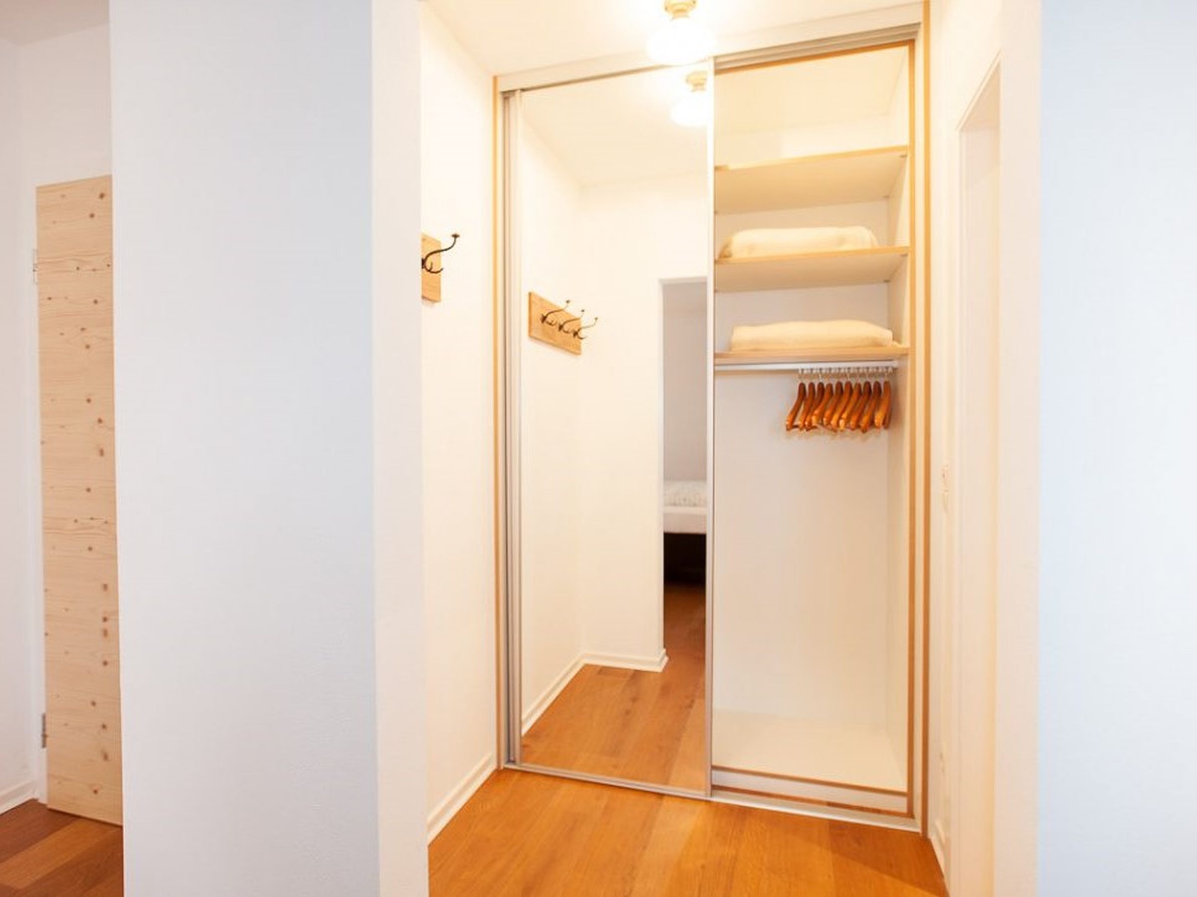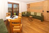 Gemütlich, bayerisch – modern – alpin eingerichtetes großes Apartment mit zwei komplett von einander getrennten Räumen. Schlafmöglichkeit bis zu sechs Personen. Jedes Zimmer ist von der mittendrin befindlichen Küche getrennt, hat ein eigenes Bad mit Dusche und WC. Ebenfalls gibt es in jedem Zimmer einen Flachbildschirm-TV. Großer Schrank mit Spiegel in Raumhöhe. Die Balkone im Osten und auch im Norden Richtung See und Dorf sind ausgestattet mit Tisch, Stühlen und einer Liege. Abdunkelbar mit Rollo. Insektenschutztüren und -gitter zur guten und ausreichenden Lüftung verbaut. Im Sommer wunderbar kühl – im Winter kuschelig und gemütlich warm.