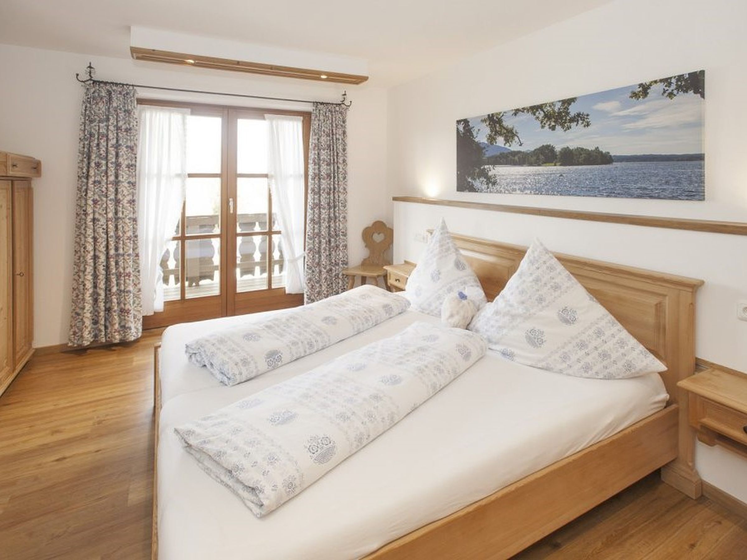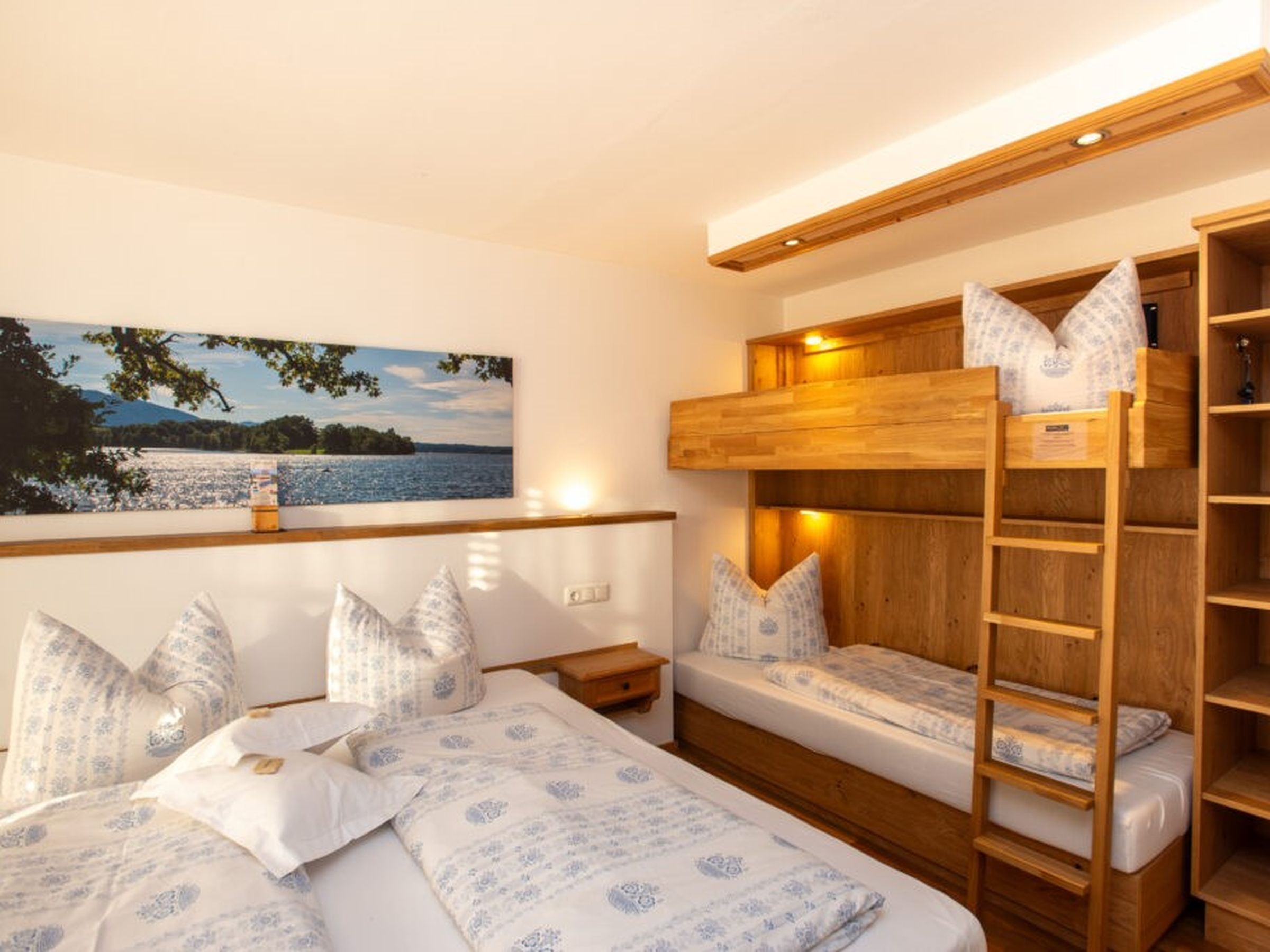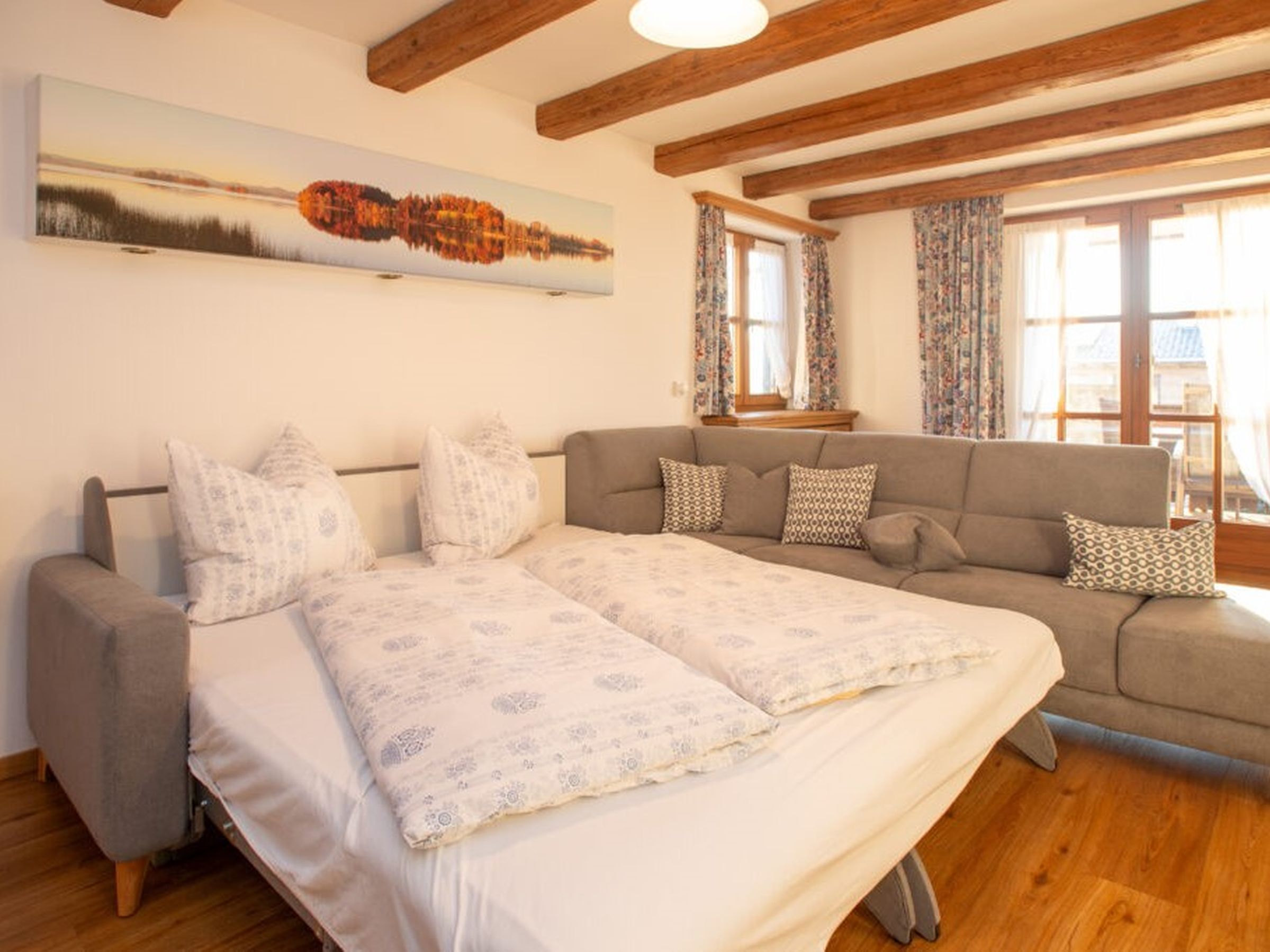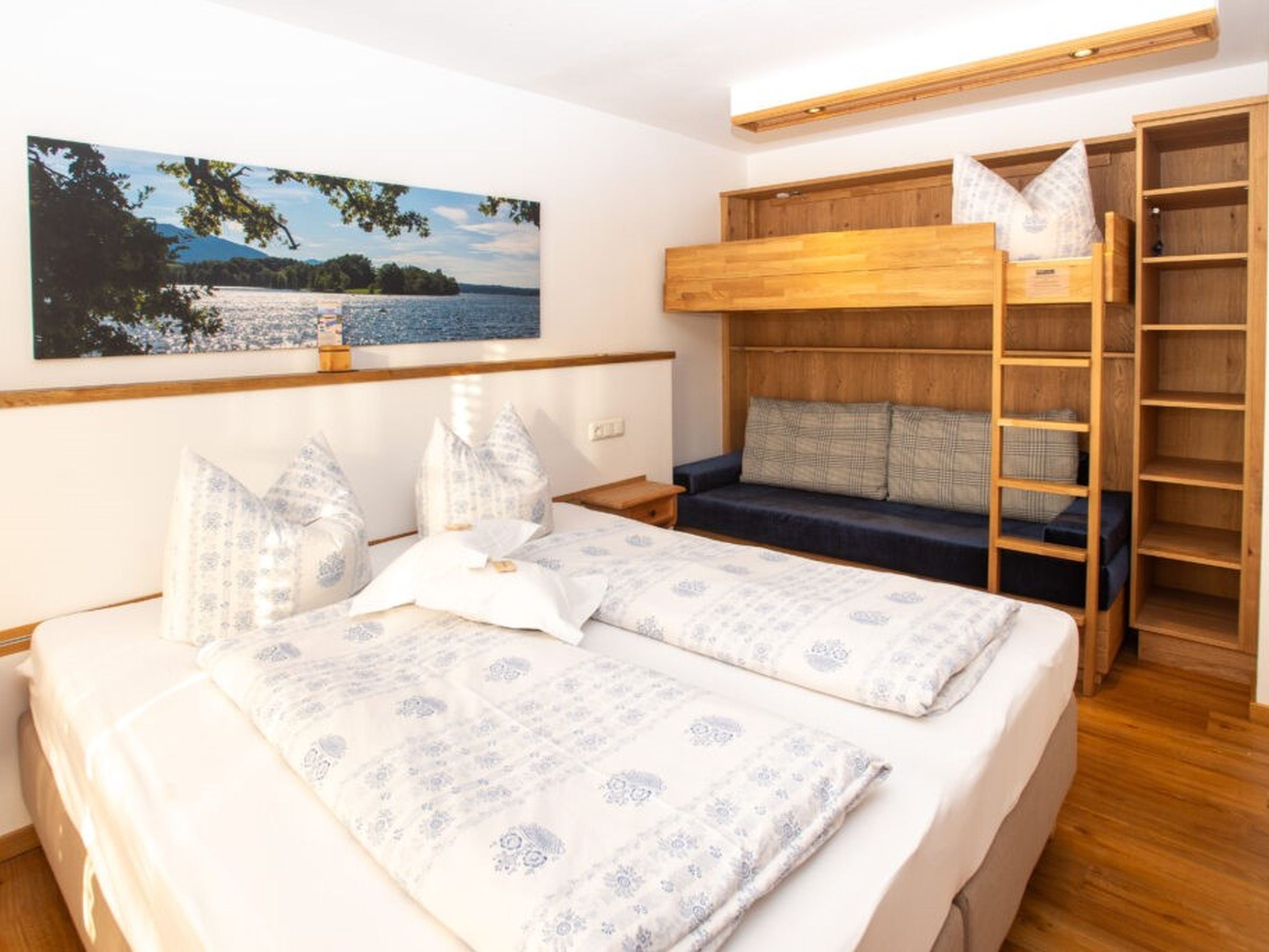 Eine unserer beiden größeren Ferienwohnungen – Die Insel Wörth – viel Platz bei Belegung mit bis maximal 8 Personen. Ein traumhafte innenliegenden Balkon mit herrlichem Bergblick ausreichend Sitzgelegenheiten und großem Tisch. Sonnenschirm vorhanden. Kamin-Ofen mit Einsatz für gemütliche Stunden am Kaminfeuer. Gemütlicher Eßerker mit zusätzlicher elektrischer Fußbodenheizung in diesem Bereich. Modernes Bad-Dusche, getrenntes WC. Die Küche ist komplett ausgestattet. Zwei separate Schlafzimmer. Ein Doppelbett mit Lattenrost. Im zweiten SZ Boxspringbetten auch auseinanderstellbar. Die zusätzlichen Schlafgelegenheiten sind im Wohnraum auf der Ausziehcouch, bzw. auch einzeln auf einem Ausziehstuhl, je mit Topper ausgestattet. Insektenschutztüren und -gitter für ausreichende Durchlüftungsmöglichkeit vorhanden. Ebenso sind die Räume gut abdunkelbar. Flachbild TV. Telefon zur freien Nutzung.