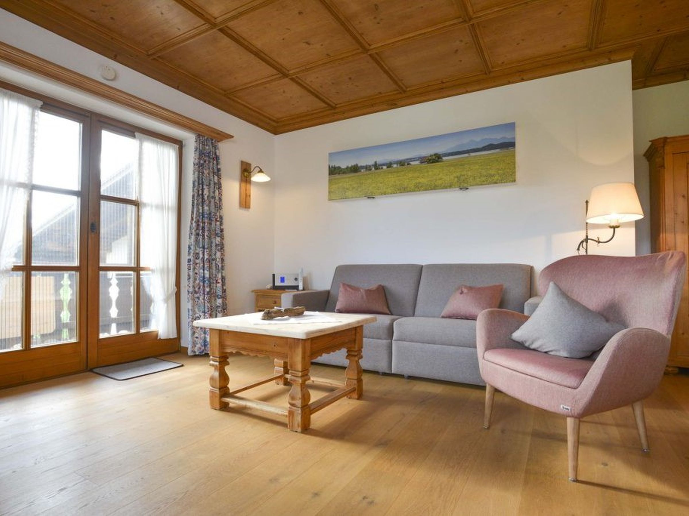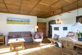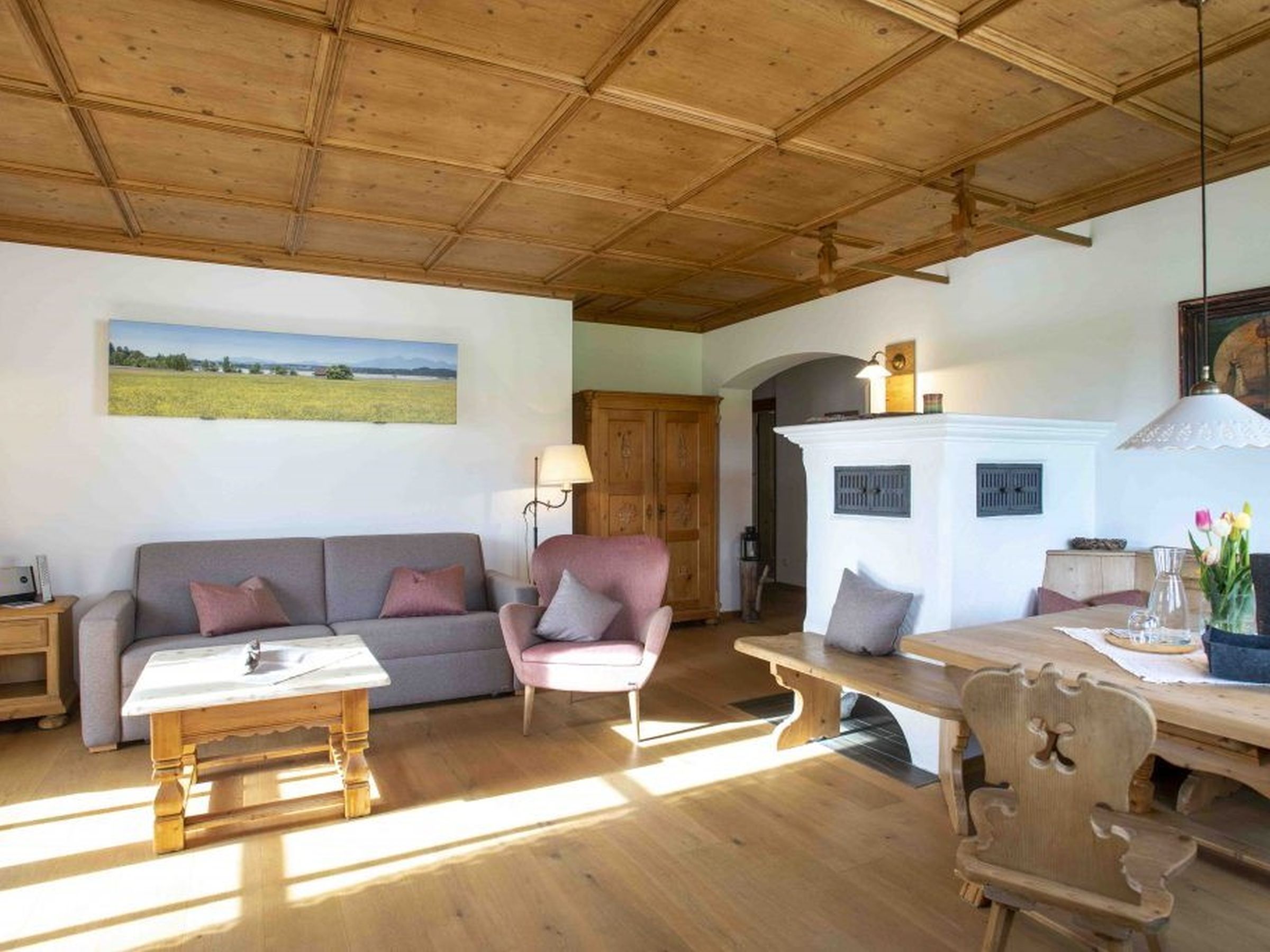 Unsere kleinere Ferienwohnung – Die Jakobsinsel – Die Wohnung mit dem Traumblick auf das Voralpenland und den Staffelsee. Wohnraum und Schlafraum mit Eichen-Holz-Boden. Belegung mit bis zu 4 Personen. Schlafzimmer mit Boxspringbetten (auch auseinanderstellbar). Doppelschlafcouch (200 x 180 mit Topper) im Wohnraum für zwei zusätzliche Schlafplätze. Für die gemütlich, warmen Stunden können Sie gerne den Kachelofen beheizen – ein Traum zu den kalten Jahreszeiten. Balkon mit Blick auf die Berge und den Staffelsee. Stühle und Tisch auf dem Balkon, ebenso ein Sonnenschirm. Komplett ausgestattete Küche. Bad/WC mit großer gut zugänglicher Dusche…mit Dachfenster…duschen unter dem Sternenhimmel im Blauen Land.