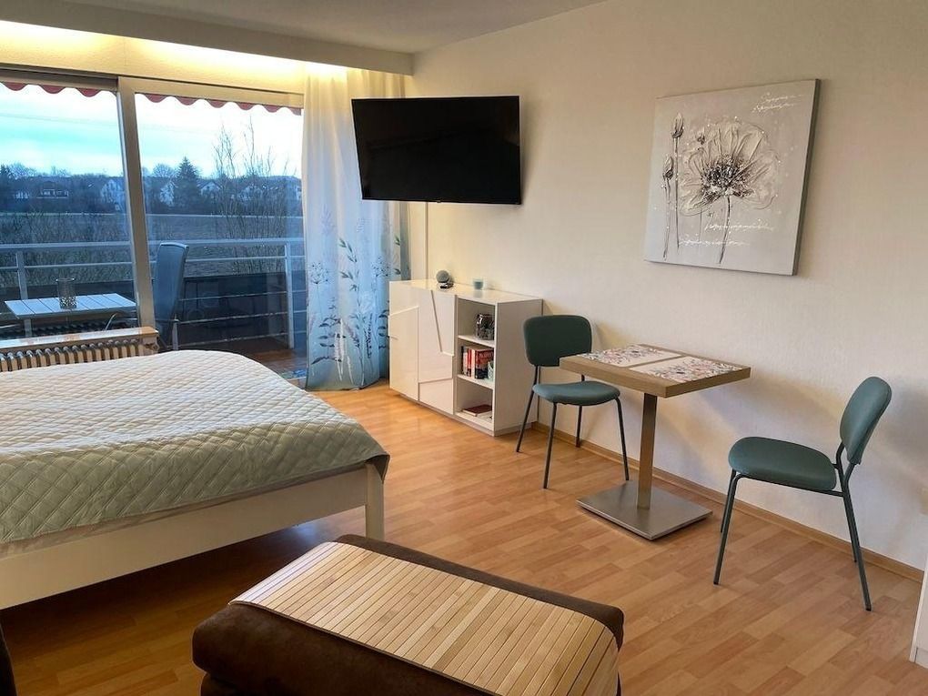 Der großzügige Wohn-/Schlafraum beherbergt ein Doppelbett (kein Schrankbett), einen Schrank, Kommode mit TV, eine gemütliche Couch mit Tisch und natürlich einen Essplatz. Die Wohnung wird ergänzt durch eine kleine Küche und ein gerade neu renoviertes Duschbad.