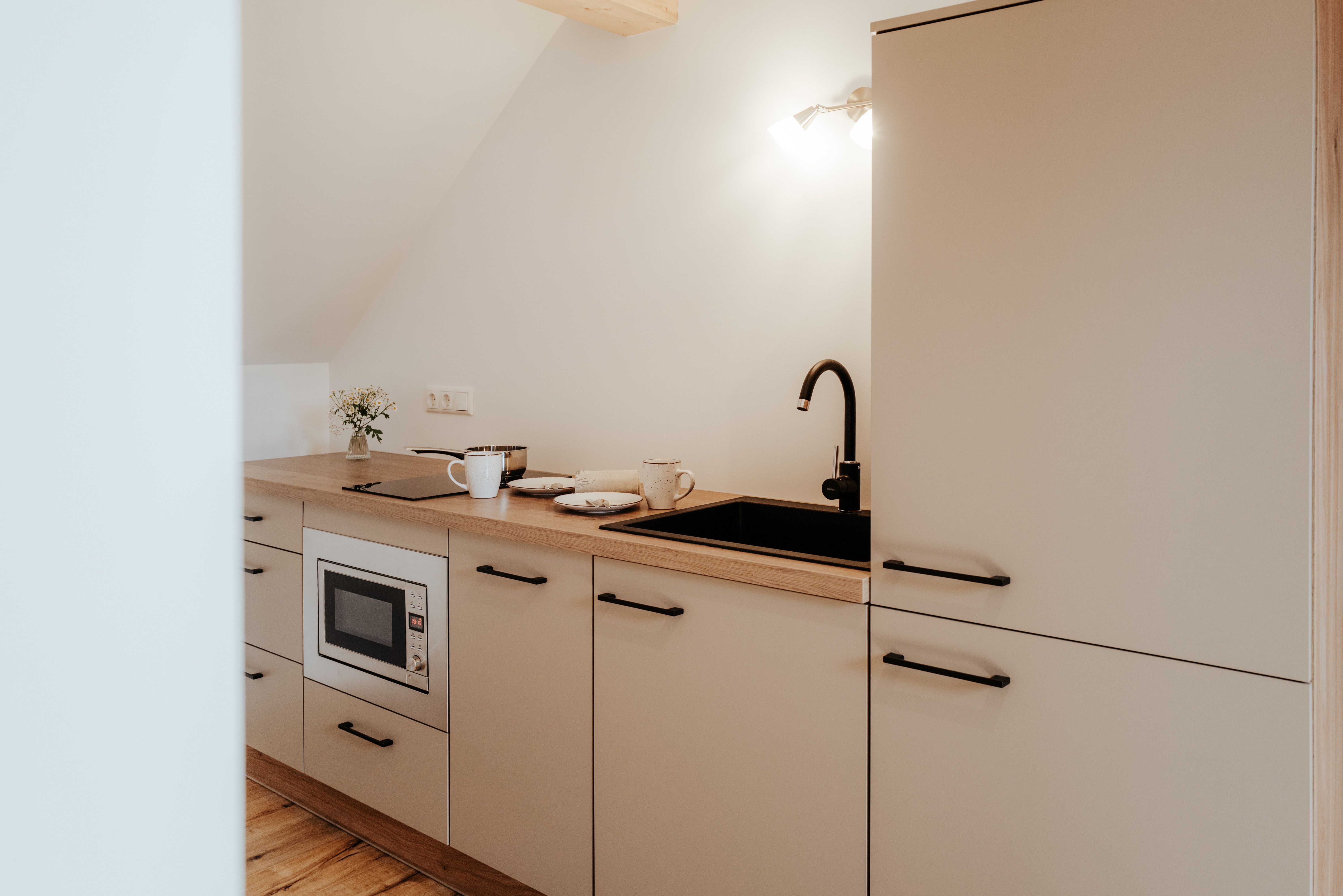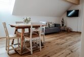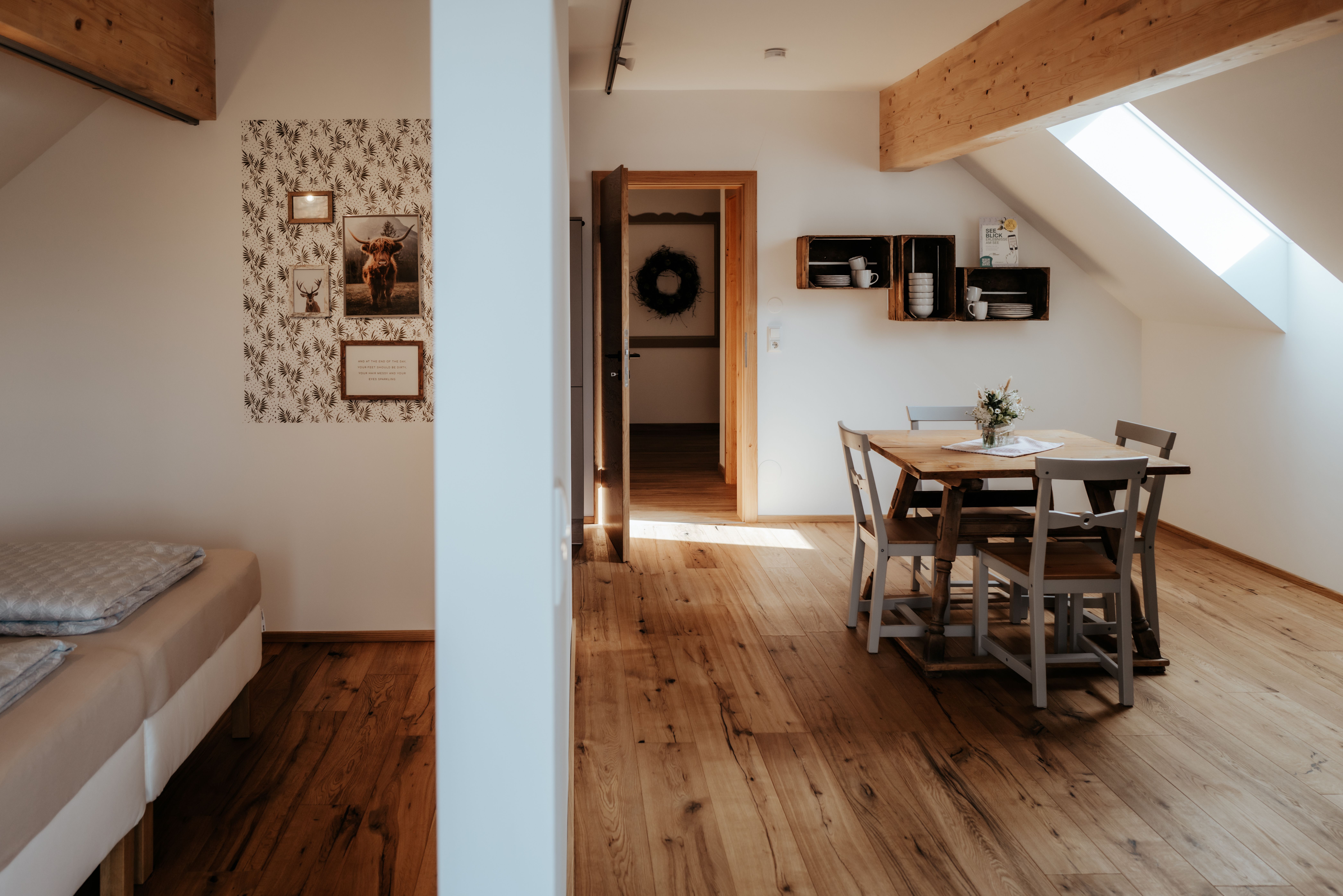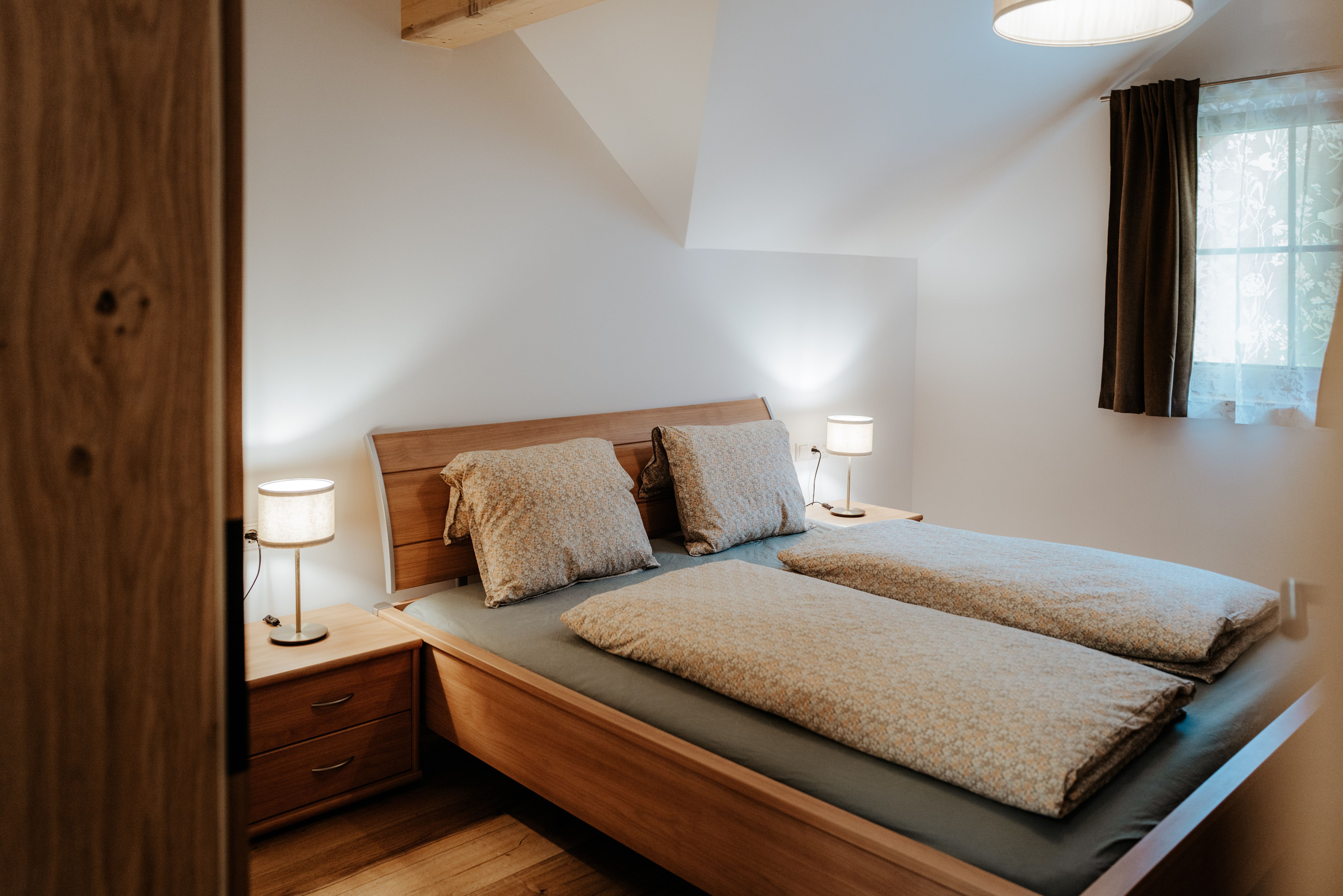 Die Ferienwohnung Abendsonne verfügt über einen Wohn- & Schlafbereich mit Doppelbett und ein extra Schlafzimmer mit Doppelbett.