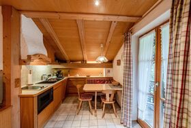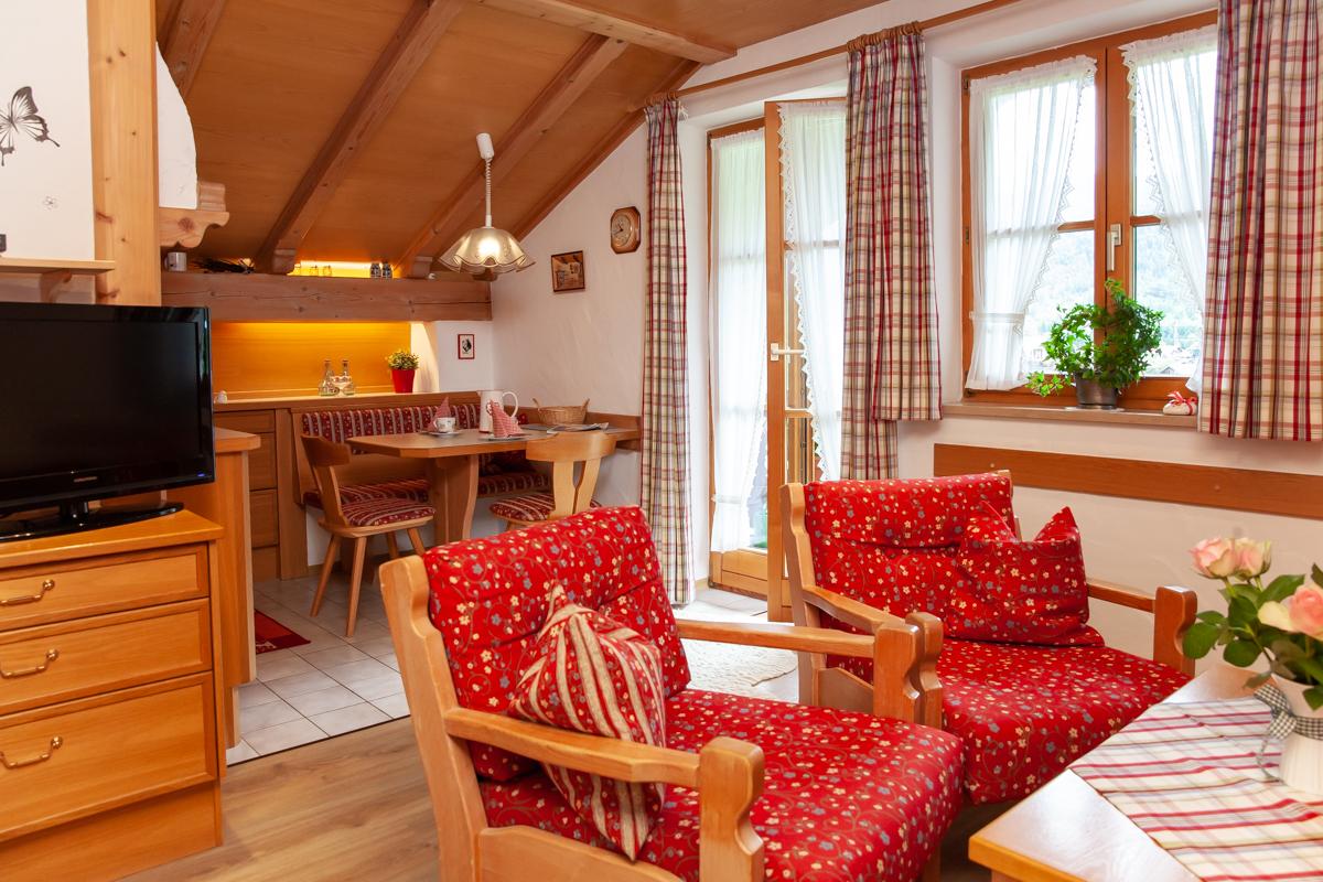 Gemütliches Wohnzimmer mit Couch (komfortable Bettcouch), zwei Sessel, Kabel-Flachbild-TV, CD-Player, Radio. Küchenzeile mit 2-Platten-Herd, Mikrowelle-Heißluft-Ofen, Kaffeemaschine, Wasserkocher, Toaster und Kühlschrank mit Gefrierfach. Essplatz mit Bank und zwei Stühlen.