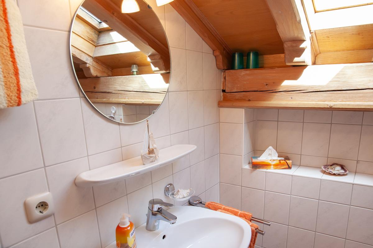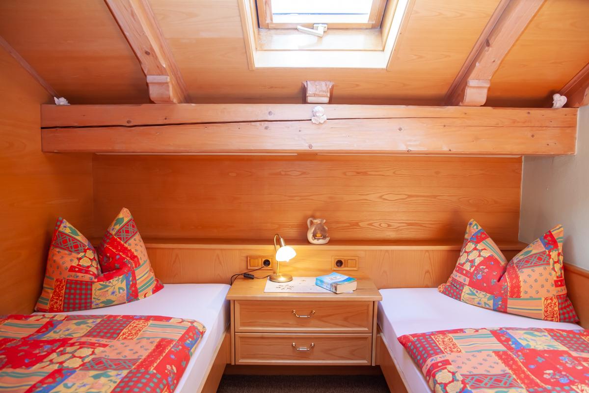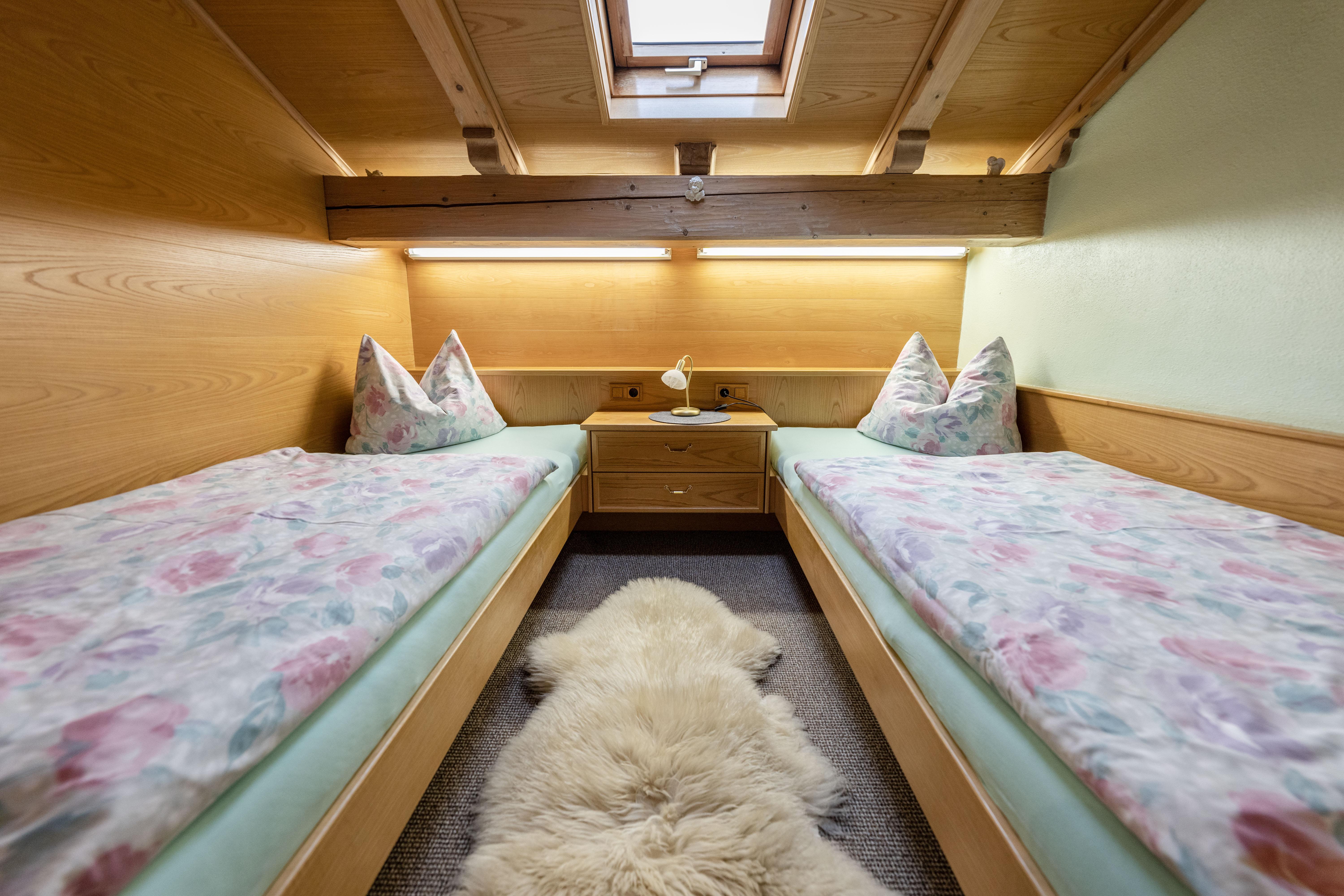 Schlafzimmer mit zwei Einzelbetten. Bad mit Duschkabine, Waschbecken, WC und Fön.