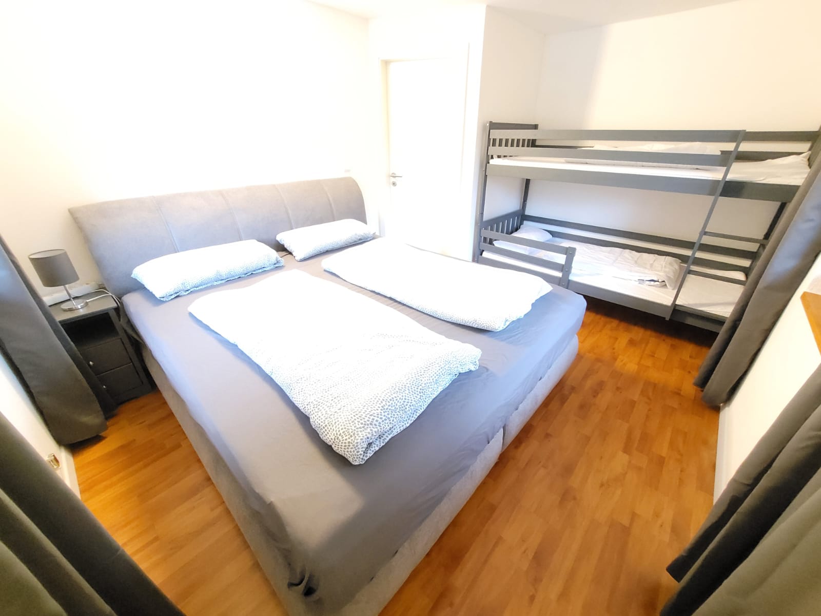 Das Schlafzimmer ist mit einem komfortablen Doppelbett ausgestattet, während das zweite Bett in Form eines praktischen Stockbetts Platz für zwei Personen bietet – ideal für Familien oder Freunde.