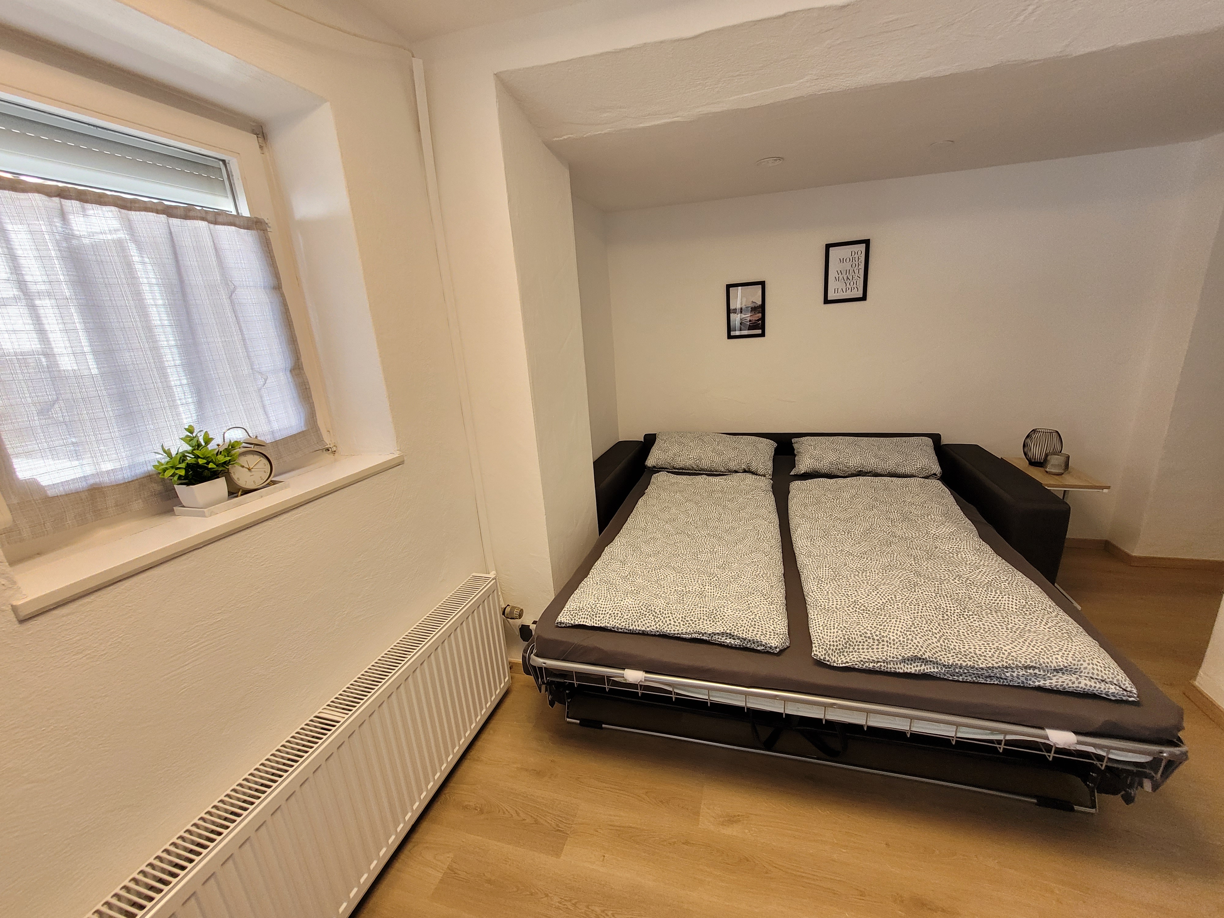 Es bietet einen ruhigen Rückzugsort, ideal für eine erholsame Nacht. Das Sofa im Wohnzimmer kann bei Bedarf ebenfalls als Schlafmöglichkeit genutzt werden, sodass insgesamt zwei Schlafplätze zur Verfügung stehen.