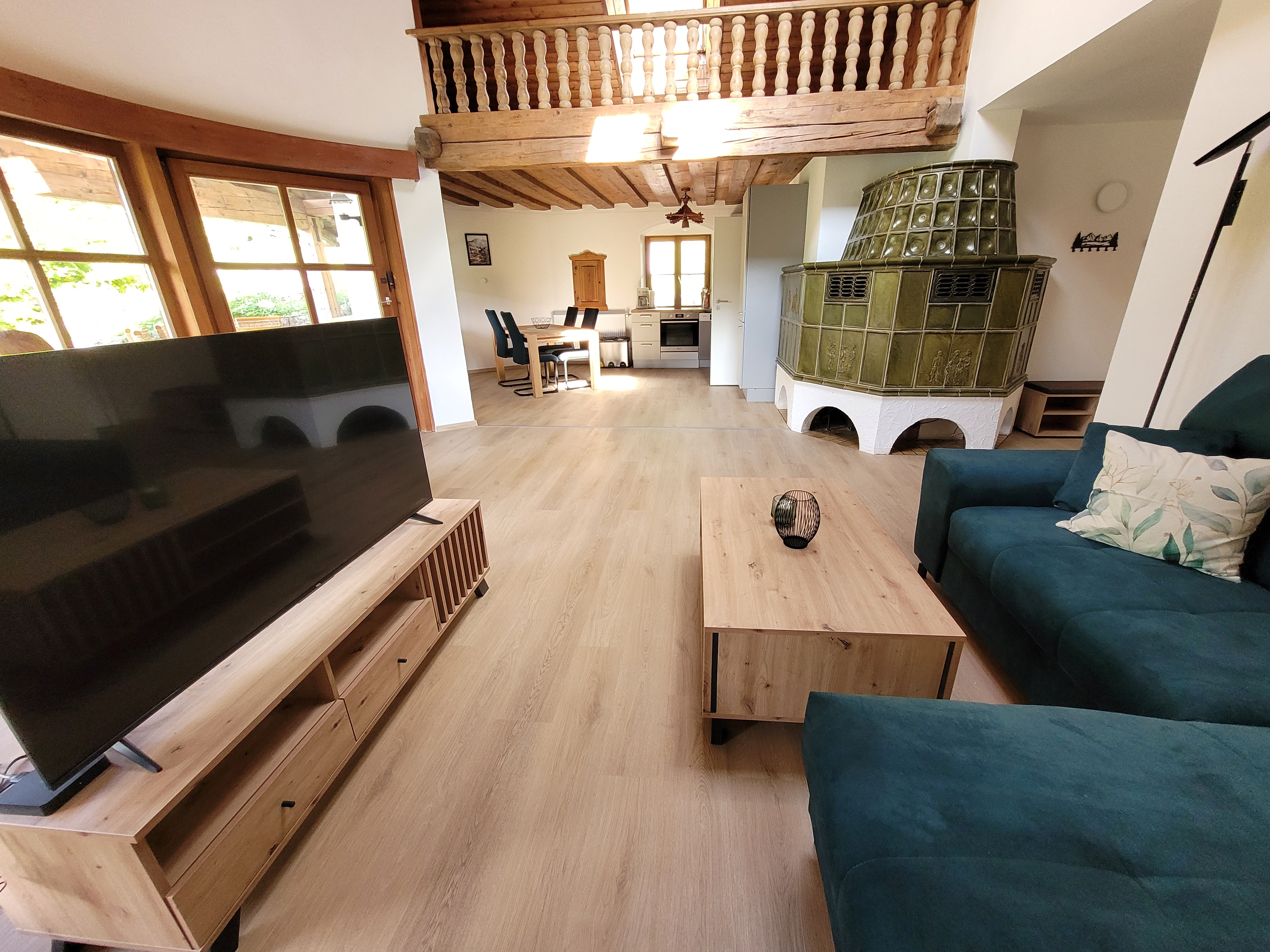 Das Wohnzimmer besticht durch einen historischen Kachelofen, der für eine gemütliche Atmosphäre sorgt. Ein Sofa im Wohnzimmer kann bei Bedarf als Schlafsofa ausgezogen werden und bietet somit zwei zusätzliche Schlafplätze. Hier können Sie entspannte Abende verbringen und die besondere Atmosphäre genießen.