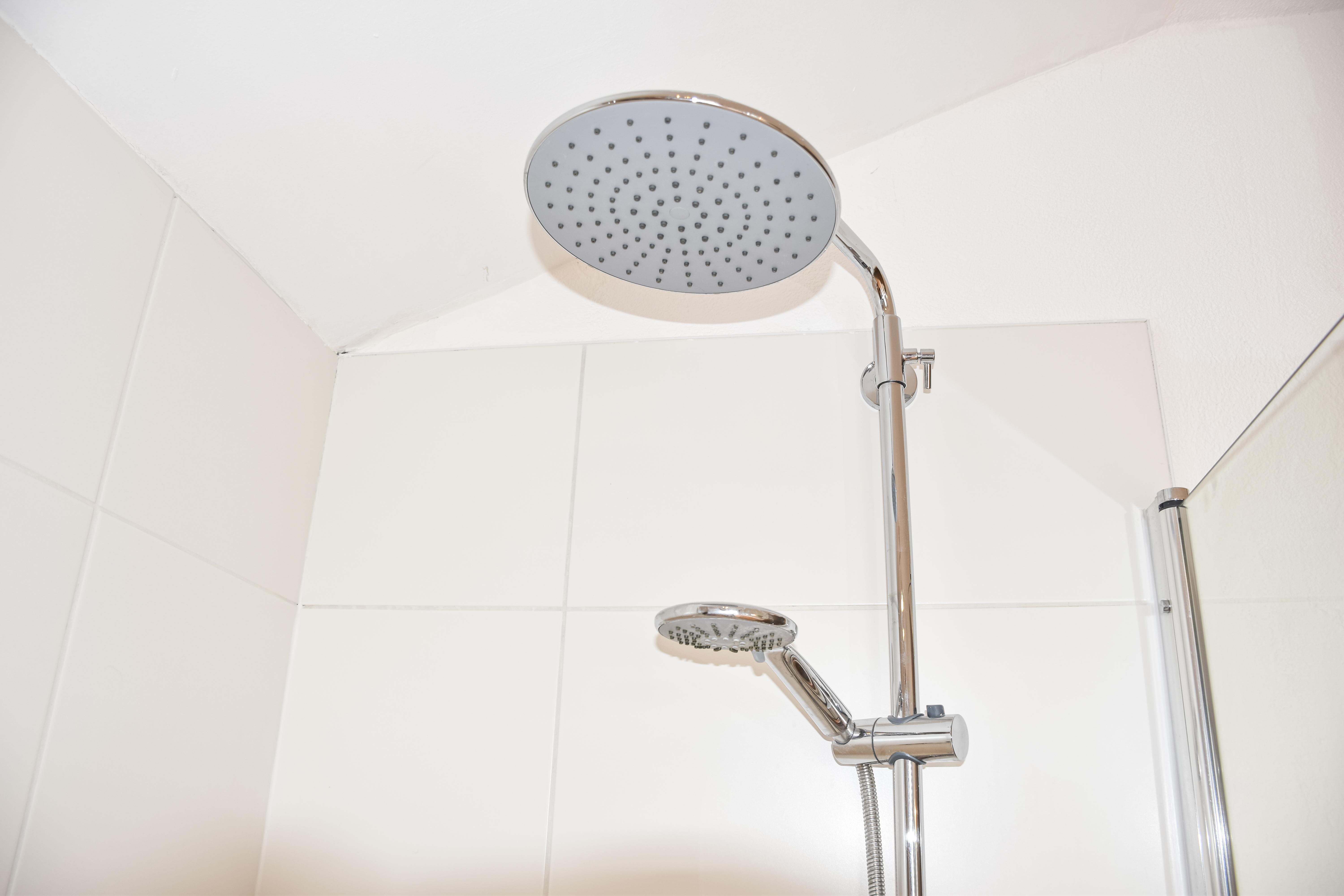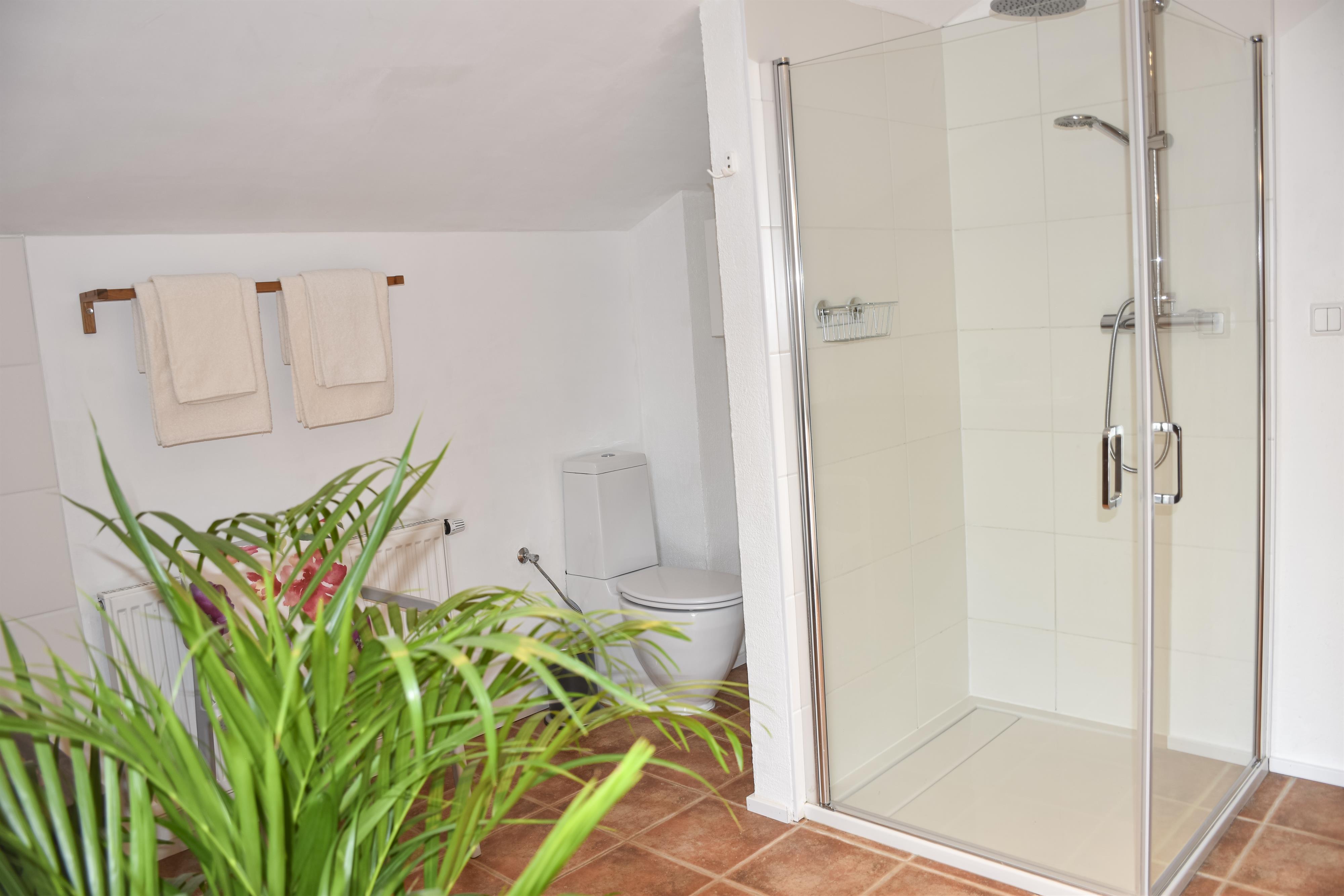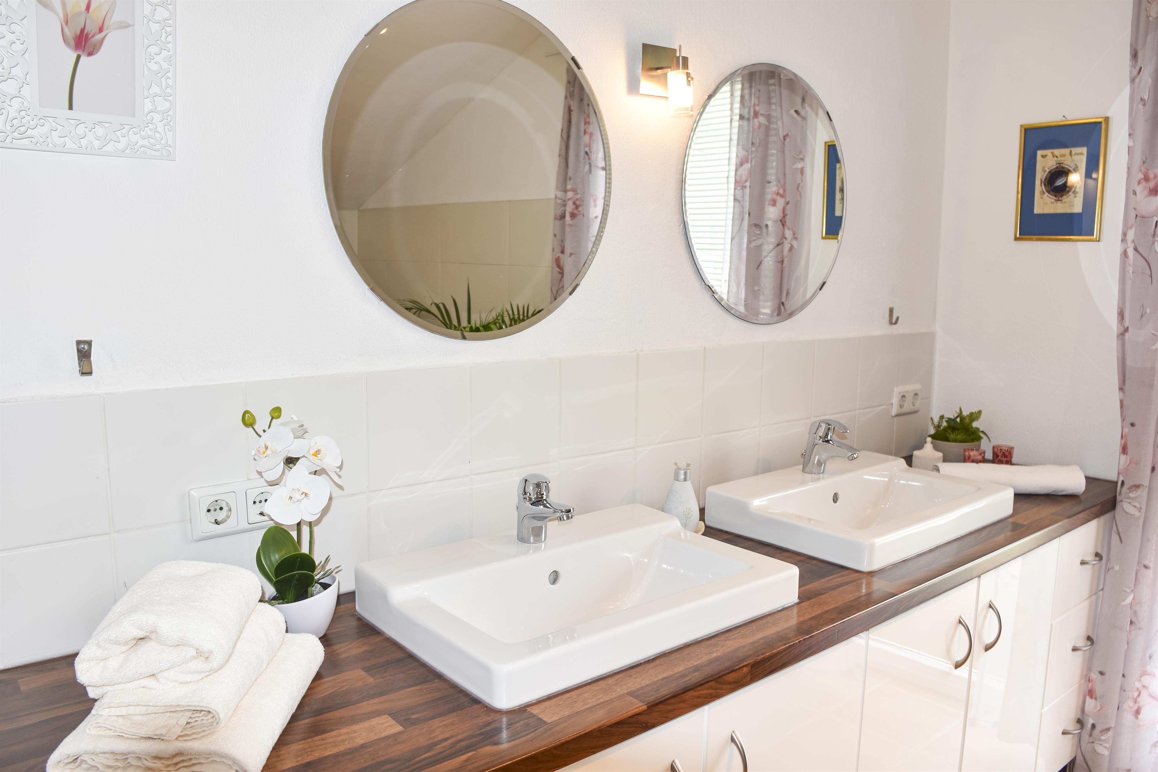 Badezimmer: WC, 2 Waschbecken, Duschkabine mit Regenduschkopf