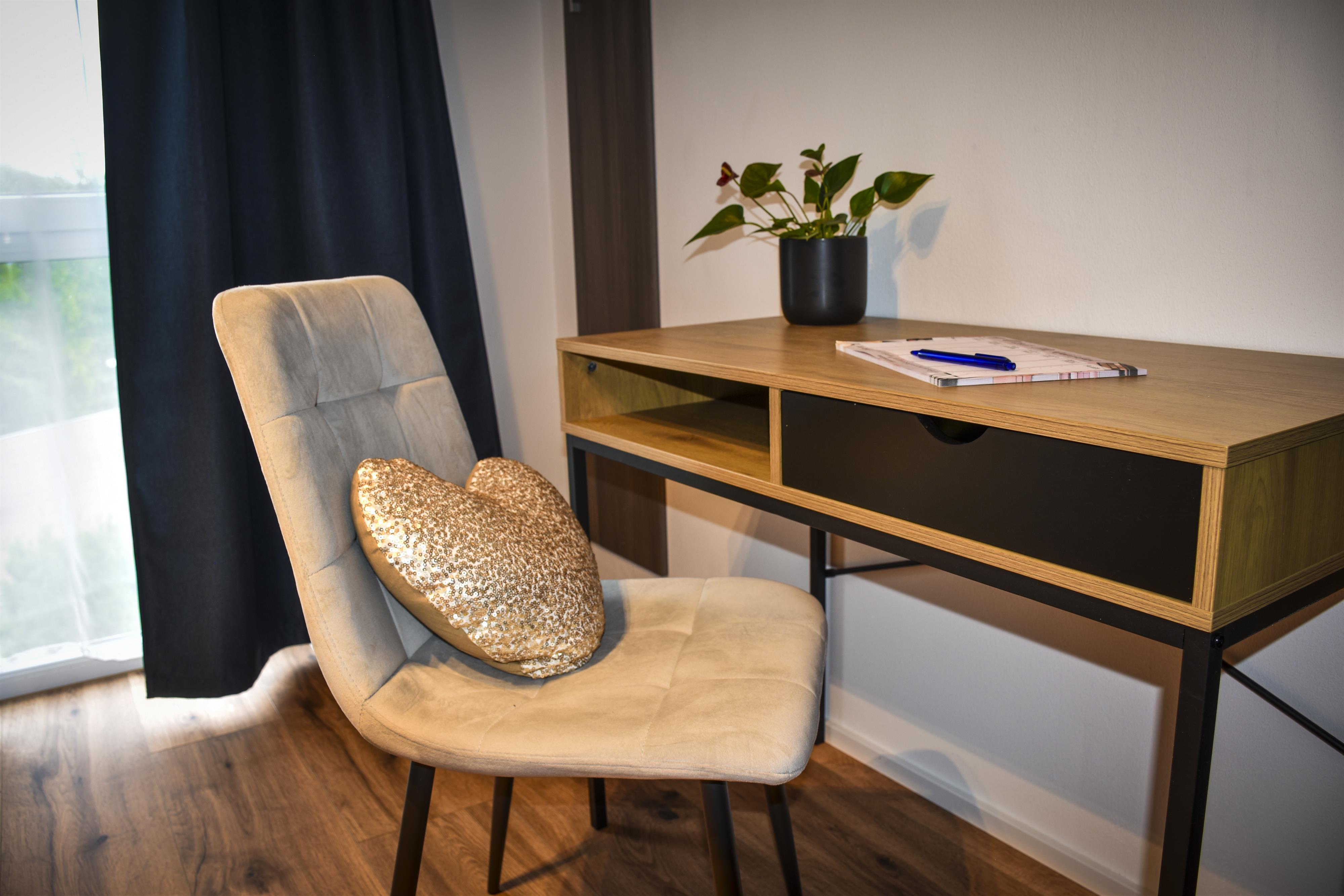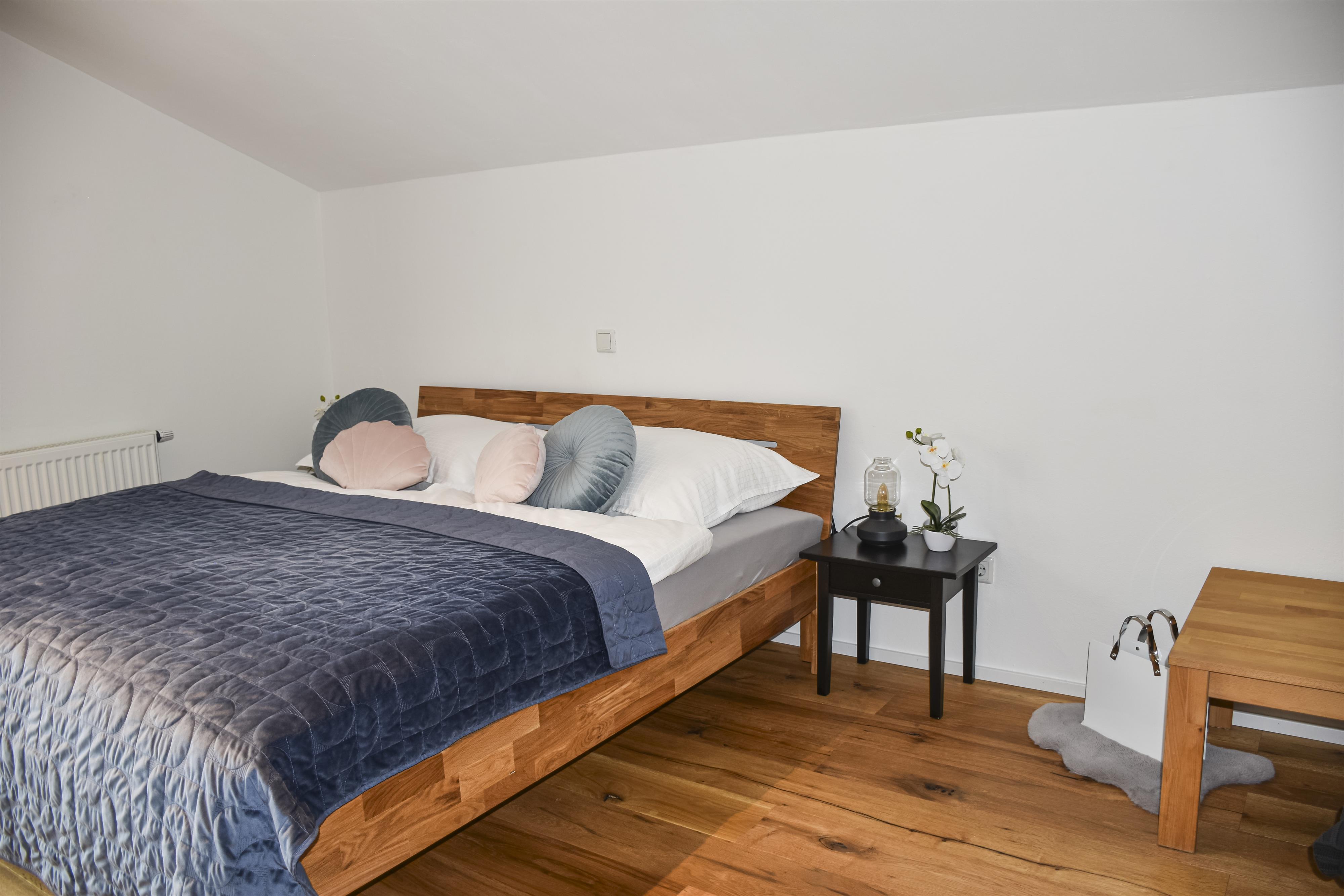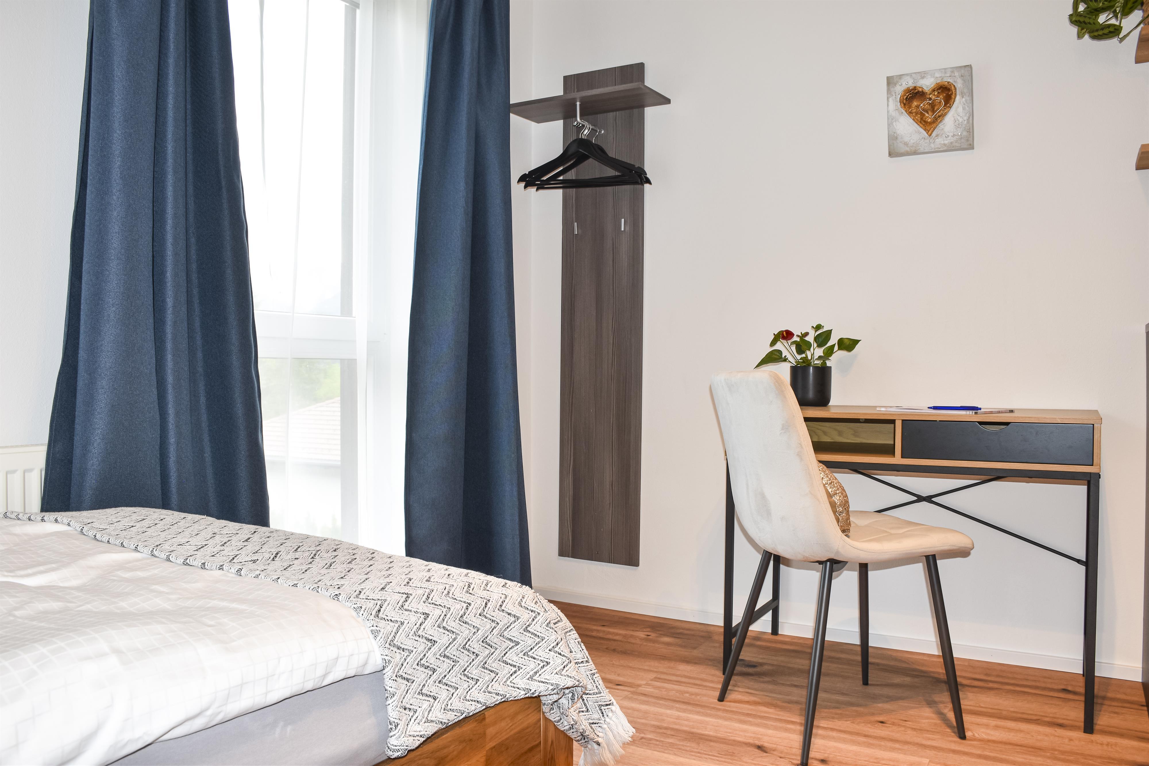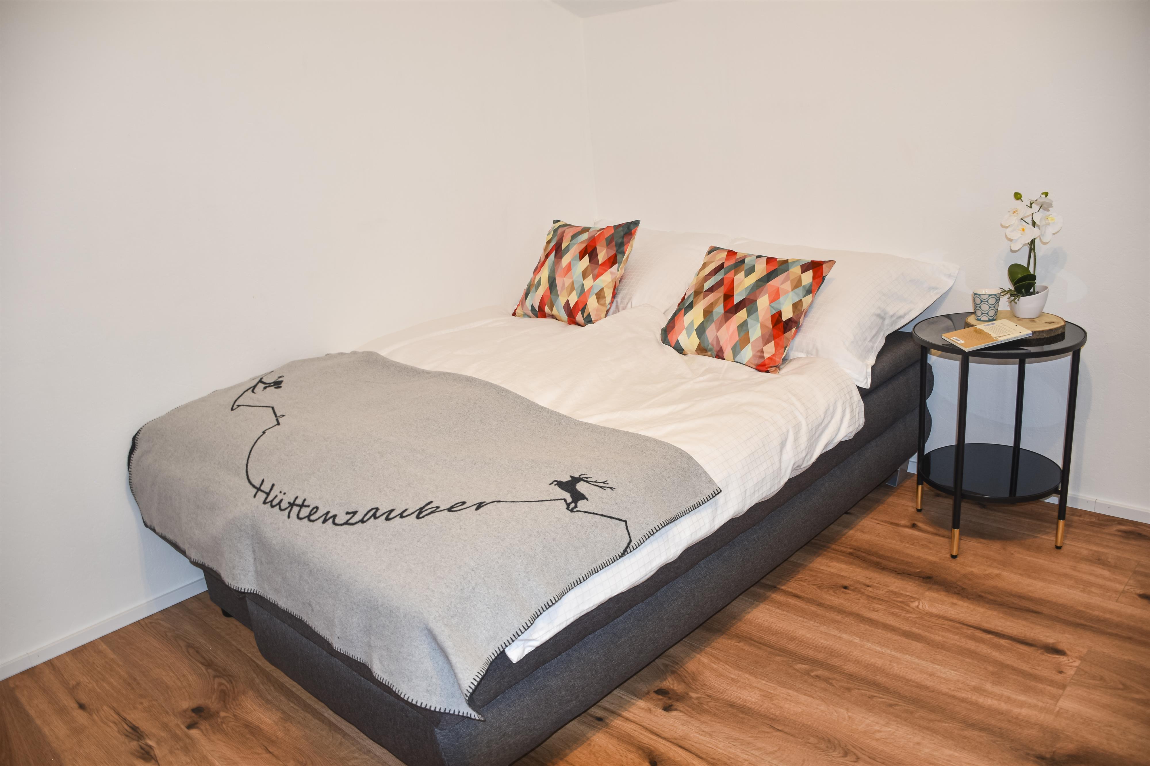 Das 1. Schlafzimmer ist mit Doppelbett, Schrank, Arbeitsplatz und einer Couch ausgestattet.
