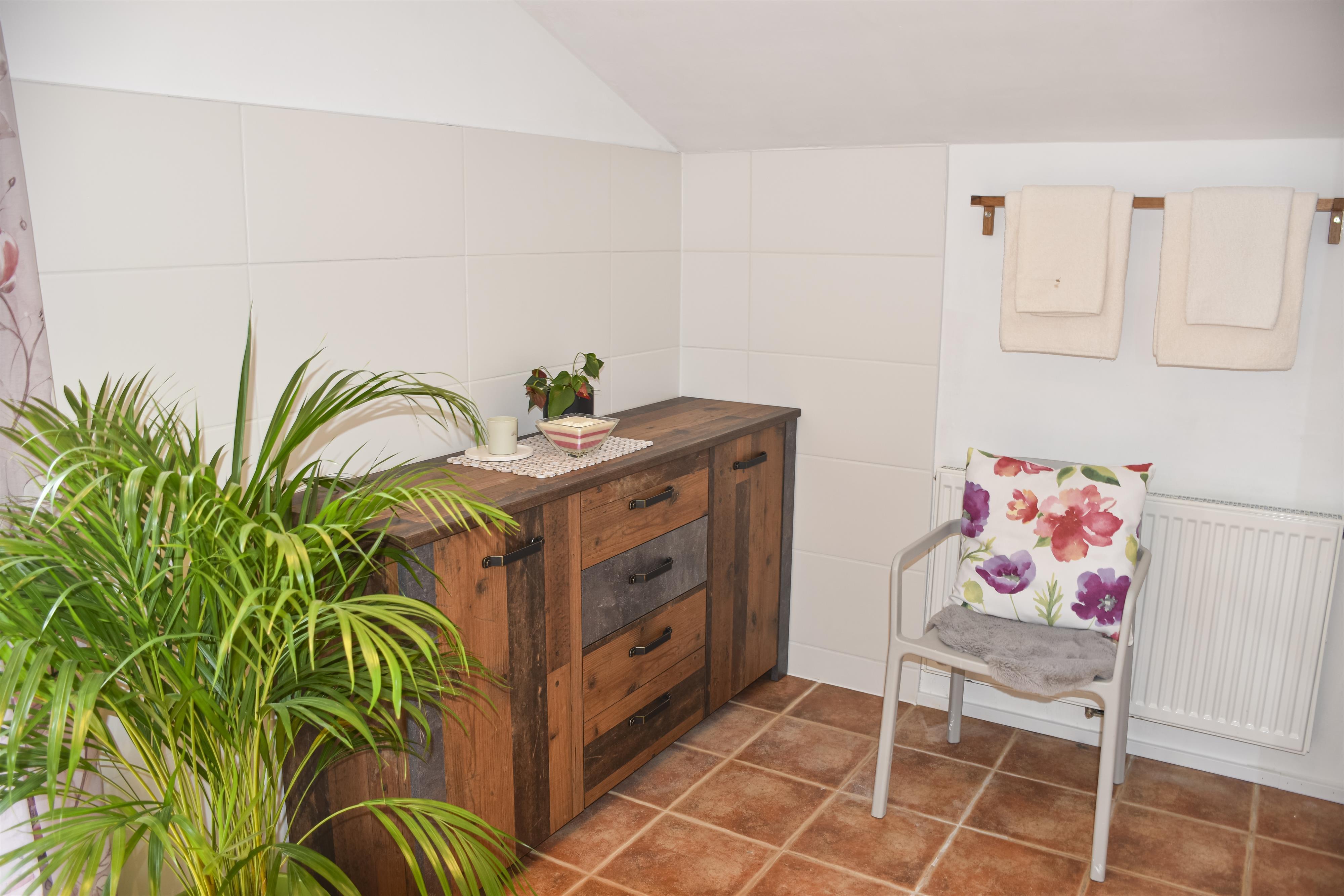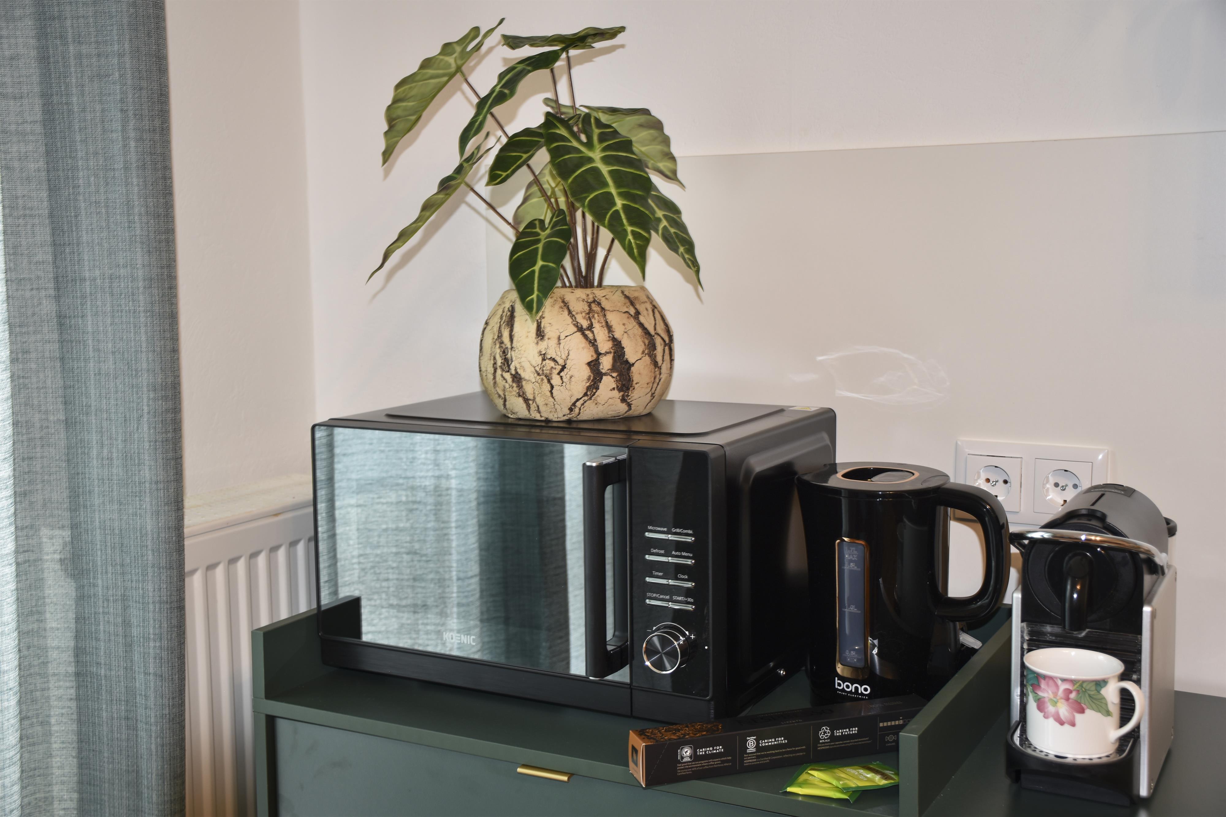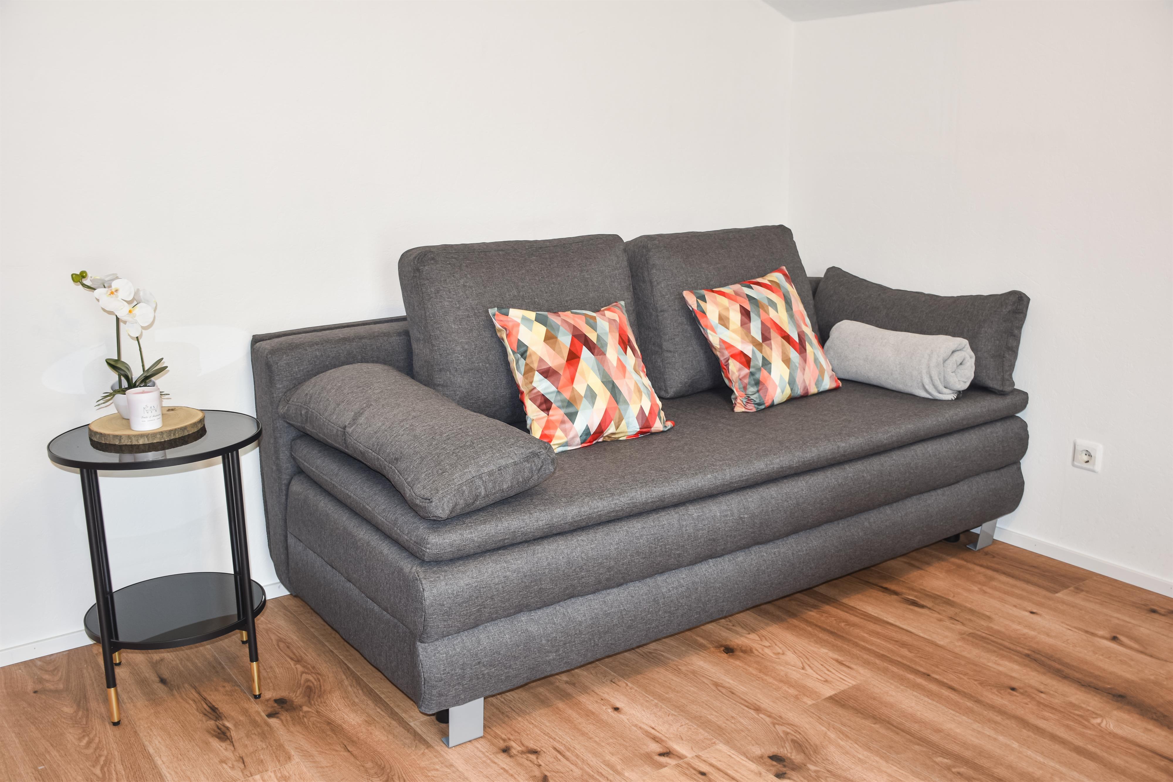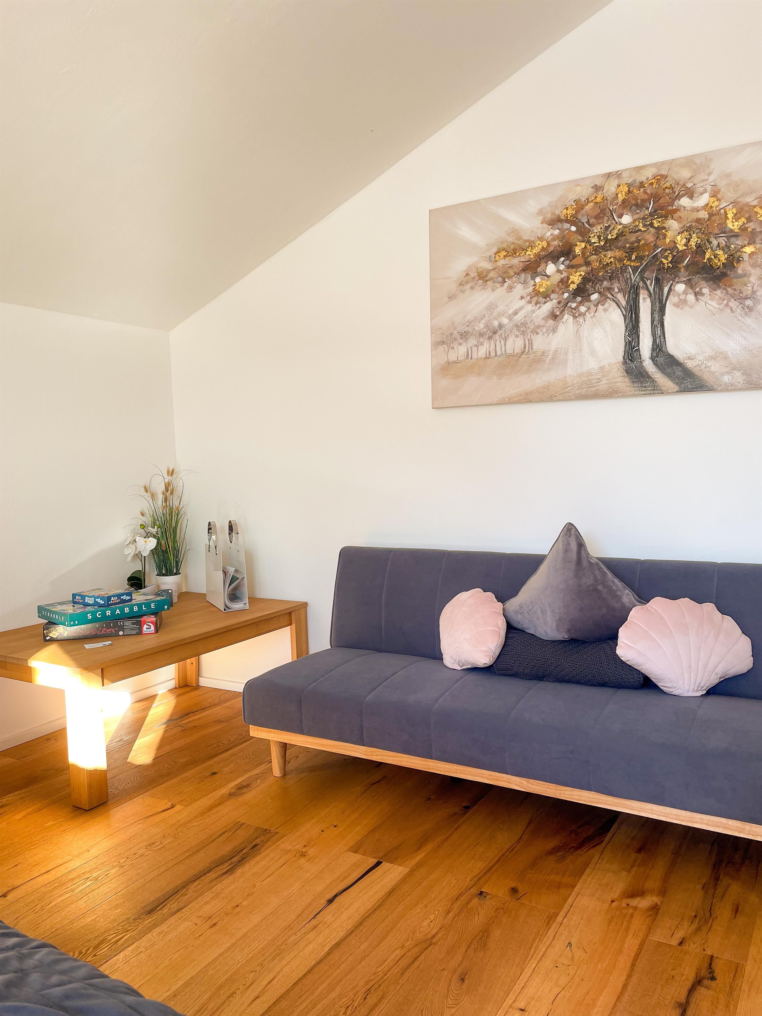 Küche/Wohnzimmer: Voll ausgestattete Küchenzeile: zwei Herdplatten, Kühlschrank mit Gefrierfach, Mikrowelle, Wasserkocher, Toaster und Nespresso-Kaffeemaschine. Ausziehbare Couch mit Schlafmöglichkeit für 2 weitere Personen.