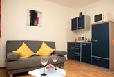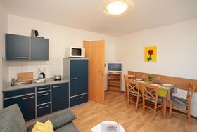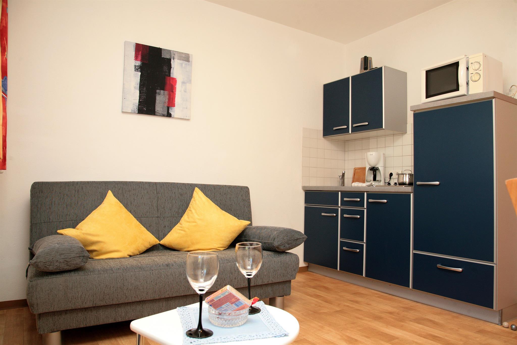 Ferienwohnung für 2-3 Personen,oder 2 Ew. und 2 Ki. 38 m², Vorraum, 1 Schlafzimmer, Safe, Wohnküche mit Schlafcouch 140 mal 200, Eßtisch, 2 Plattenherd, Mikrowelle mit Grill,Toaster, Bad und WC, Balkon, Kabel TV , gratis Internet Wireless LAN,