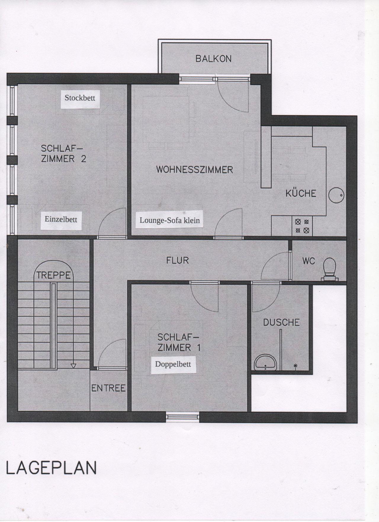 Die Ferienwohnung verfügt über ein Doppelbettzimmer und ein Dreibettzimmer (Stockbett und Einzelbett).