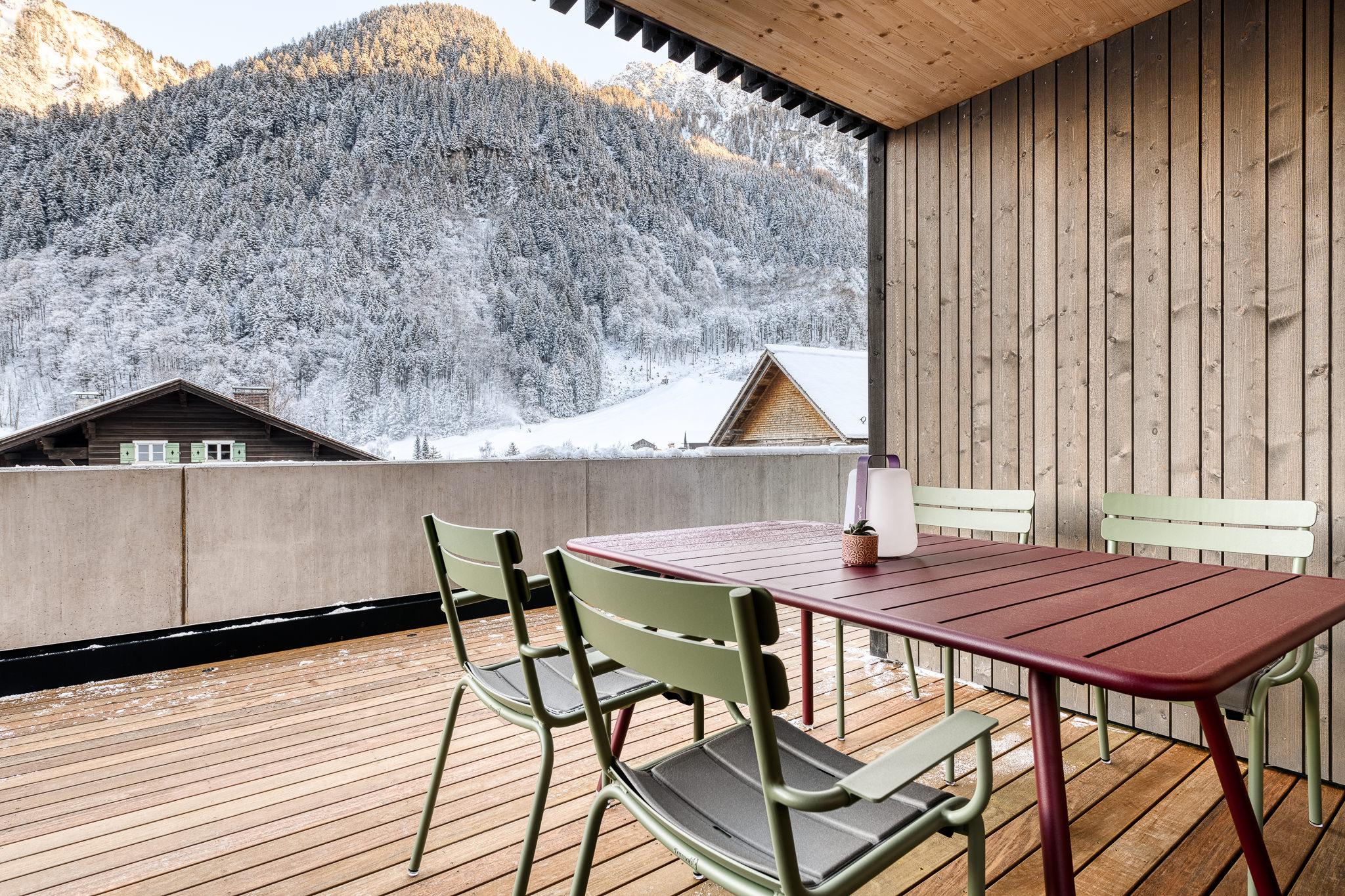 Die tiefe und sehr großzügige Terrasse nach SW garantiert - sofern es die mächtigen Gipfel des Rätikons erlauben - immer für Sonne.