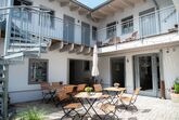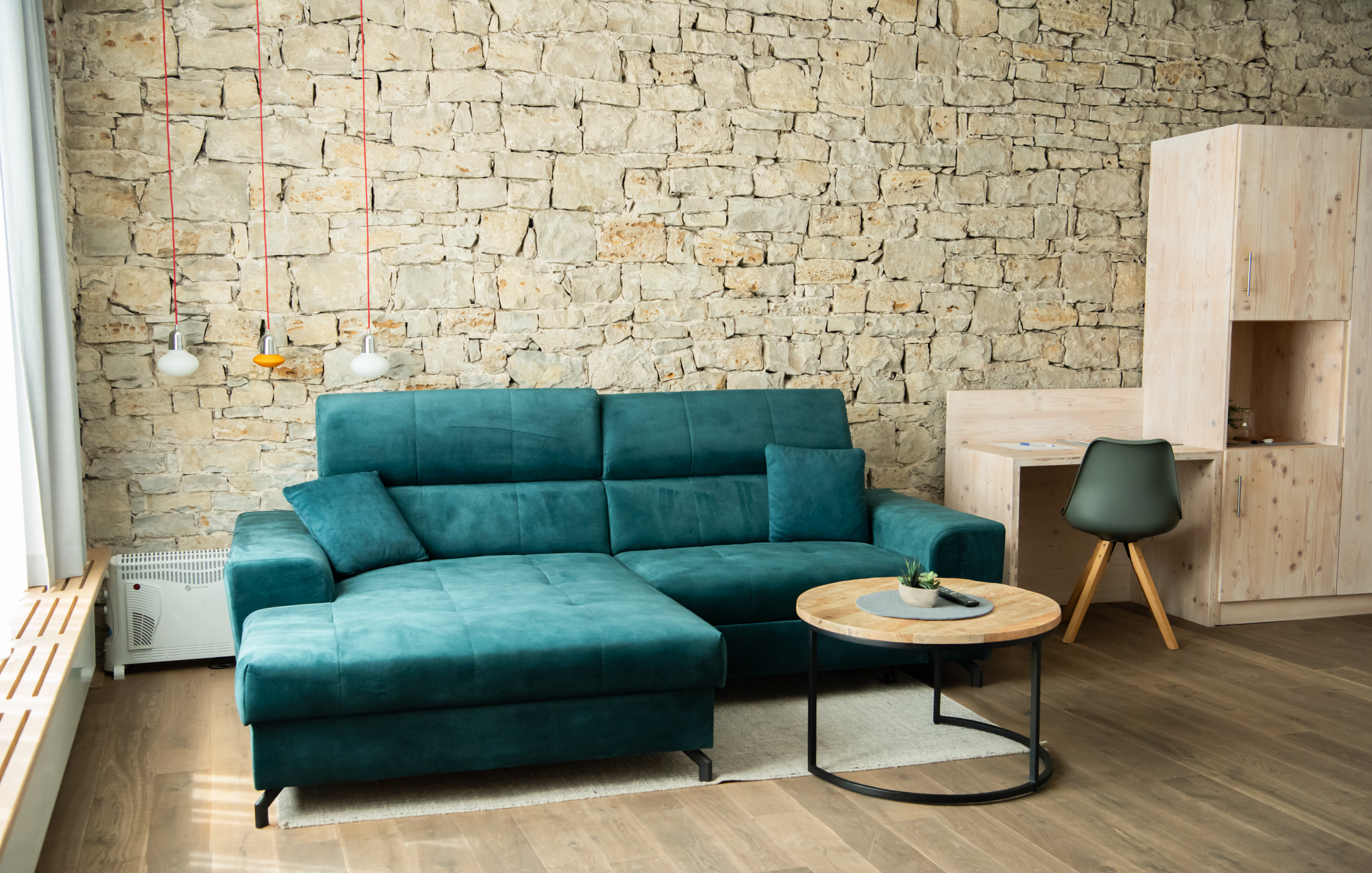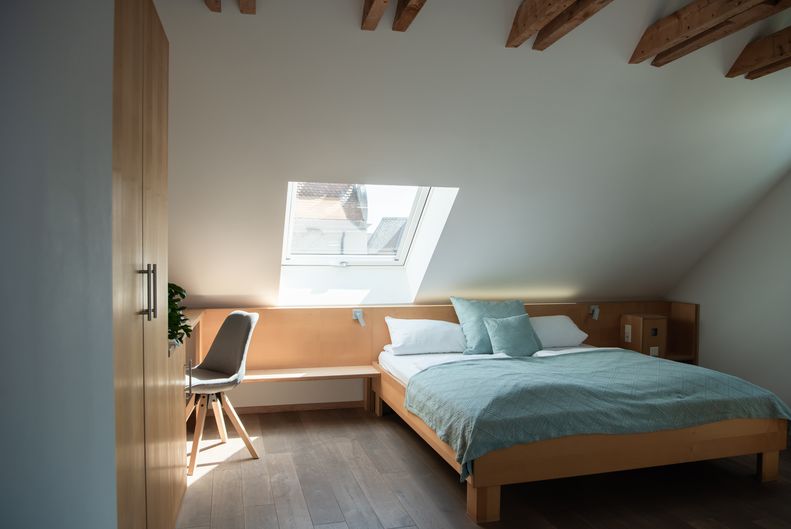 Das lichtdurchflutete Dachstudio bietet einen tollen Rundum-Ausblick und ist dank eines Schlafsofas auch für Familien mit bis zu 2 Kindern geeignet. Durch die großen Fenster richtet sich der Blick auf die Escherndorfer Weinberge, die restaurierte Kapelle des Zehnthofs sowie die preisgekrönte Architektur der Winzergenossenschaft Divino. Durch die freiliegenden Holzbalken des Dachstuhls, das geräumige Tageslichtbad mit Dusche sowie das große Doppelbett kann man sich hier nur wohlfühlen. Unser Dachstudio liegt in der 2. Etage in unserem Haupthaus.