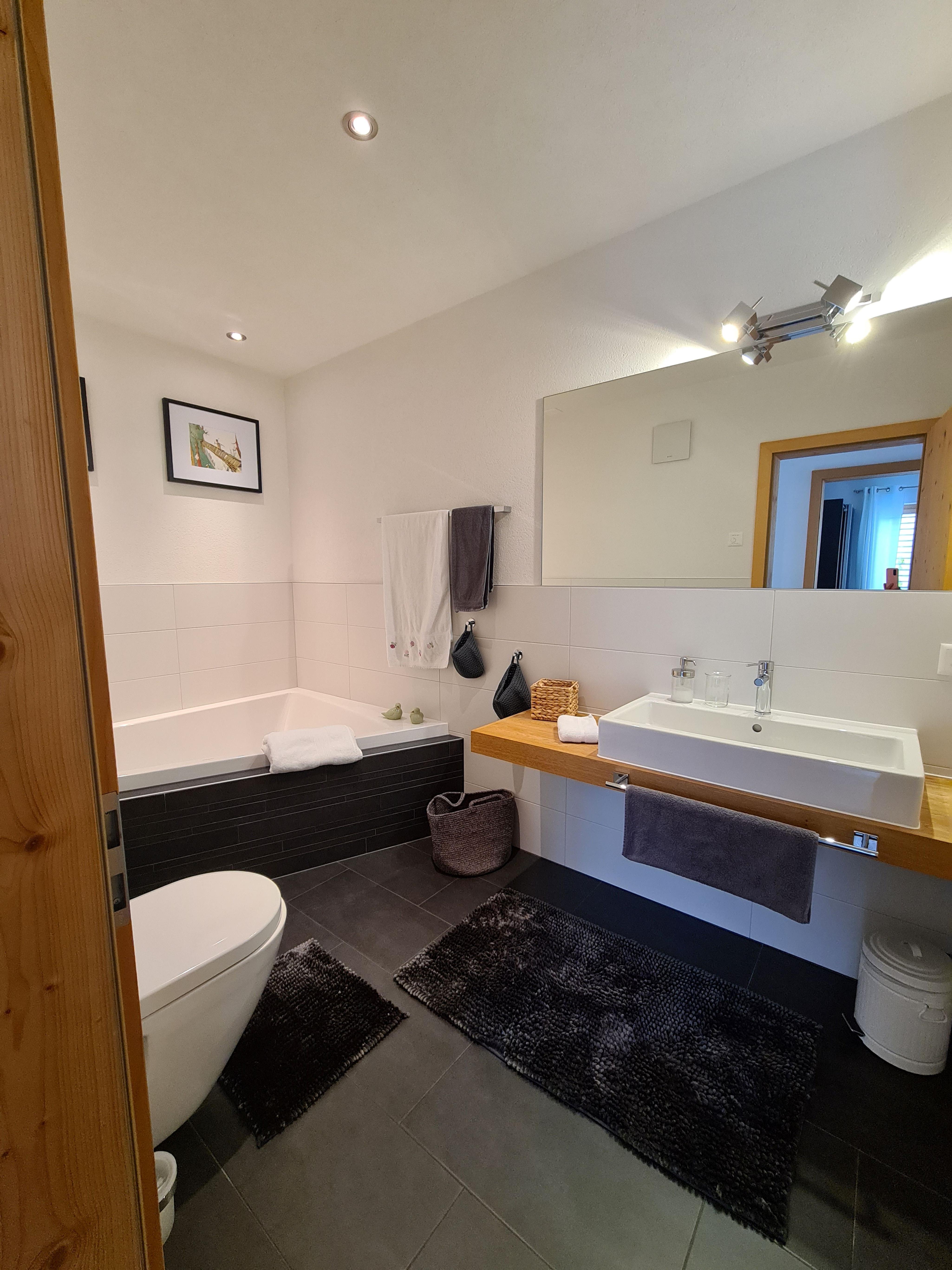 In der Wohnung befinden sich 2 Badezimmer: 1 Badezimmer mit grosser Badewanne, Waschtisch und WC und