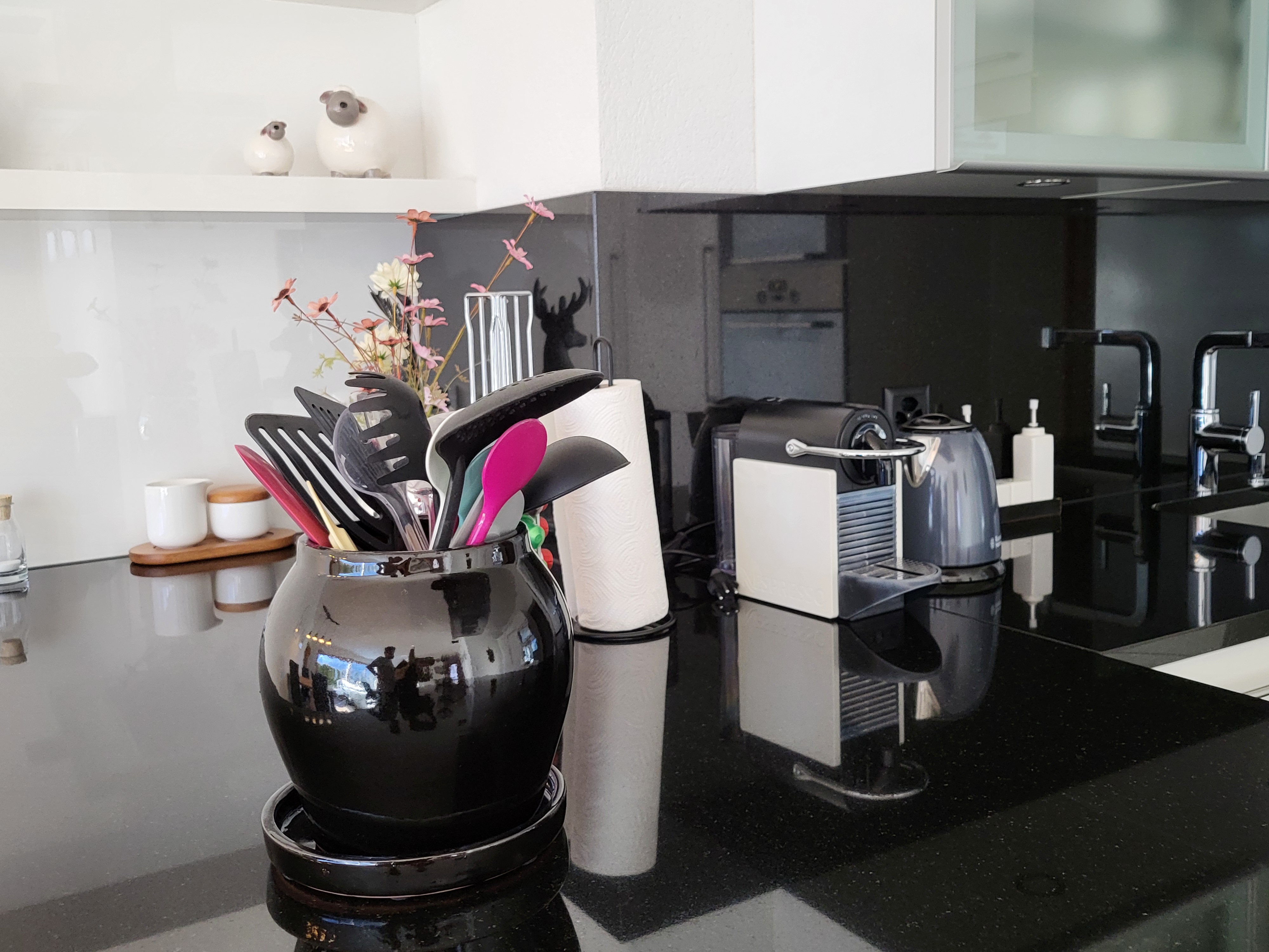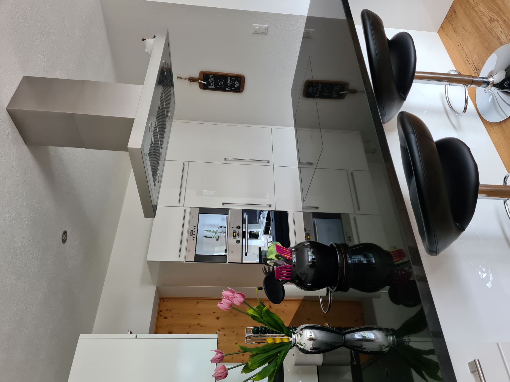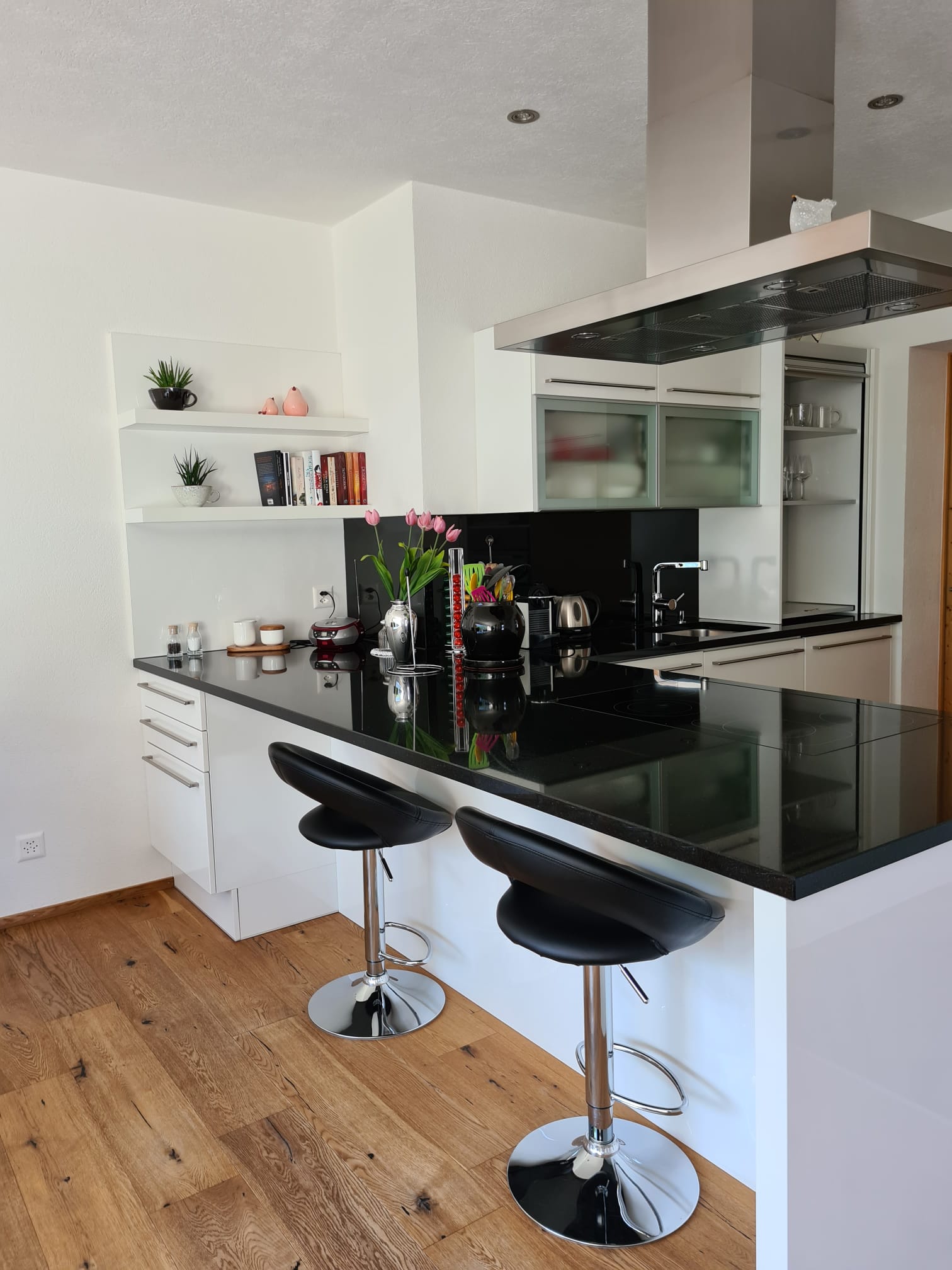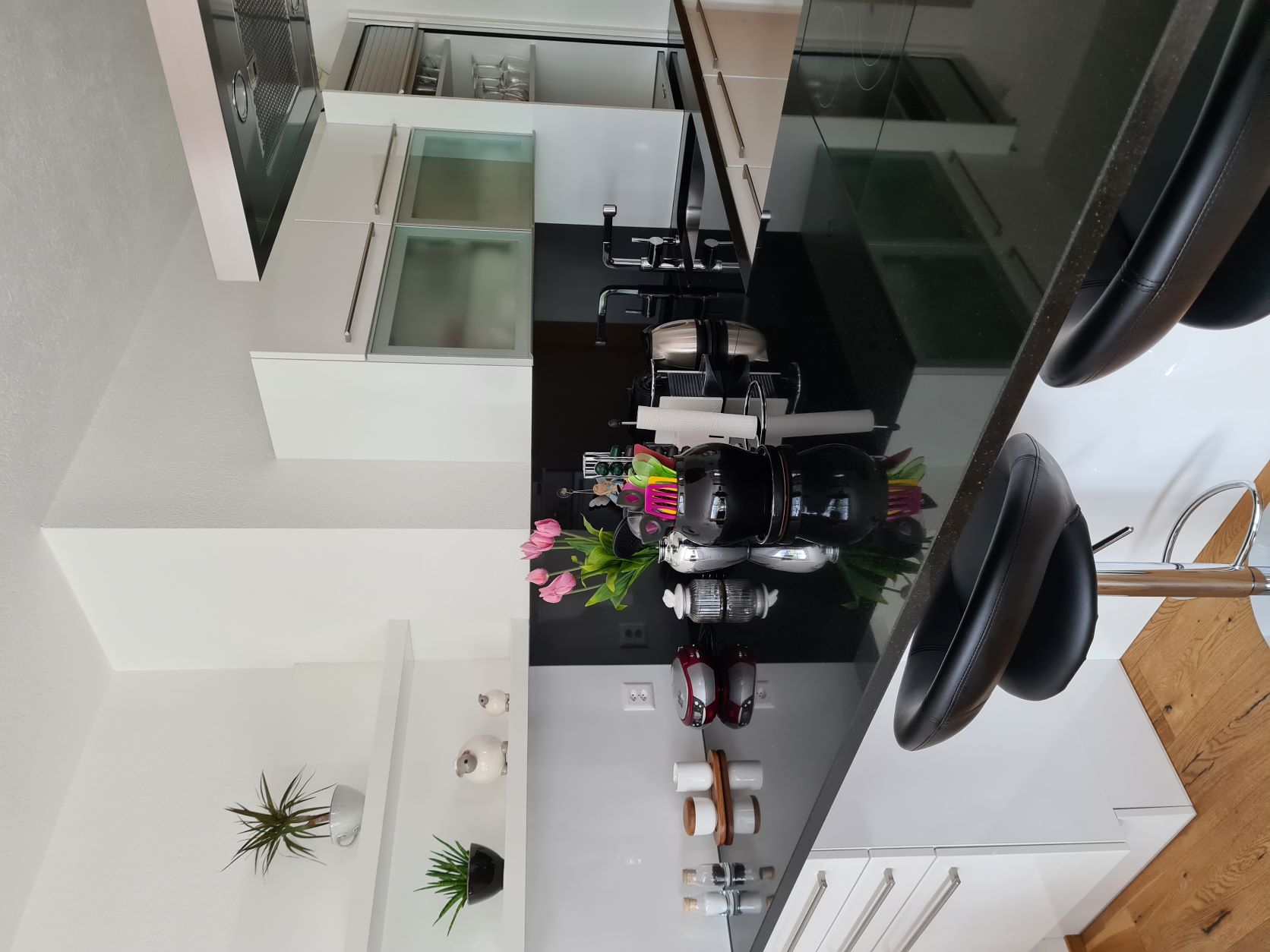 In der modernen voll ausgestatteten Küche befinden sich ein grosser kombinerter Kühlschrank/Gefrierfach, Geschirrspüler, Backofen, Microwelle, Ceran-Kochfeld, Nespresso- und Kaffeefiltermaschine, Wasserkocher, komplette Geschirr-, Besteck- und Gläserausstattung, Raclett-, Chinoise- und Fonduegeschirr, diverse Töpfe und sonstige notwendigen Küchenutensilien und diverse Gewürze.
