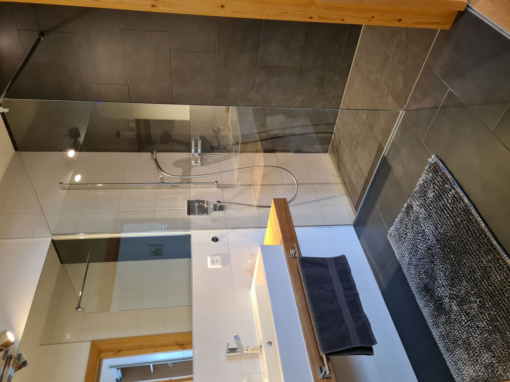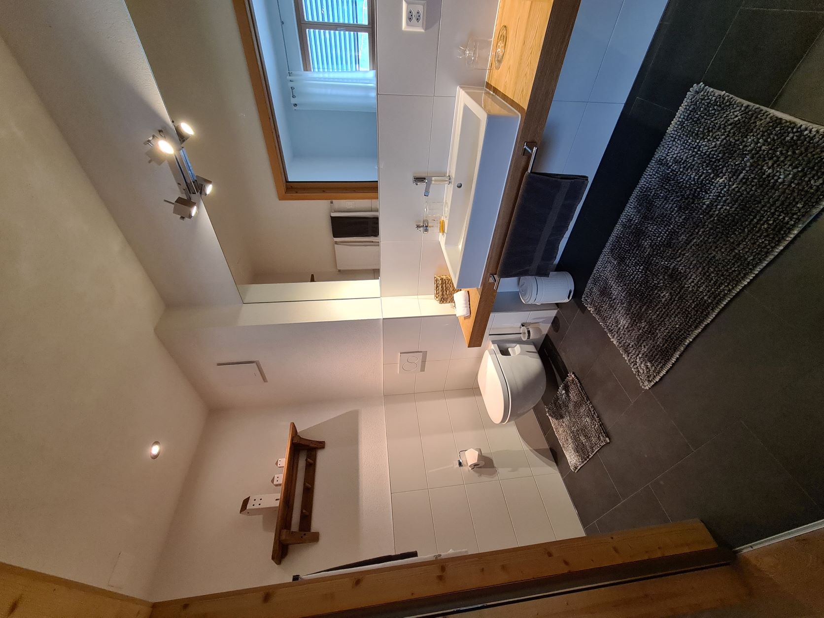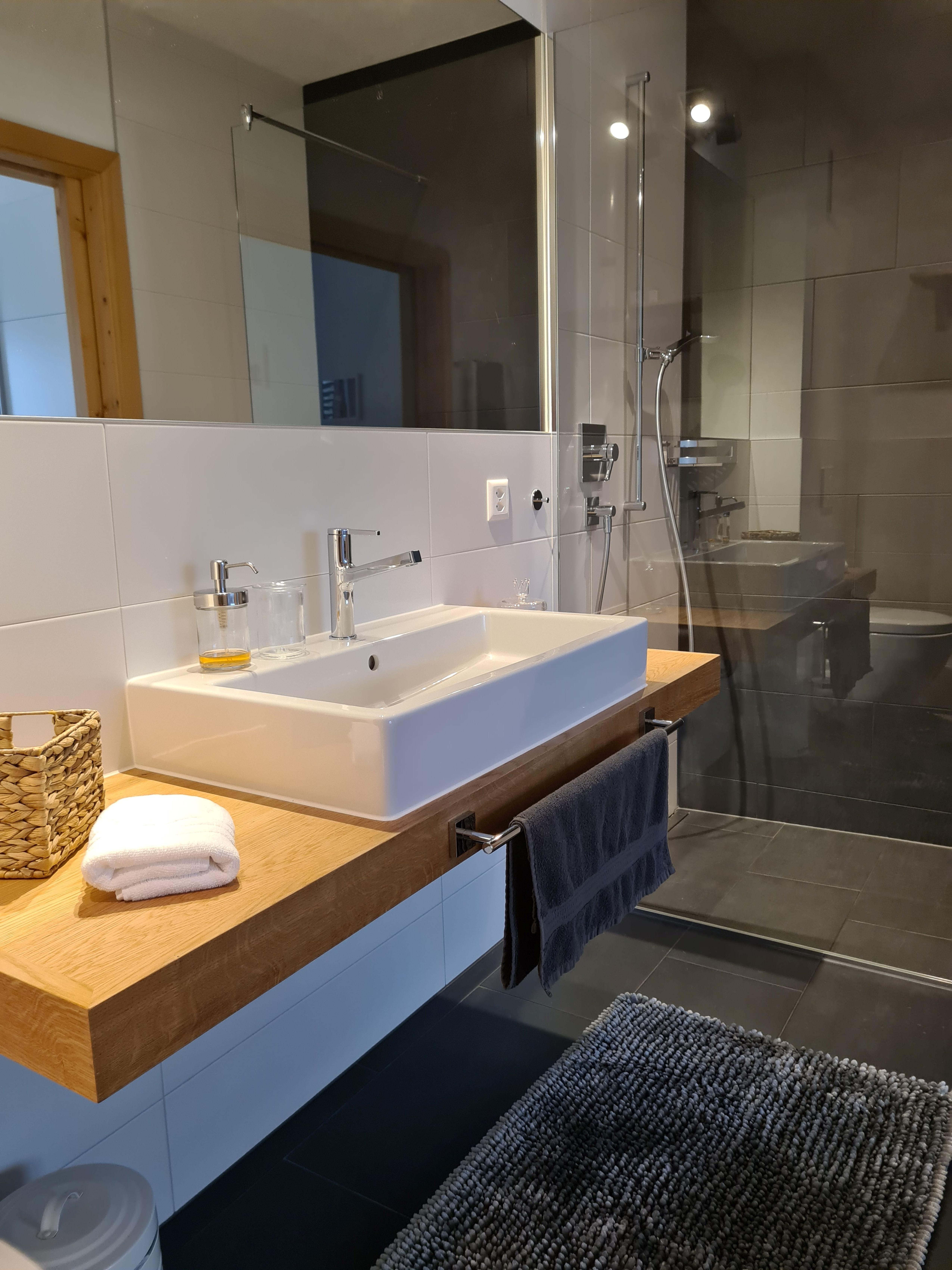 1 Badezimmer mit geräumiger begehbarer Dusche, Waschtisch und WC.