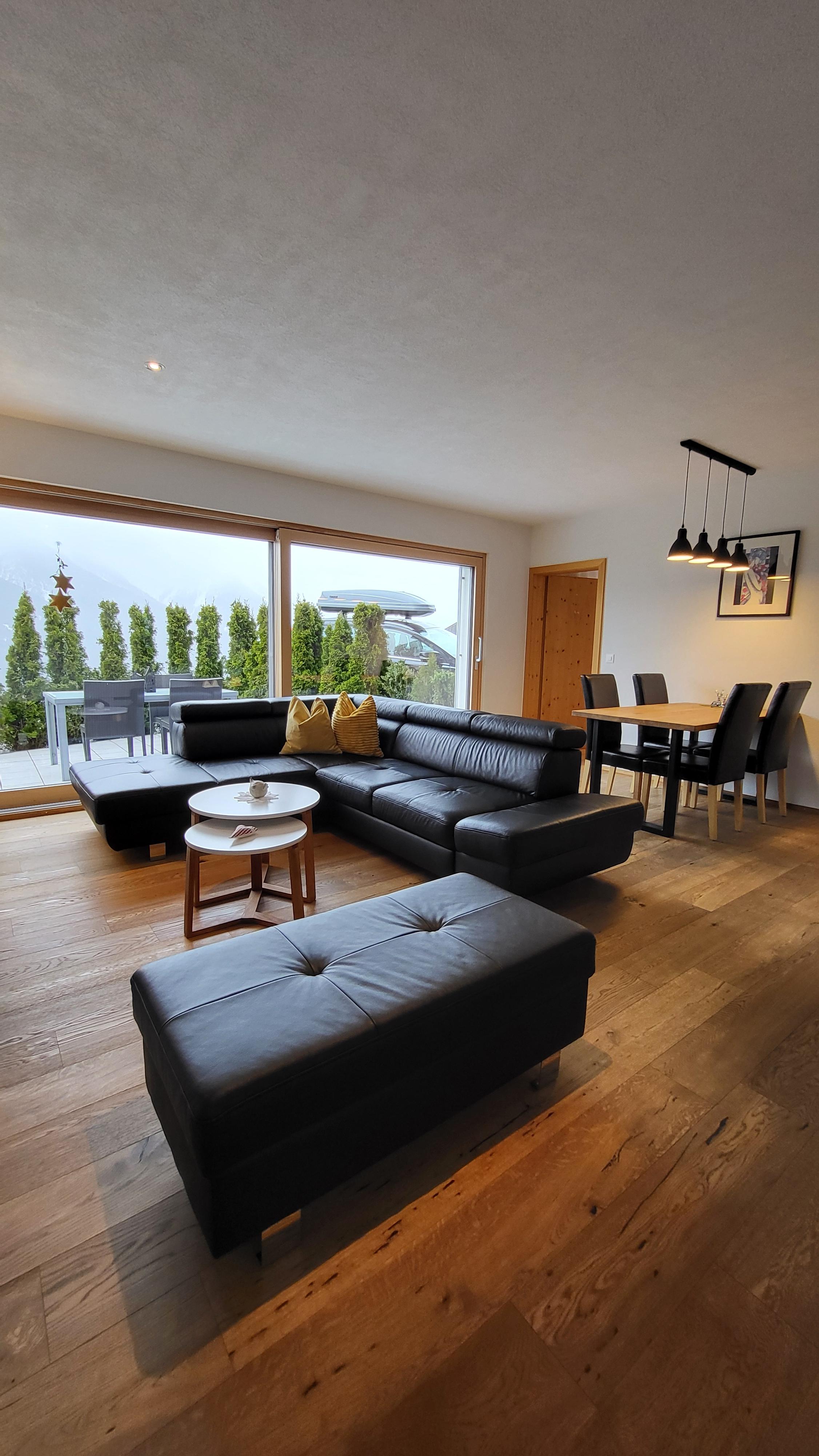 Ein grosszügiger, lichtdurchfluteter Wohnraum mit einem Ledersofa und Lederhocker, Flachbildfernseher, Sat/TV und direktem Ausgang auf Süd-Terrasse sorgen für Erholung und Entspannung.