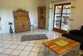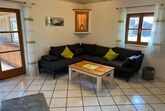 • Wohnzimmer: Separates Wohnzimmer mit gemütlicher Couch, SAT-TV, Arbeitsplatz und direktem Zugang zur Terrasse mit Balkonmöbeln und Liege.