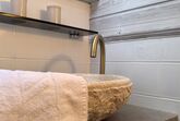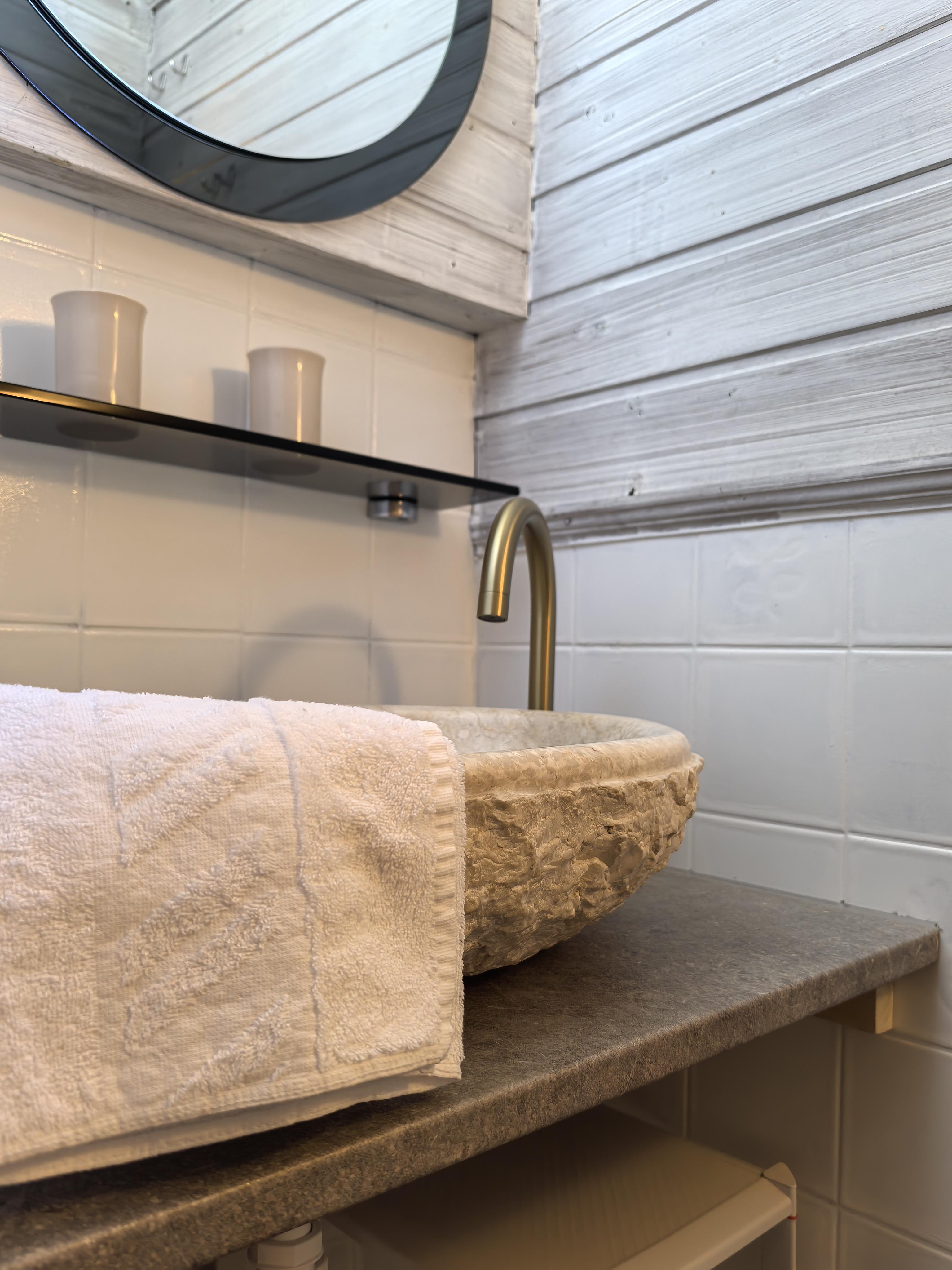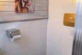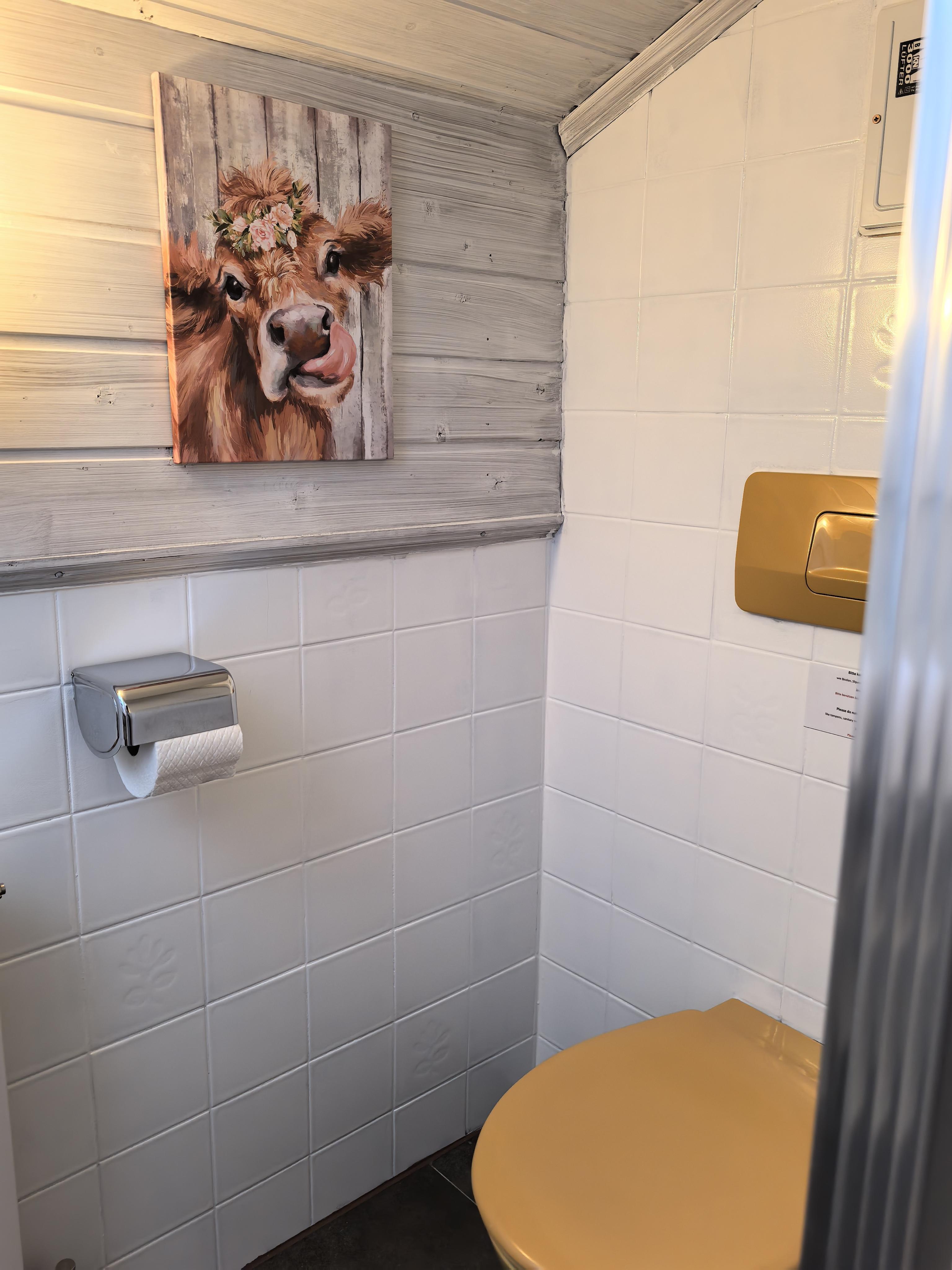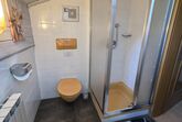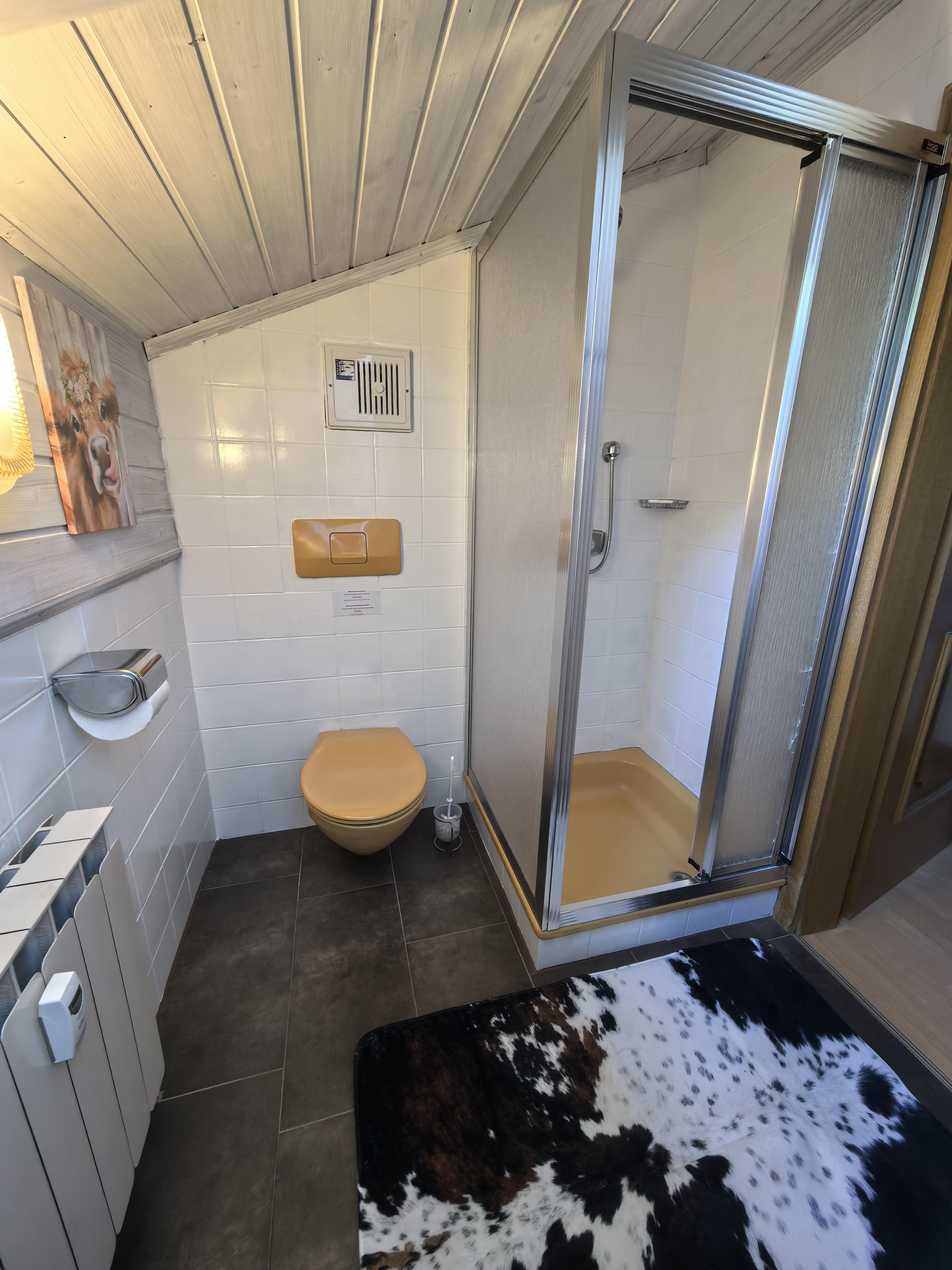 Das hell gestaltete Badezimmer ist mit WC, Waschbecken und Dusche ausgestattet.