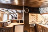 Der Essbereich verfügt über einen großen Esstisch, eine Küchenzeile mit Herd, Geschirrspülmaschine, Kühlschrank, Kaffeemaschine und Geschirr.