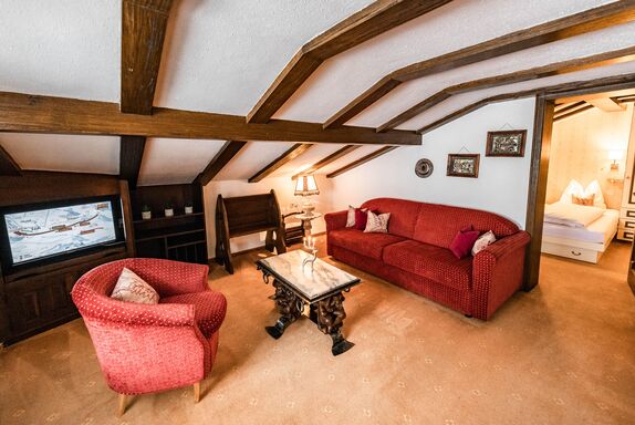 Im Wohnbereich befindet sich eine große ausziehbare Couch und eine gemütliche Sitzecke mit TV.