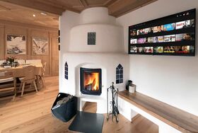 Im großzügigen Wohnbereich lädt ein stilvoller Holz-Kamin zu gemütlichen Abenden ein – das Holz liegt bereits für Sie bereit. Für Unterhaltung sorgt ein großer Smart-TV mit Streaming-Angeboten wie Netflix. Die große Sitzecke im Erker bildet das Herzstück des Raums – ideal für gesellige Runden oder entspannte Lesestunden.