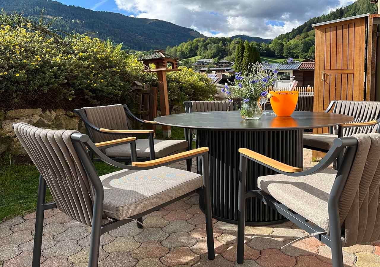 Wohnen, genießen, entspannen Ob am rustikalen Holztisch im Apartment oder draußen auf der Terrasse – bei uns lässt es sich herrlich speisen und entspannen. Die Kinder toben auf der Wiese, während Ihr den Sonnenuntergang mit einem Sundowner genießt oder es Euch am knisternden Kamin gemütlich macht.