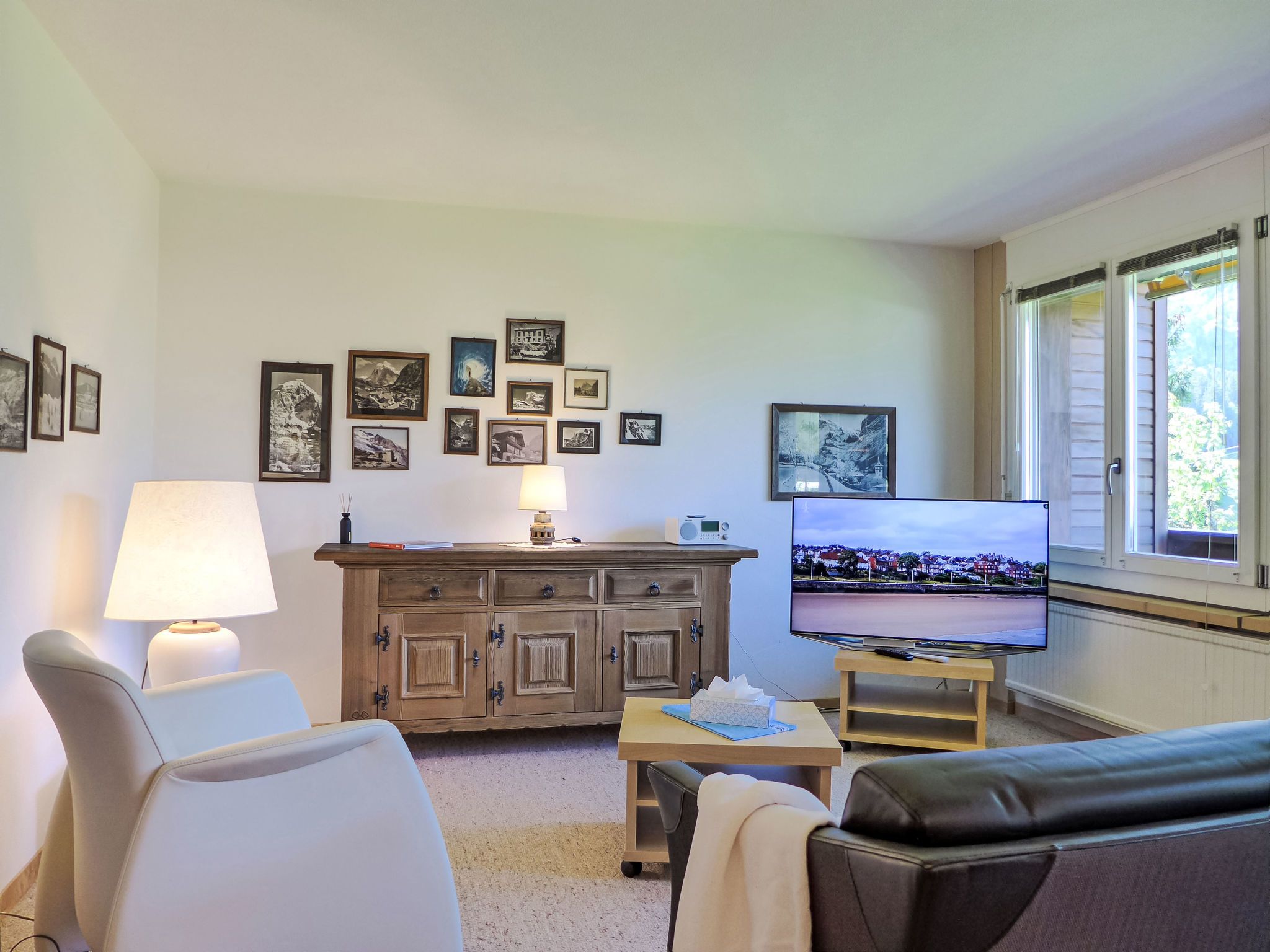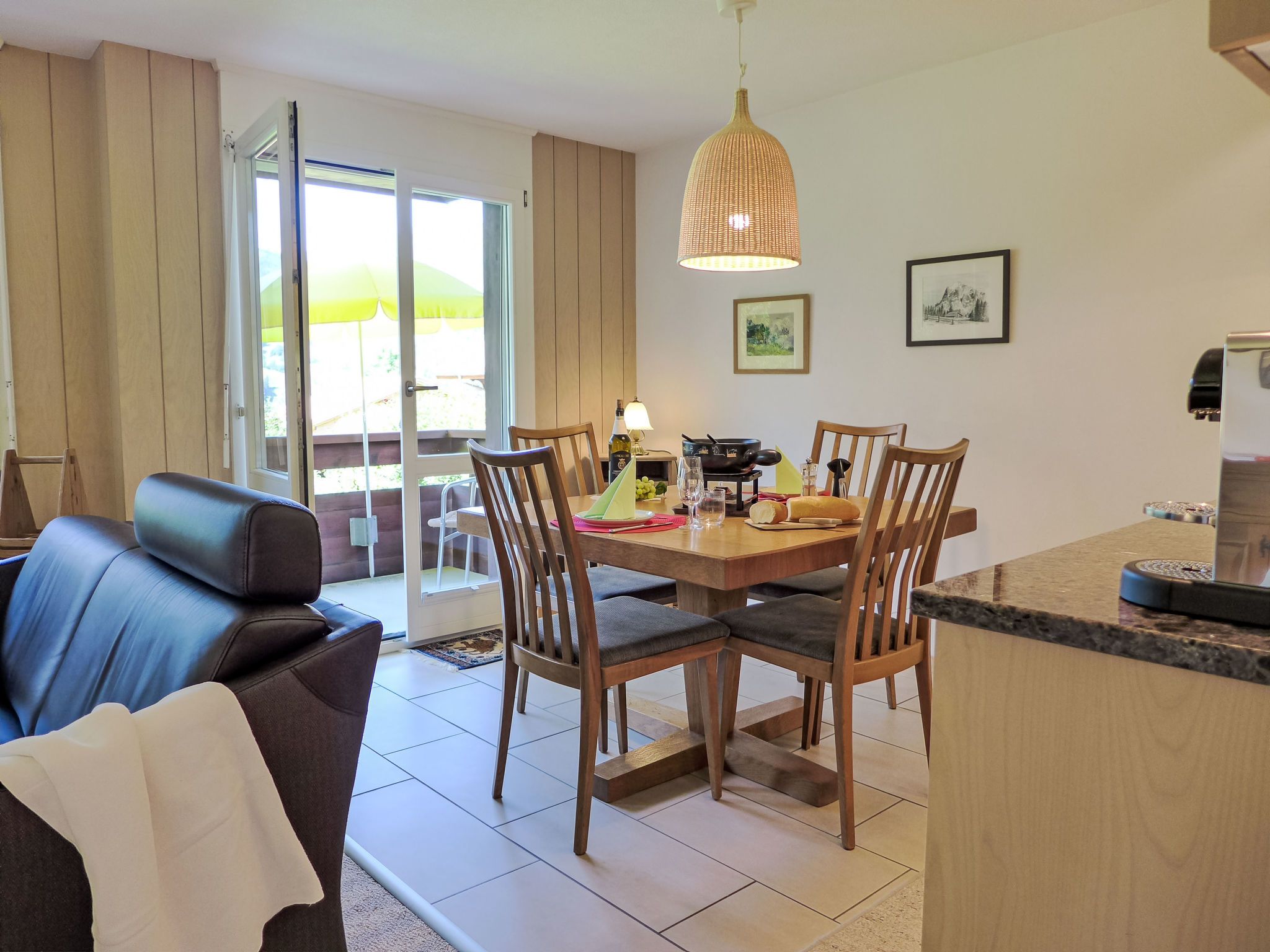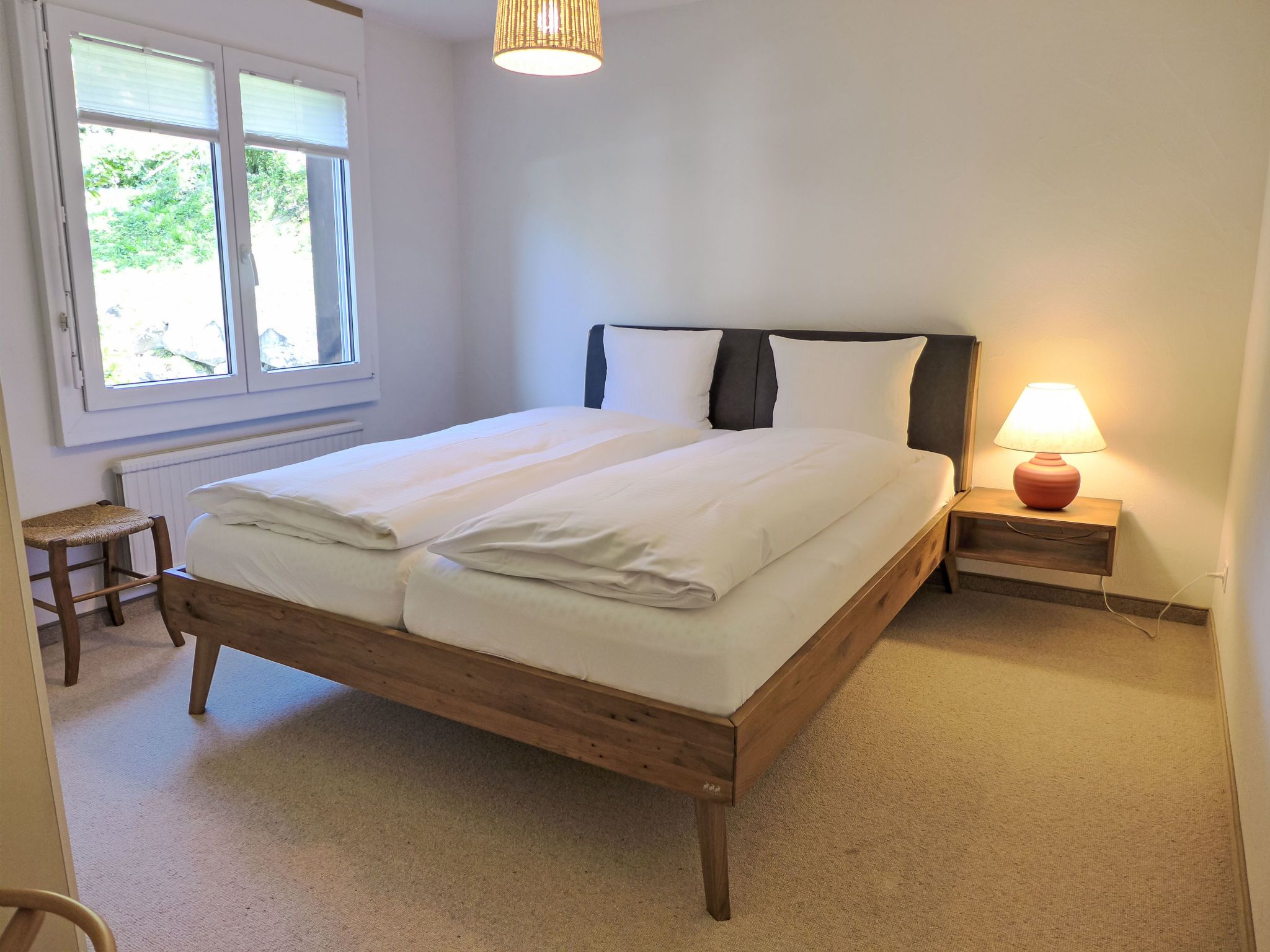 2-Zimmer-Wohnung 40 m2, im erhöhten Erdgeschoss, Südlage. Sehr komfortabel und gemütlich eingerichtet: offenes Wohn-/Esszimmer mit Esstisch, Kabel-TV, Internationale TV-Sender und Radio. Ausgang zum Balkon, Richtung Süden. 1 Zimmer mit 1 Doppelbett (2 x 80 cm, Länge 200 cm). Offene Küche (Backofen, Geschirrspüler, 4 Glaskeramikplatten, Toaster, Wasserkocher, elektrische Kaffeemaschine, Kapseln für die Kaffeemaschine (Nespresso) extra, Racletteofen, Fondue Set (Käse)). Bad/WC. Teppichboden. Balkon, Südlage. Balkonmöbel. Herrliche Sicht auf die Berge, die Landschaft und Eigernordwand. Zur Verfügung: Haartrockner. Internet (Wireless LAN, gratis). Garage (1 Auto) beim Haus, Höhe 195 cm. Bitte beachten: Nichtraucher-Unterkunft.