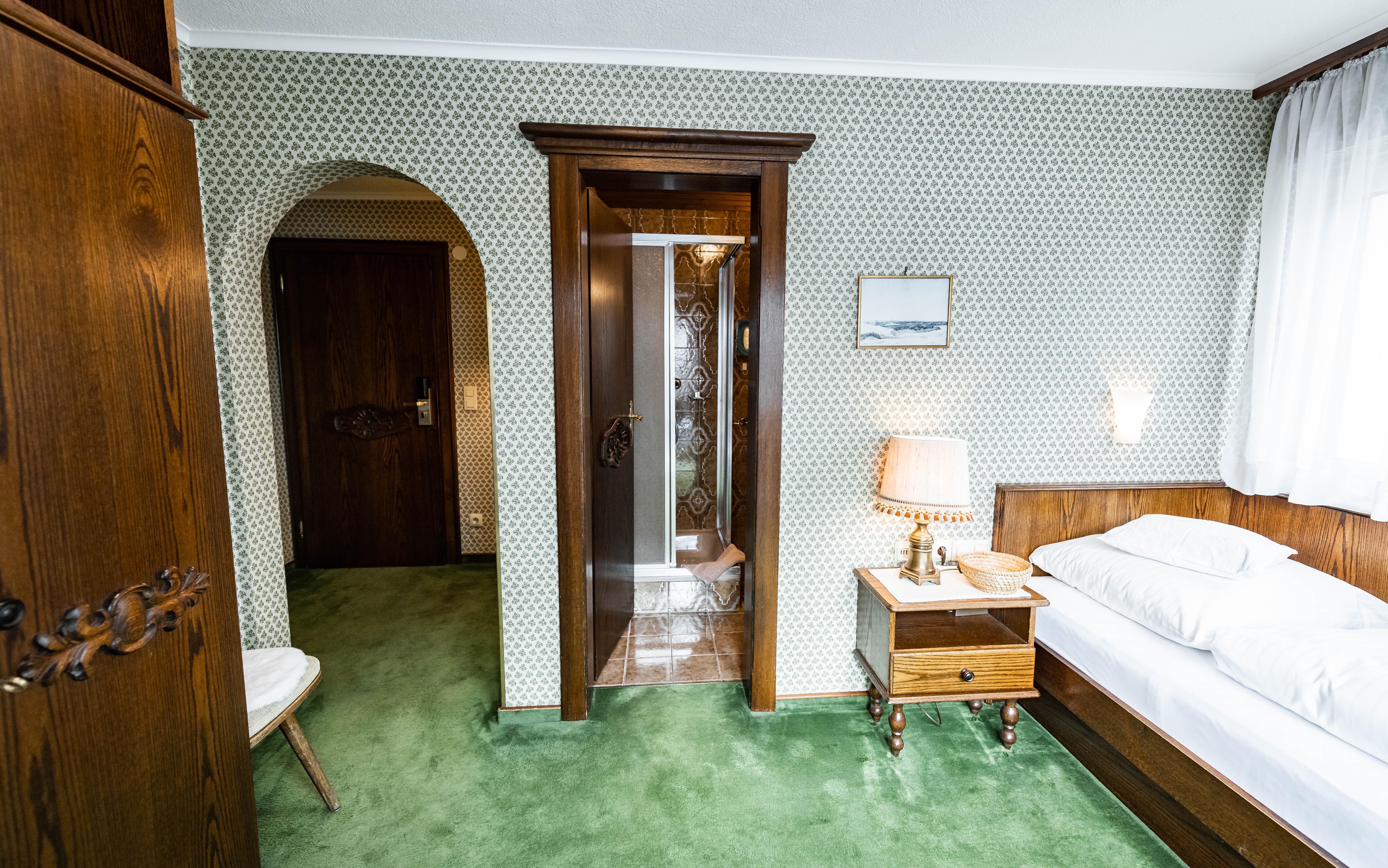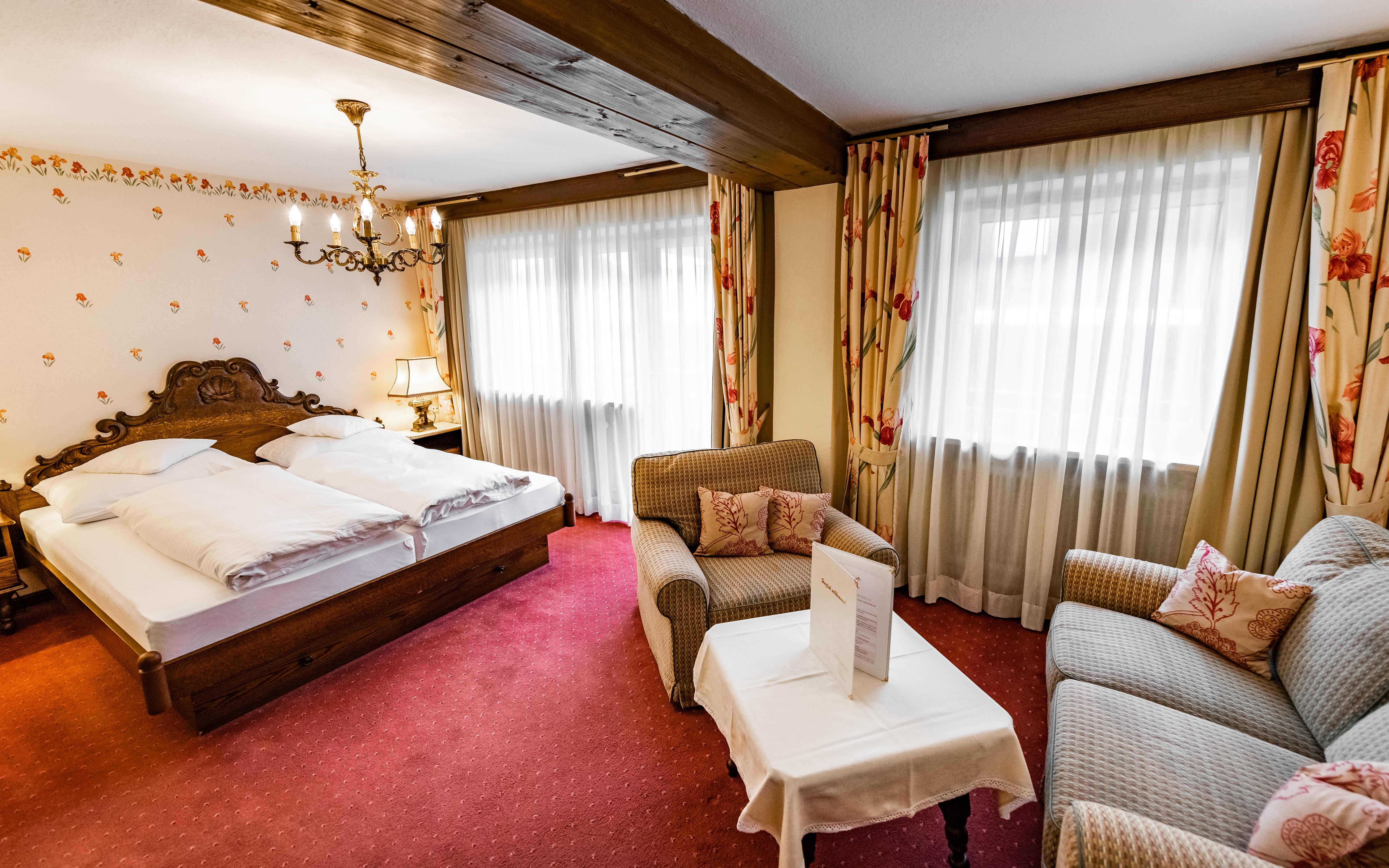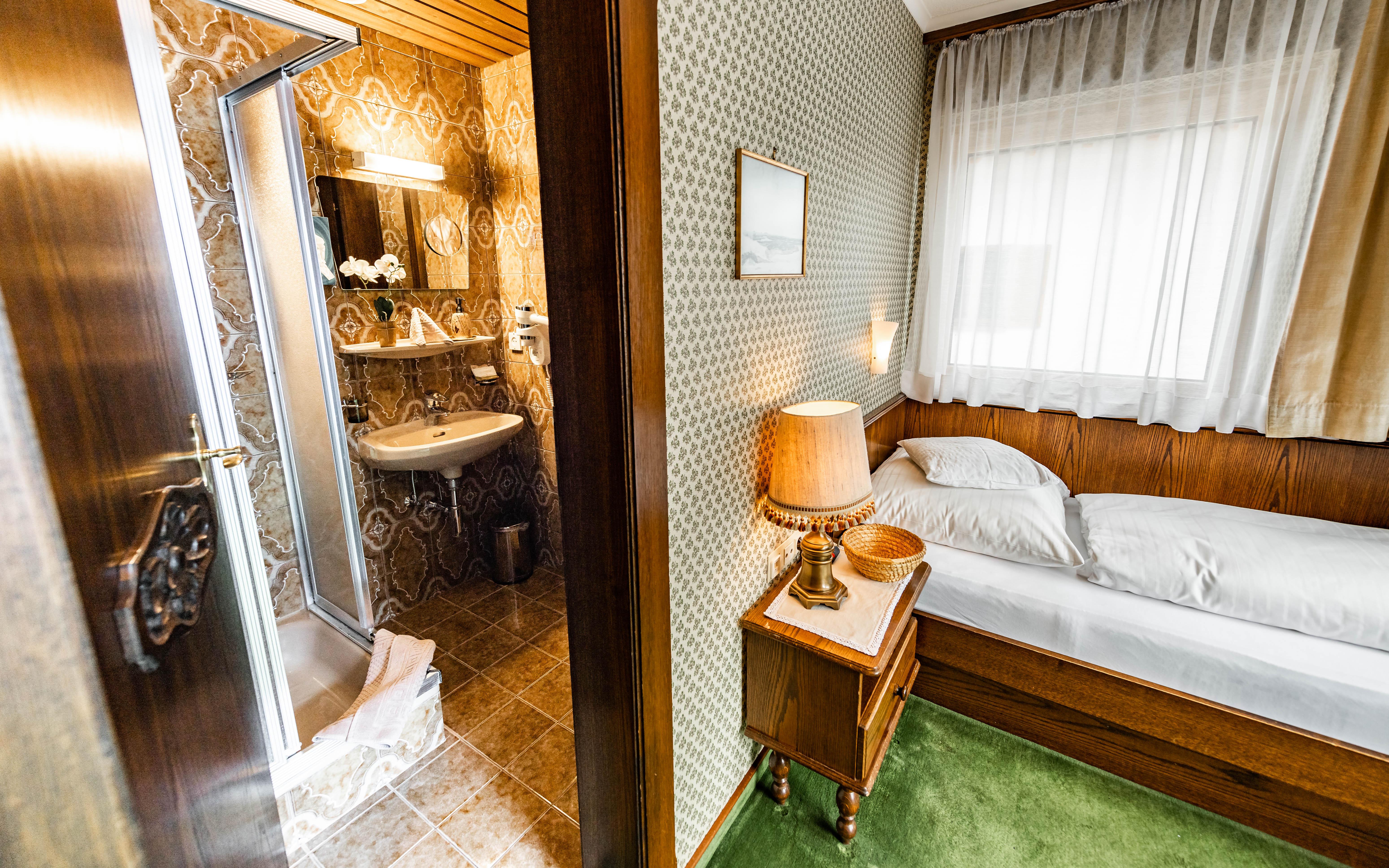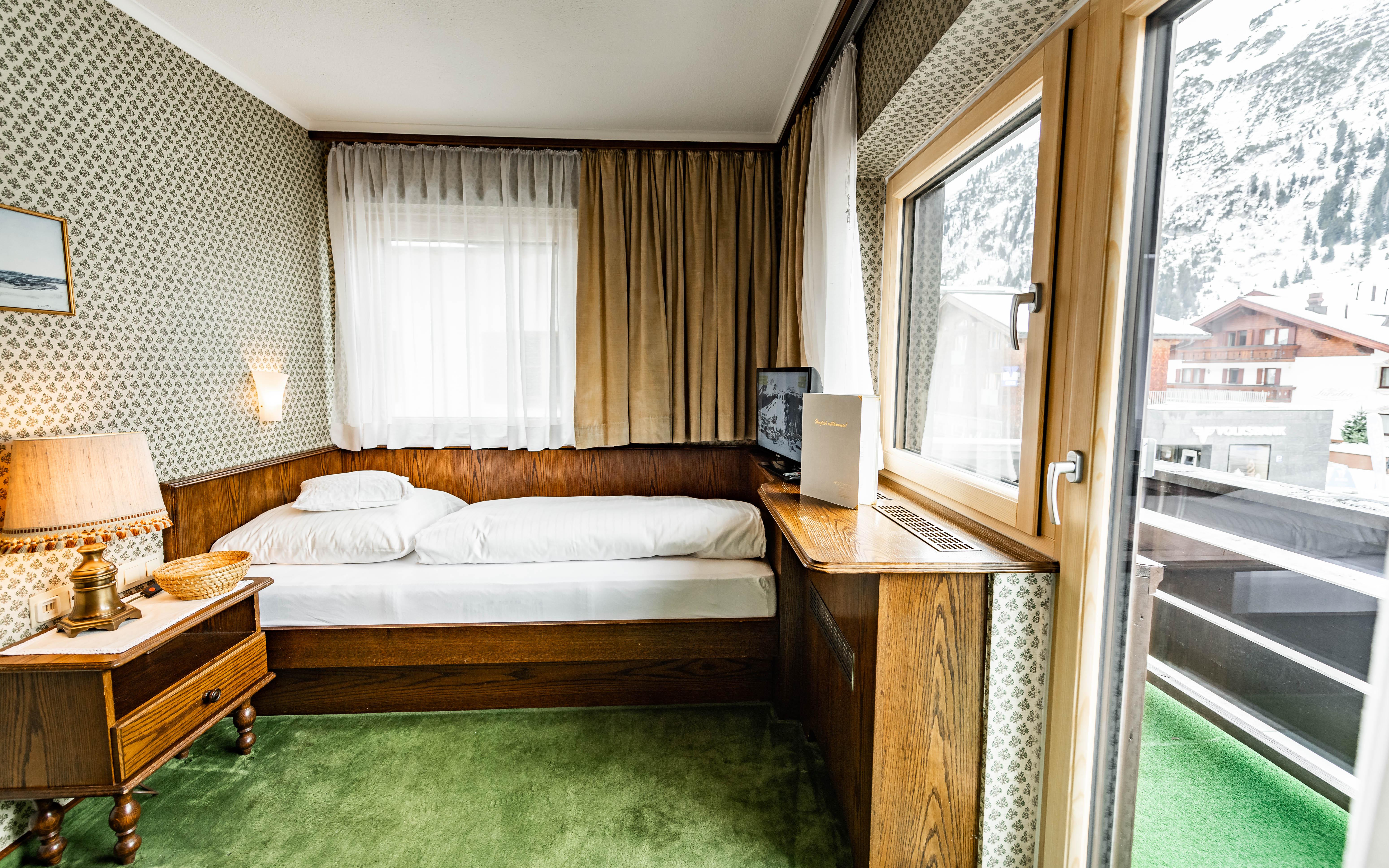 Unser Einzelzimmer ist im gemütlich-traditionellen Stil eingerichtet und bietet spektakuläre Blicke auf die Lecher Kirche und das Omeshorn.