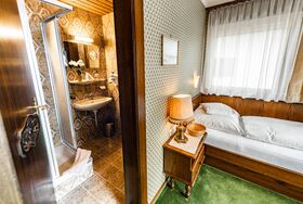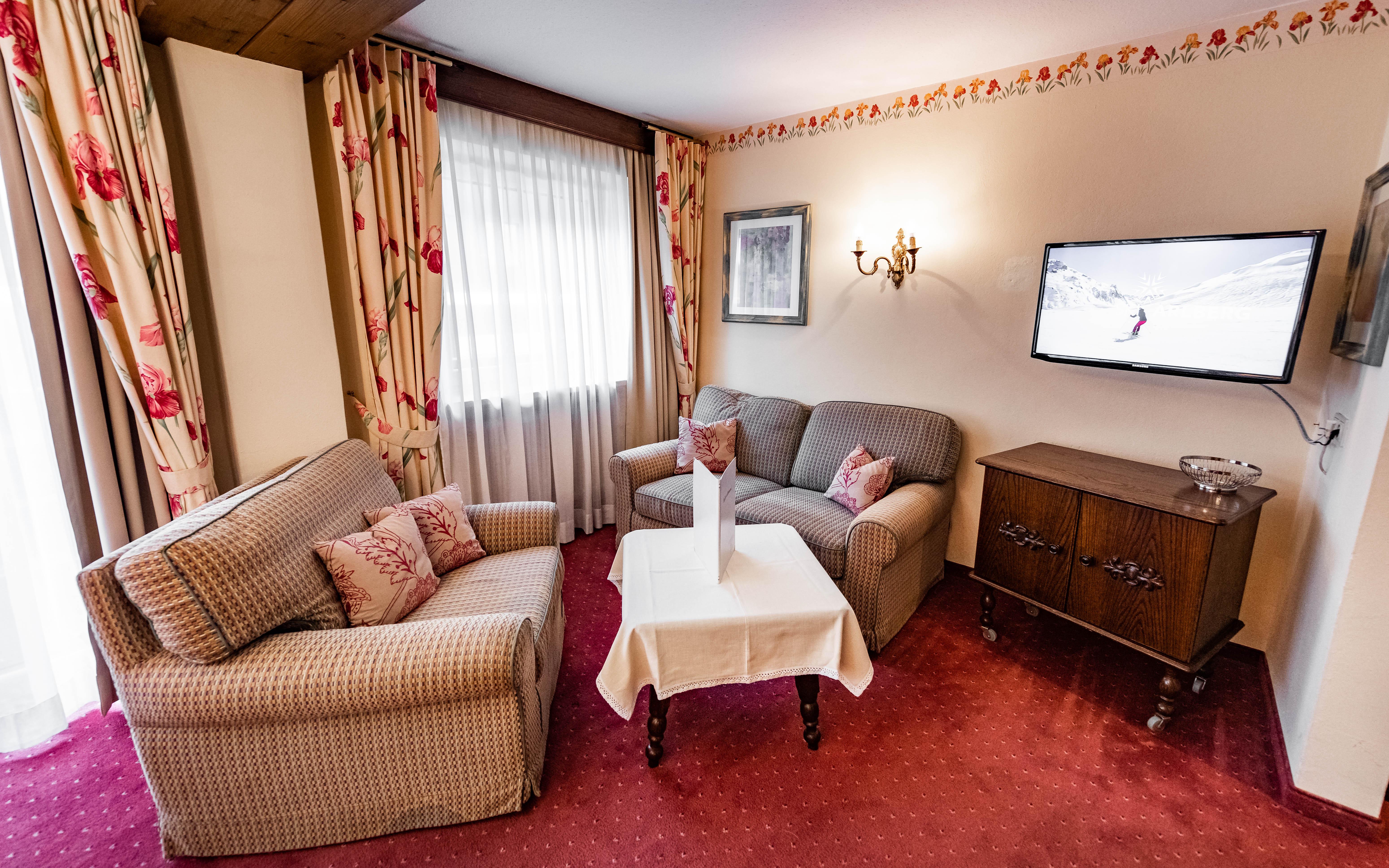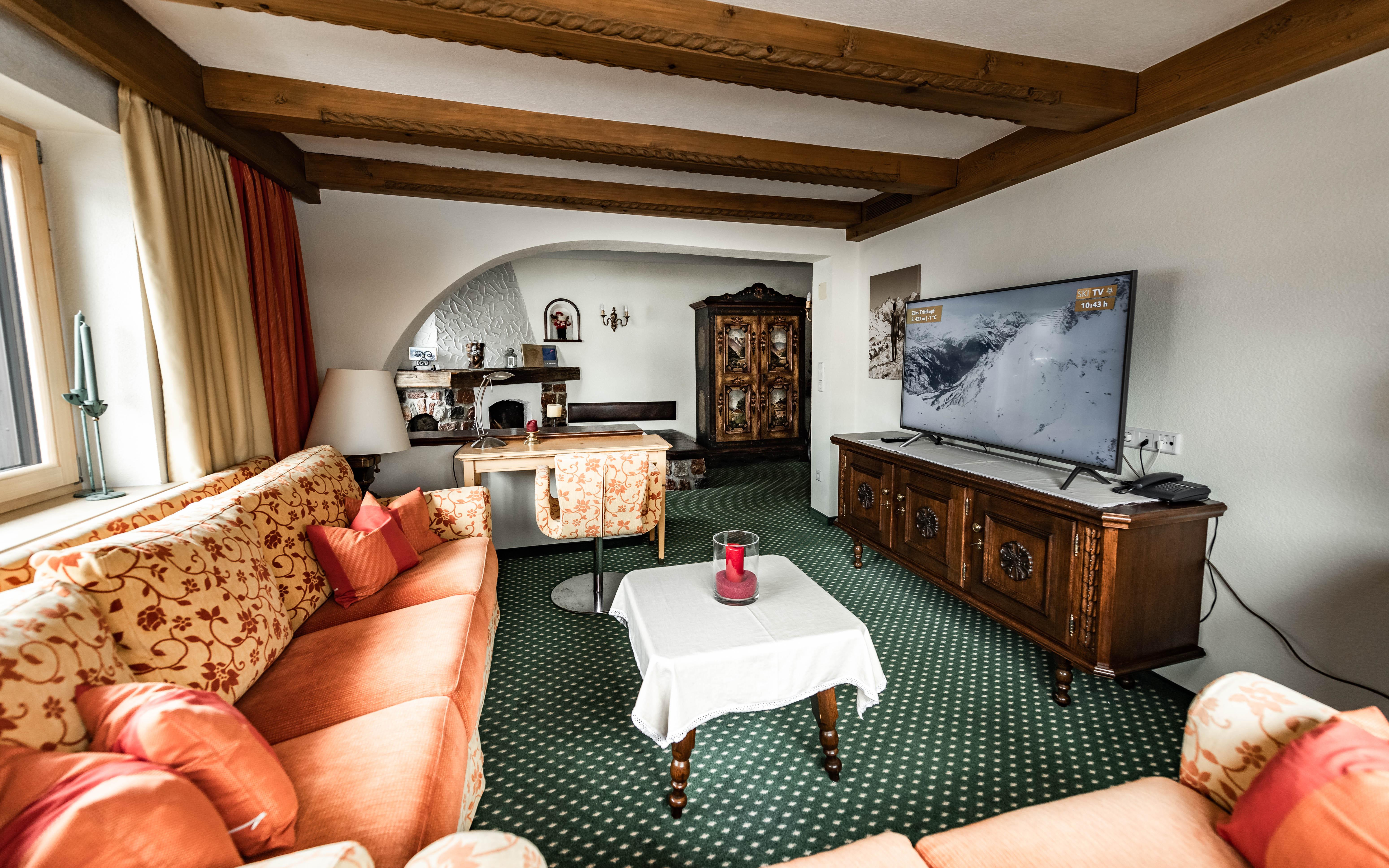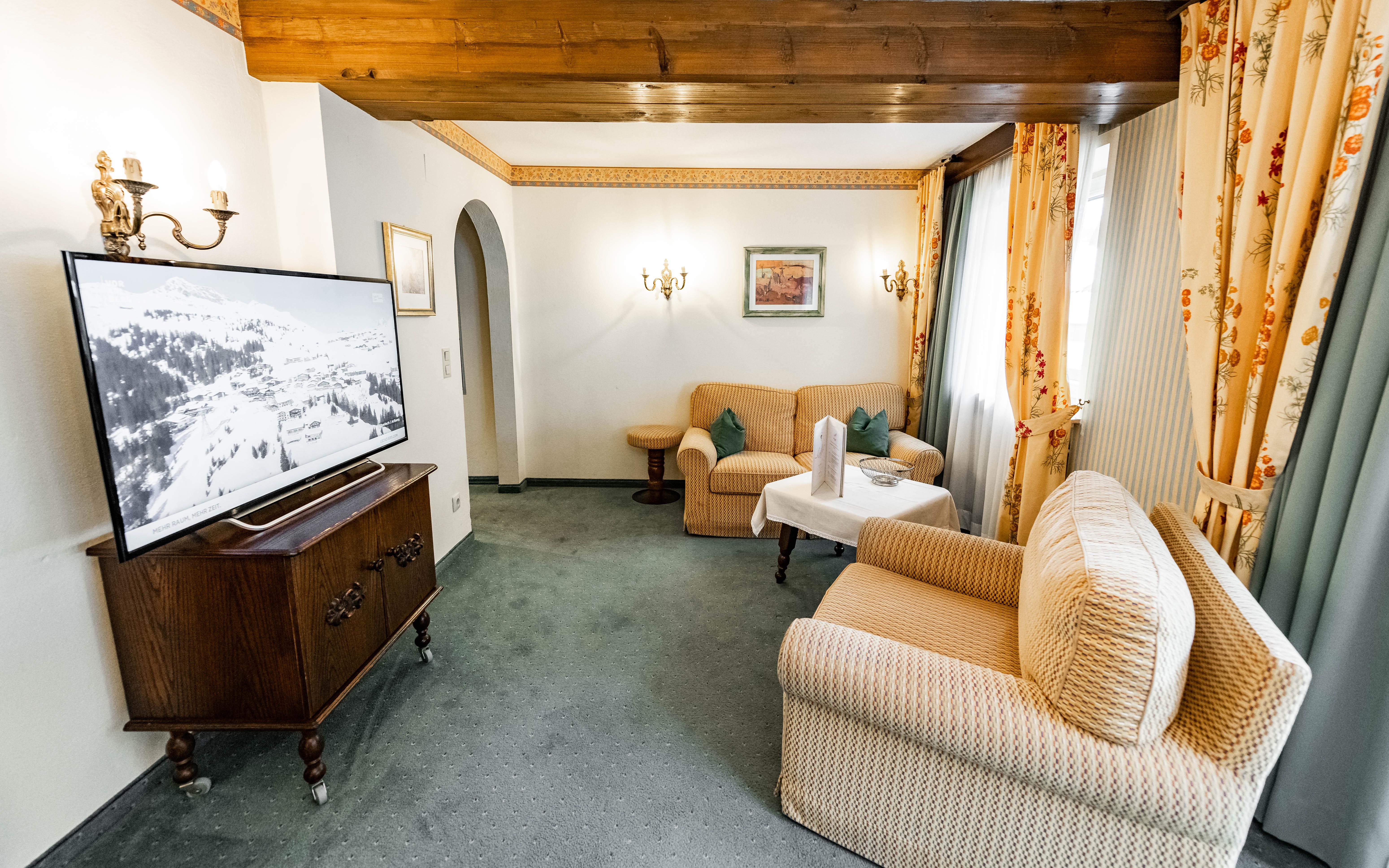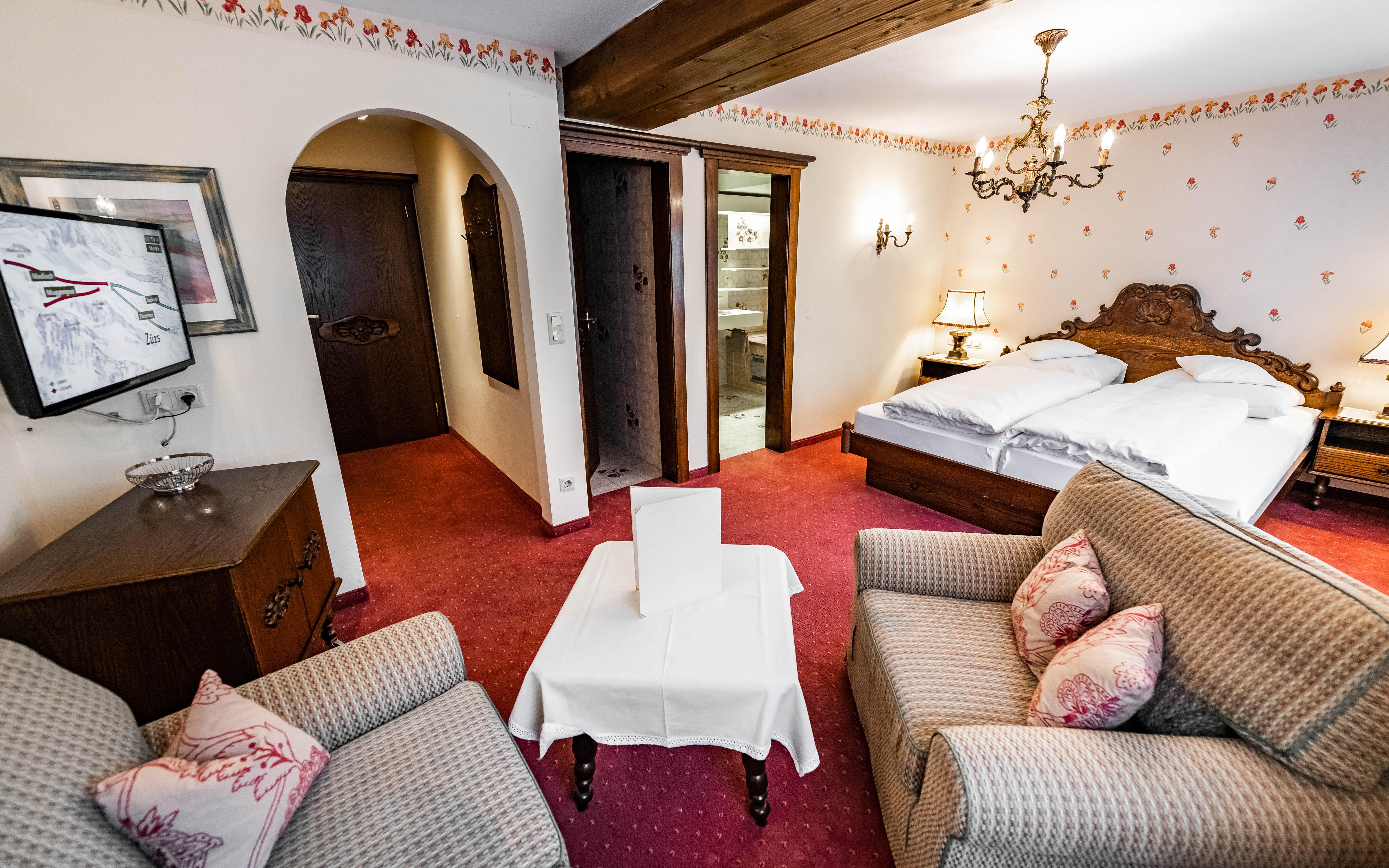 Unser Einzelzimmer ist im gemütlich-traditionellen Stil eingerichtet und bietet spektakuläre Blicke auf die Lecher Kirche und das Omeshorn.