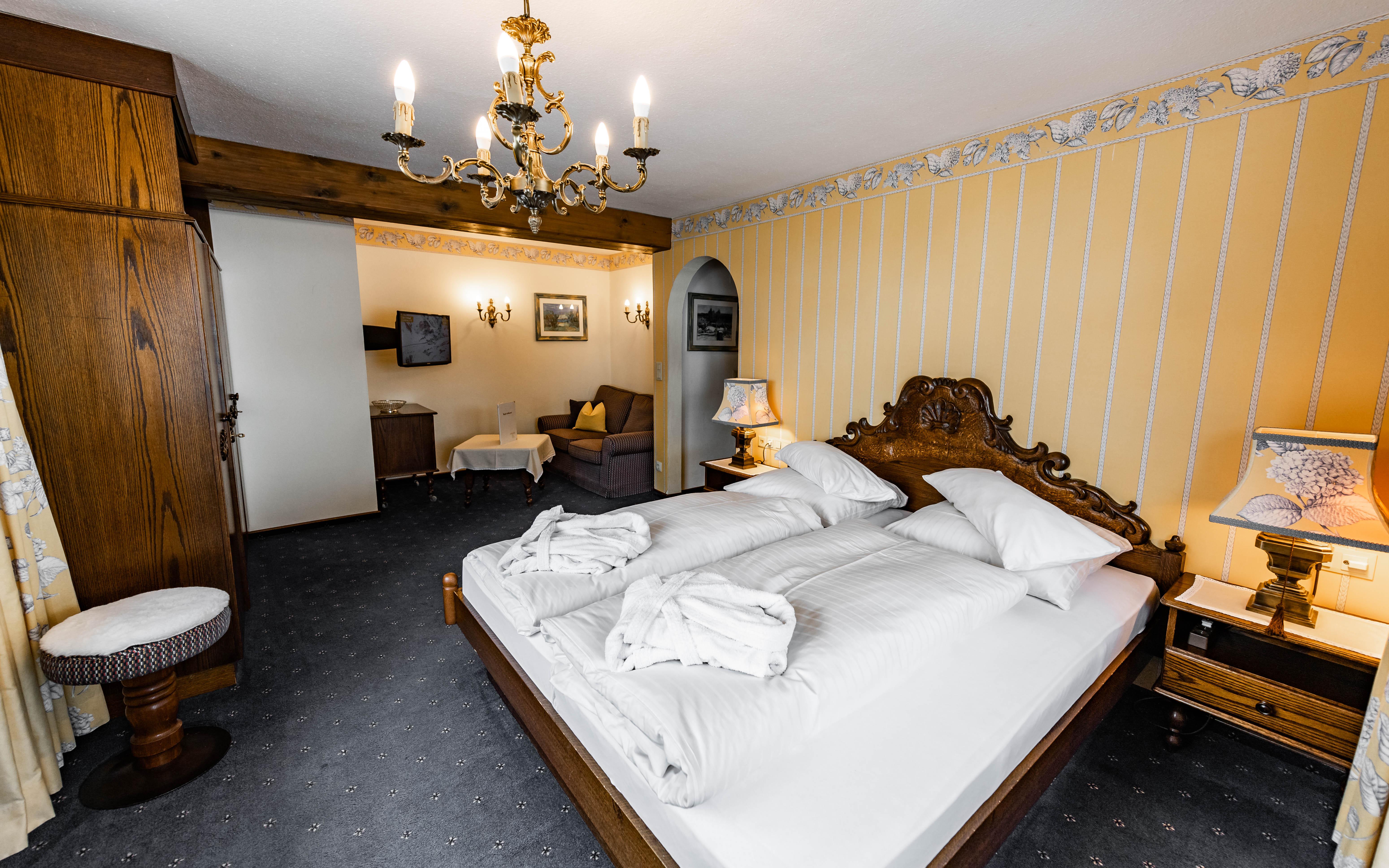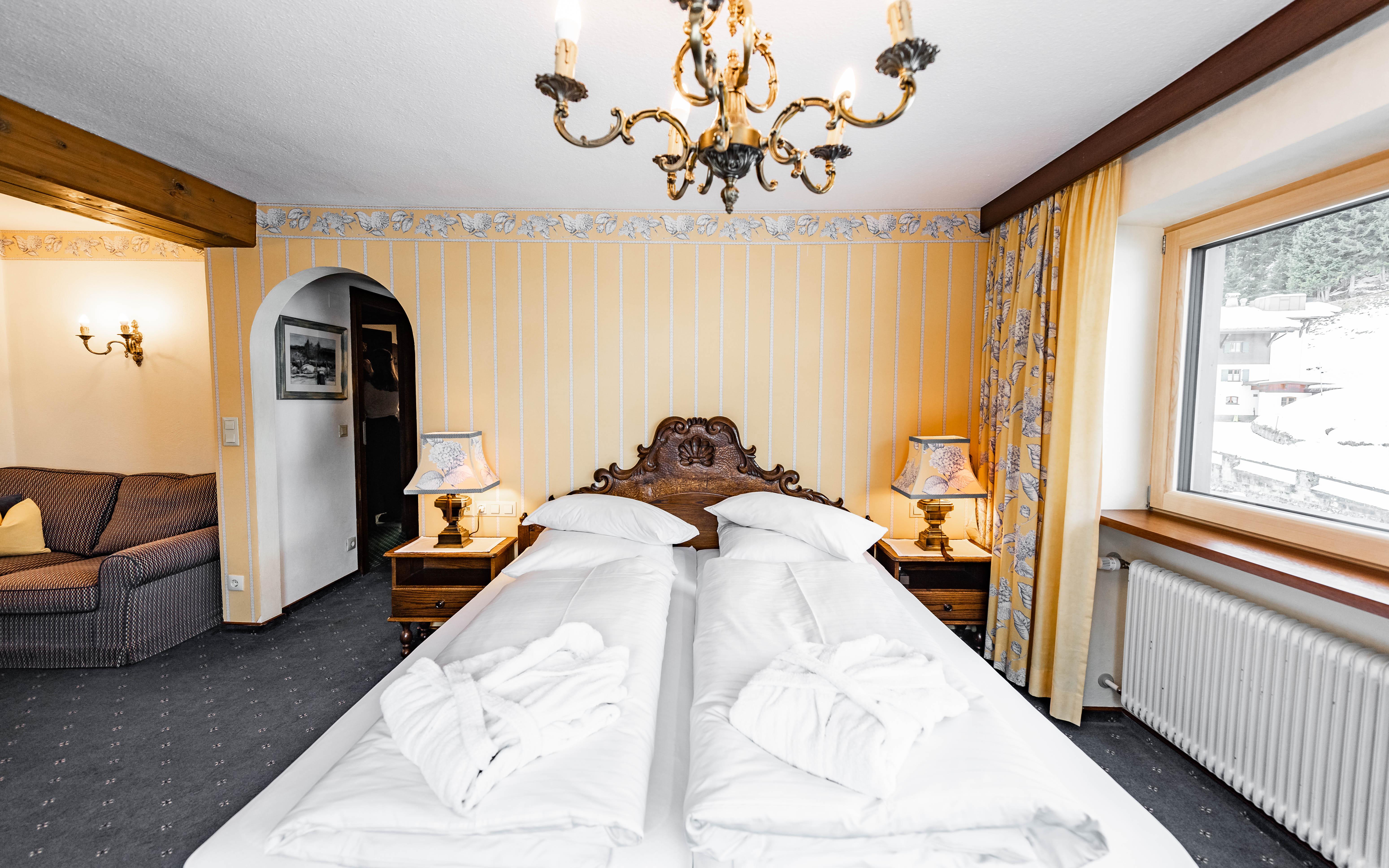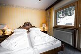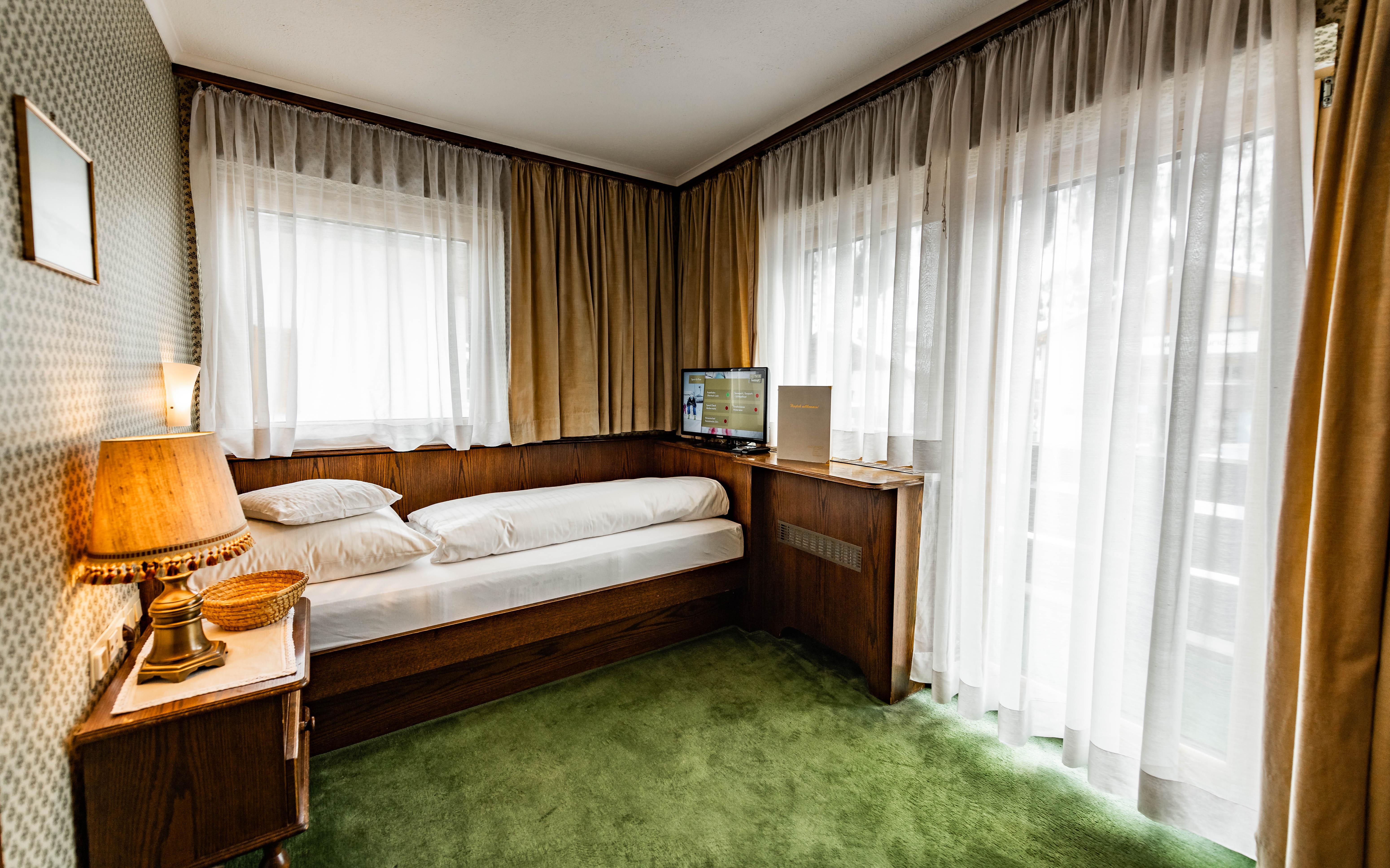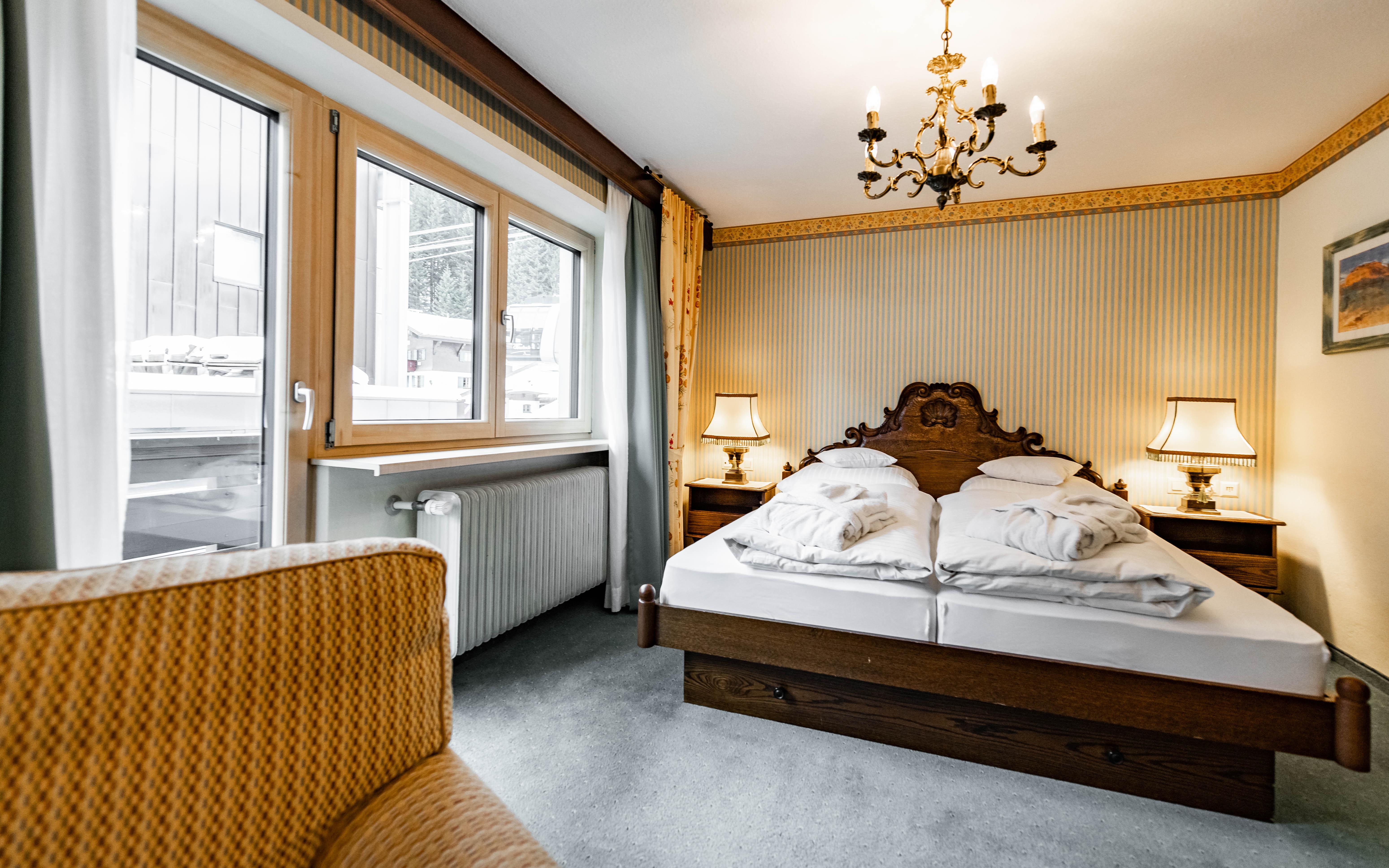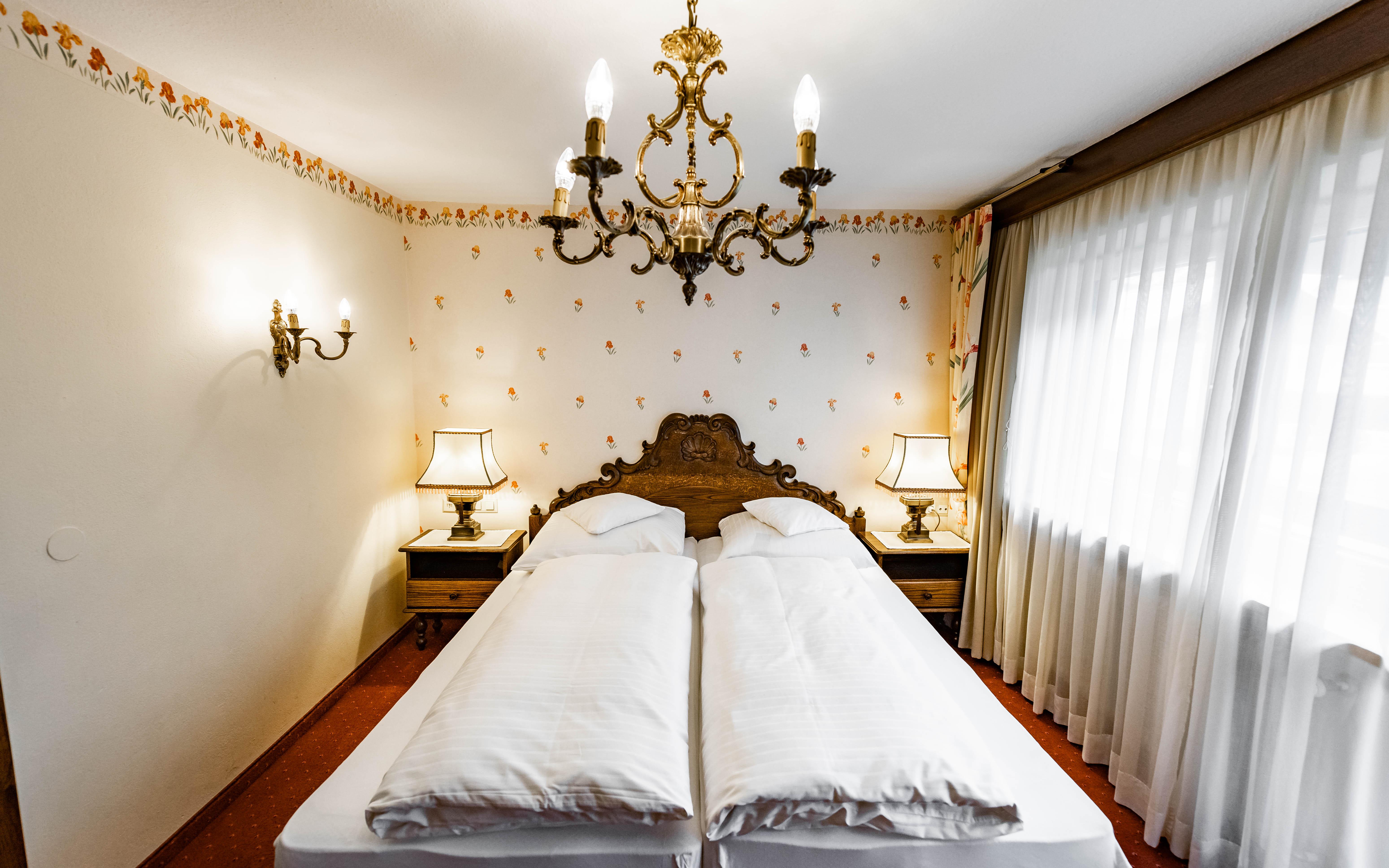 Unsere gemütlichen, im Retro-Stil eingerichteten Doppelzimmer ermöglichen tolle Aussichten auf die Berg- und Rodelbahn Lech-Oberlech und das Lecher Omeshorn.