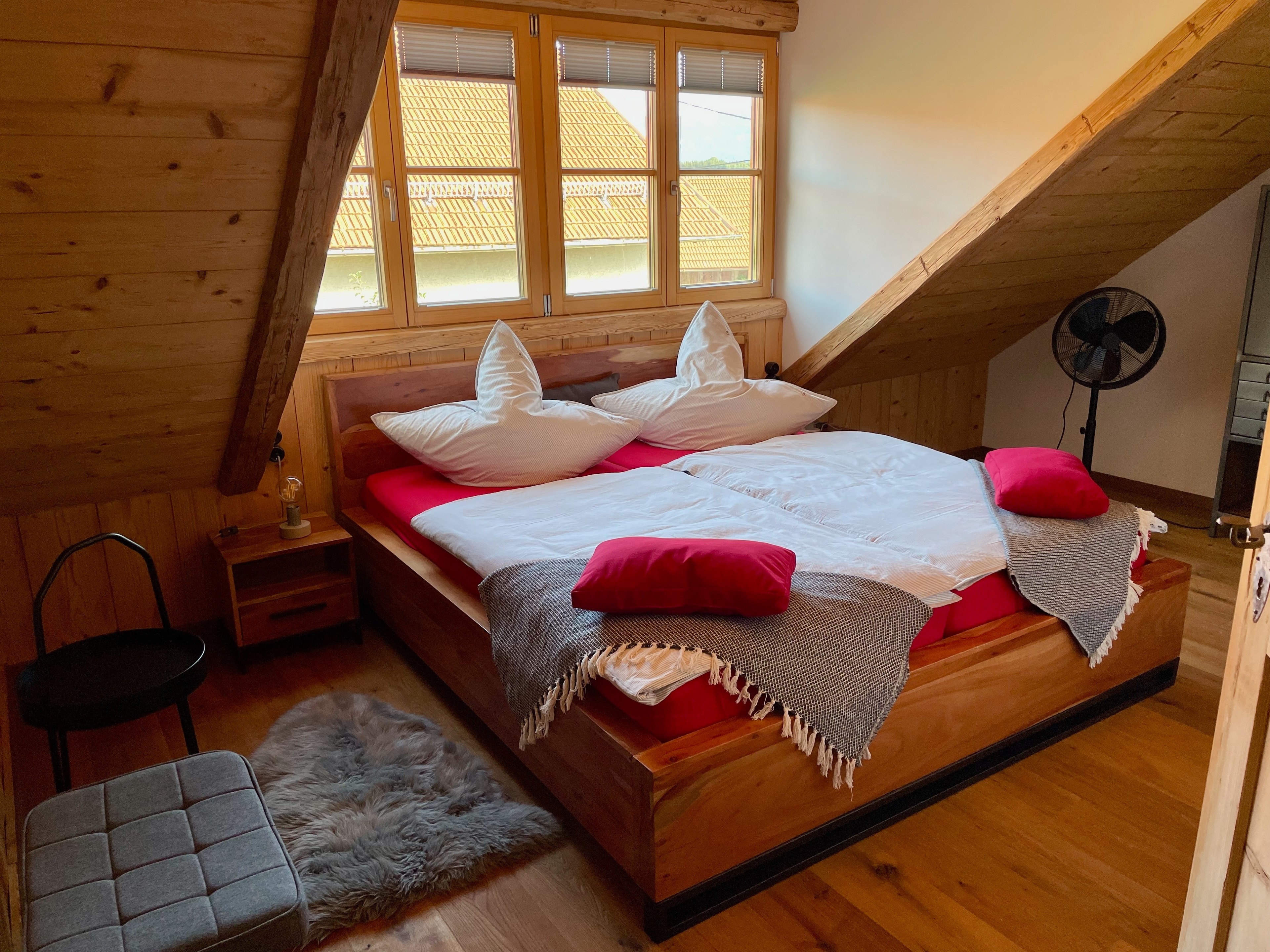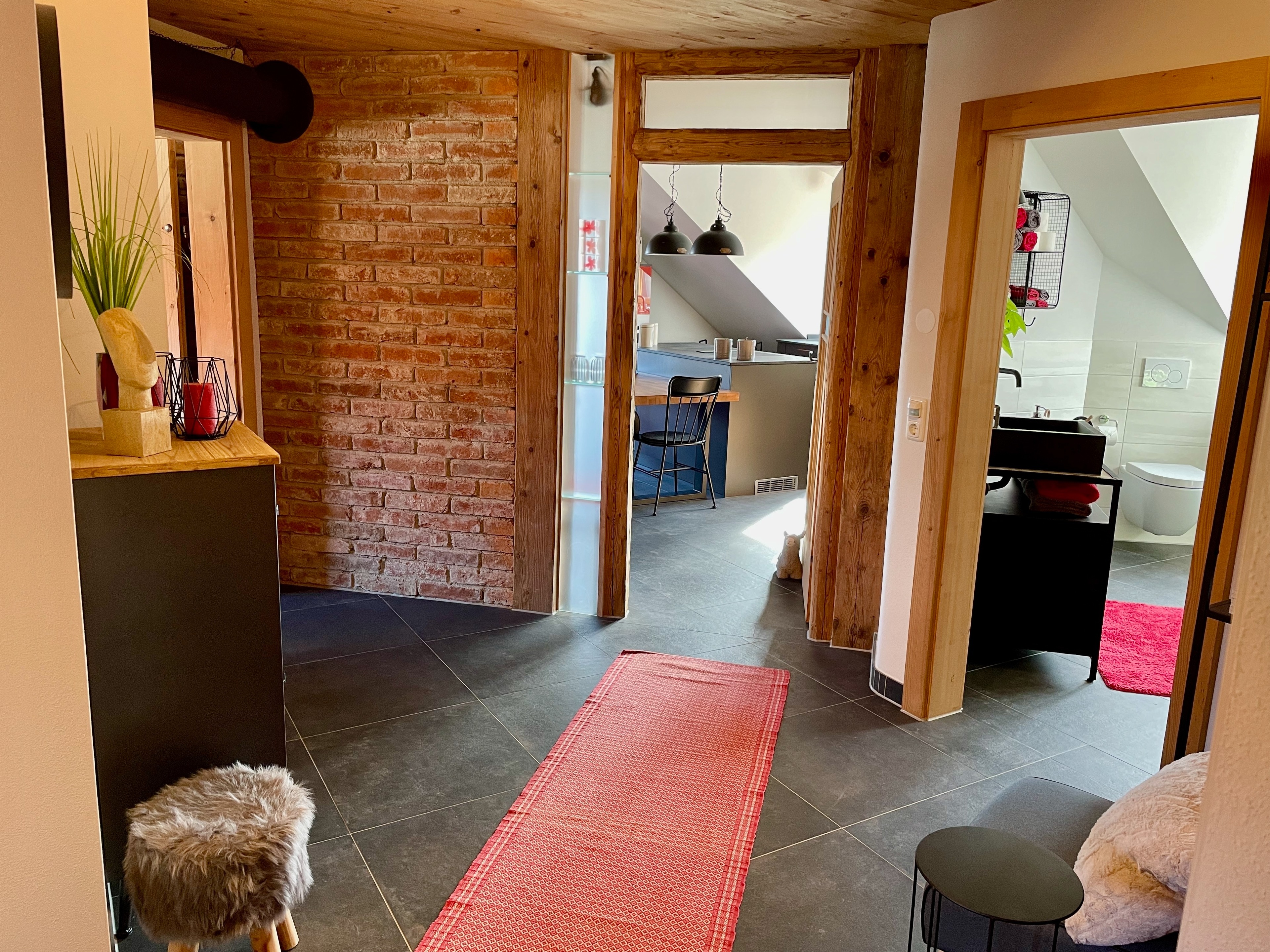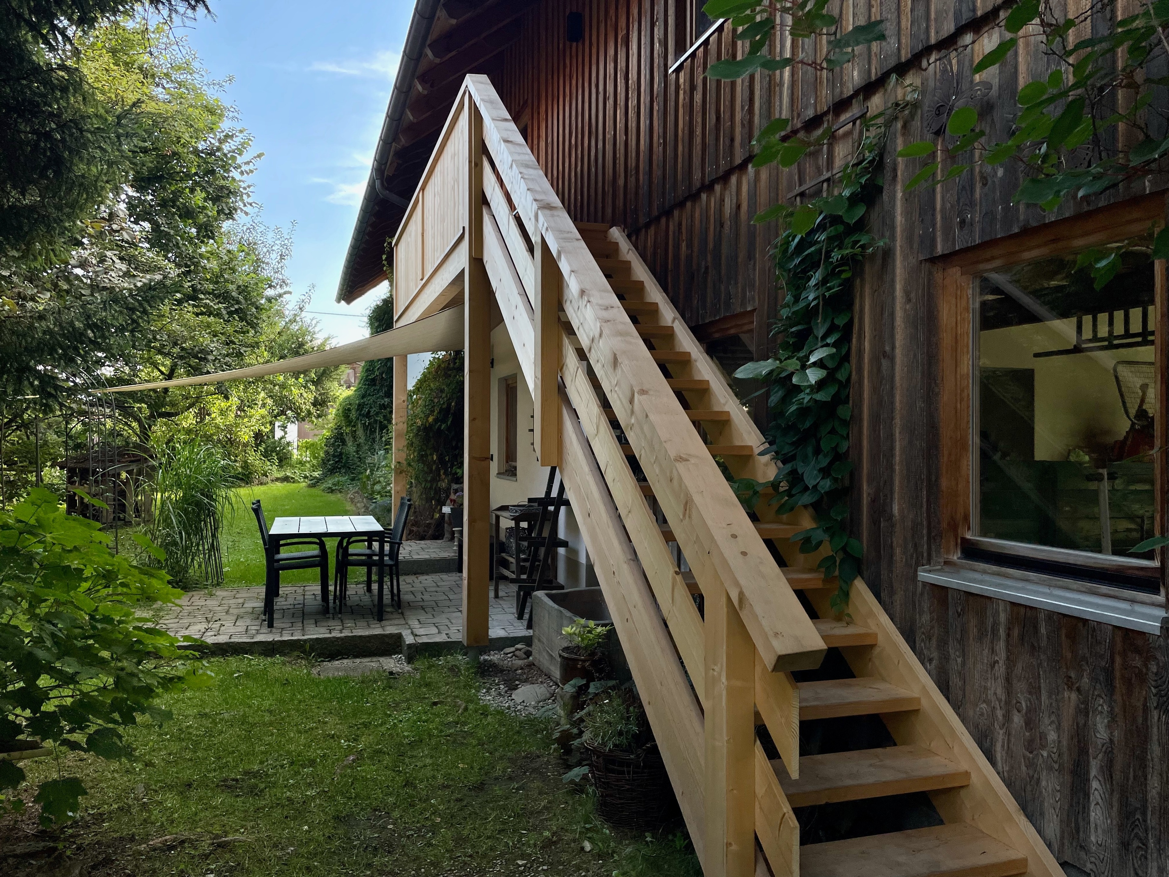 Wir freuen uns, Ihnen unsere neu ausgebaute Ferienwohnung zu präsentieren. Über eine Außentreppe gelangen Sie in das separate Treppenhaus der Wohnung. Eine weitere Treppe führt in das Dachgeschoss. Dort erwartet Sie das etwa 80 Quadratmeter große, lichtdurchflutete Feriendomizil. Vom Balkon aus genießen Sie den herrlichen Blick auf die saftig grünen Wiesen und die imposante Ammergauer Alpenkette.