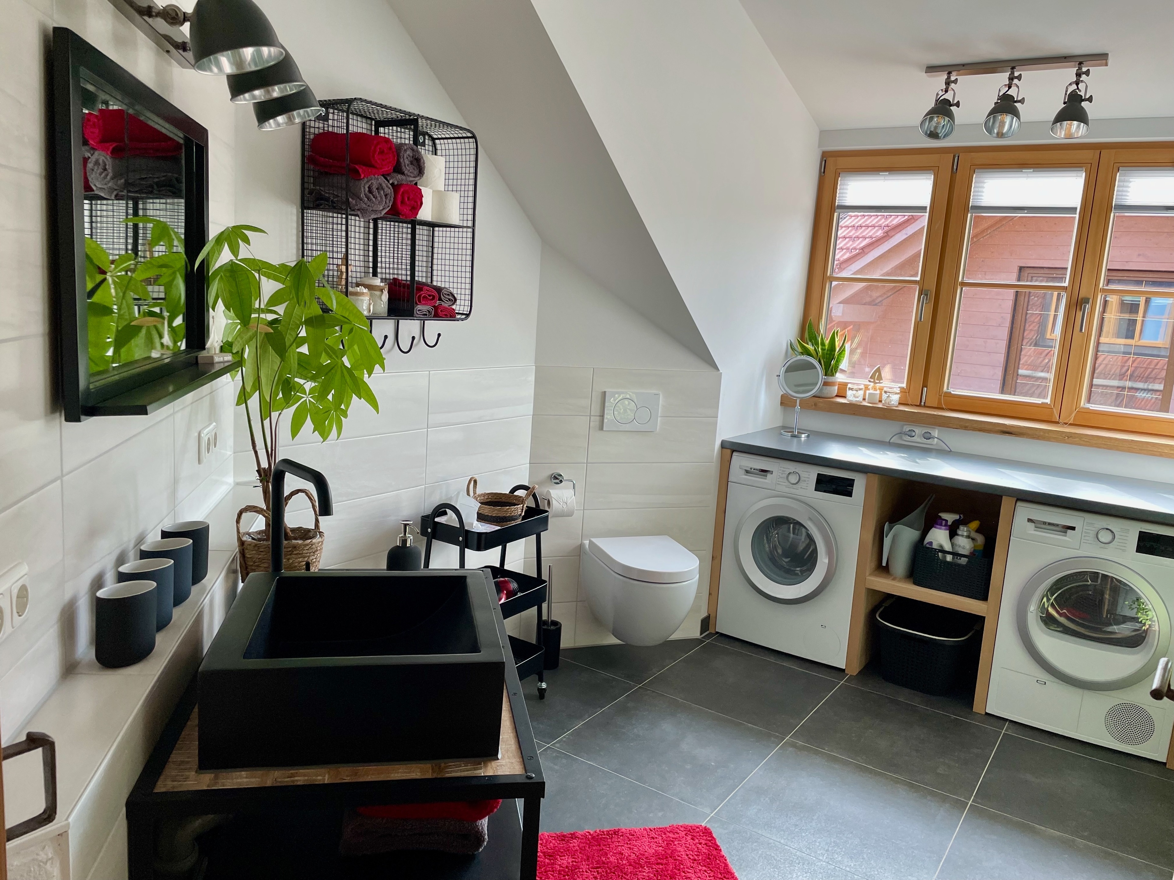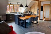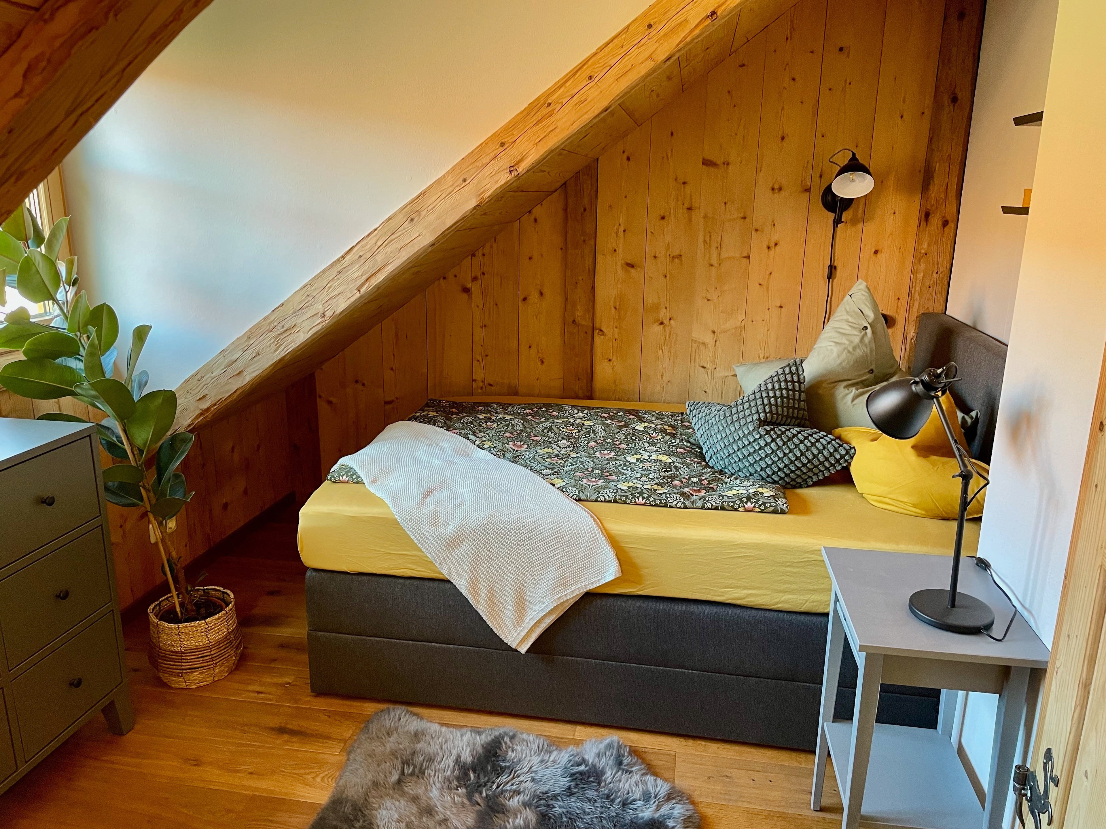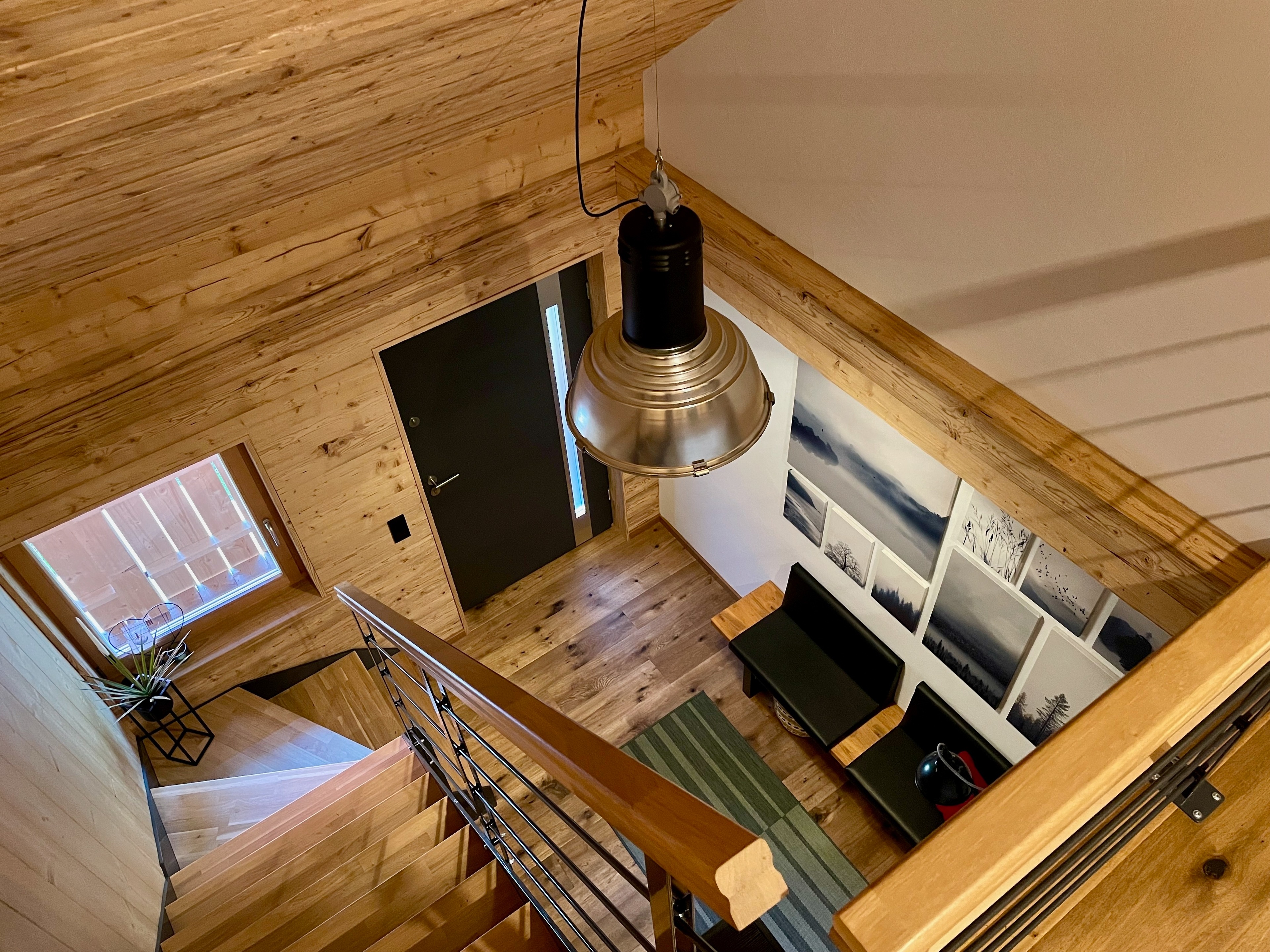 Wir freuen uns, Ihnen unsere neu ausgebaute Ferienwohnung zu präsentieren. Über eine Außentreppe gelangen Sie in das separate Treppenhaus der Wohnung. Eine weitere Treppe führt in das Dachgeschoss. Dort erwartet Sie das etwa 80 Quadratmeter große, lichtdurchflutete Feriendomizil. Vom Balkon aus genießen Sie den herrlichen Blick auf die saftig grünen Wiesen und die imposante Ammergauer Alpenkette.