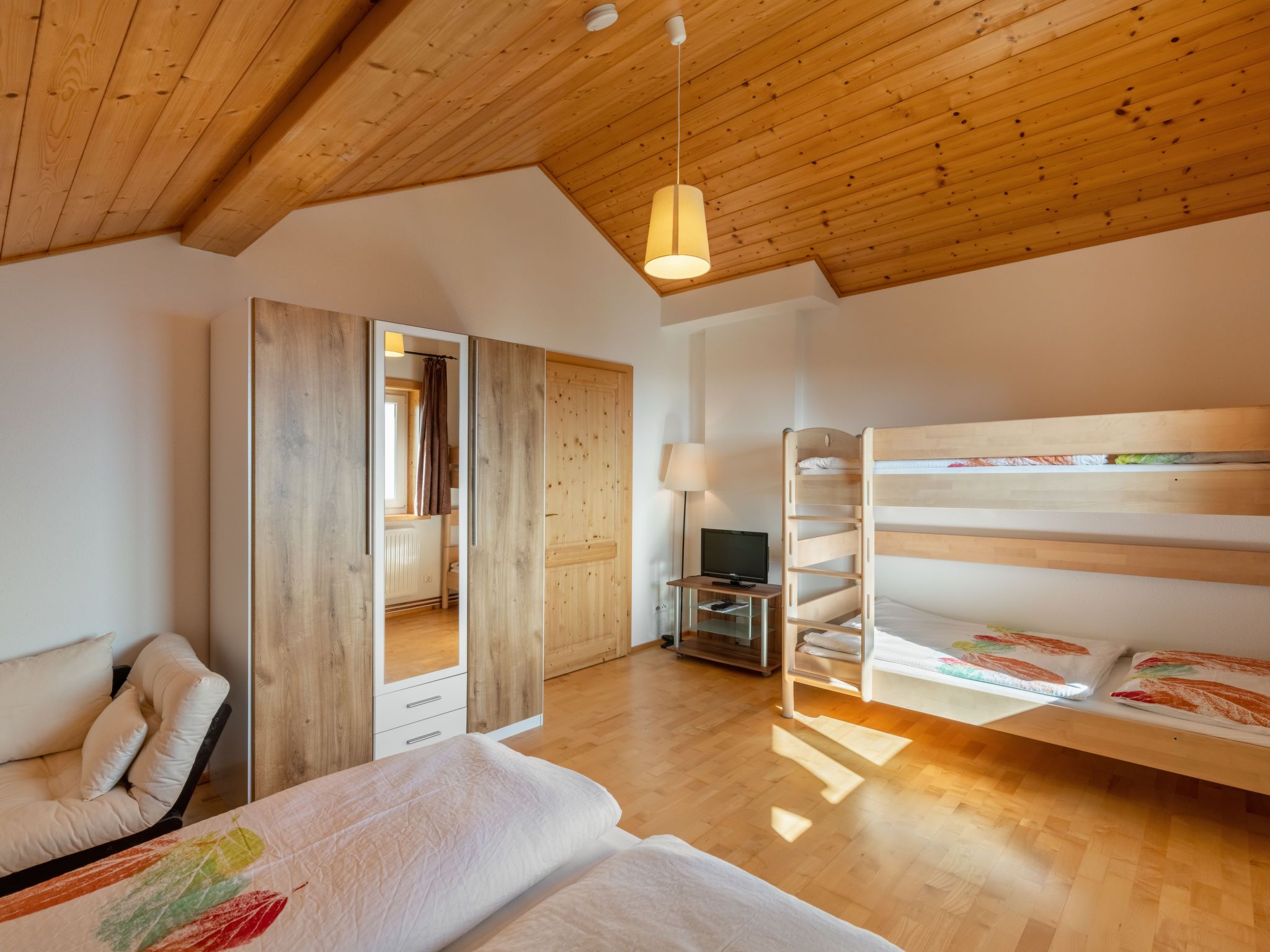 Pistenblick Gross, 4-Zimmer-Wohnung 120 m2 auf 2 Stockwerken. Geräumig, teilweise abgeschrägt, komfortabel eingerichtet: Eingang. Wohnzimmer mit Wintergarten mit Sat-TV. Ausgang zum Balkon. 1 Zimmer mit 1 Doppelbett (2 x 90 cm, Länge 200 cm). Küche (Backofen, Geschirrspüler, 4 Glaskeramikplatten, Mikrowelle, Tiefkühler) mit Esstisch. Dusche, sep. WC. Obergeschoss: (Wendeltreppe) Durchgangszimmer mit 1 Doppelbett (140 cm, Länge 200 cm). 1 offenes Zimmer mit 2 Betten (90 cm, Länge 200 cm). 1 Zimmer mit 1 x 2 Etagenbetten (90 cm, Länge 200 cm), 1 Doppelbett (180 cm, Länge 200 cm). Bad, sep. WC. Grosser Gartensitzplatz. Terrassenmöbel. Schöne Panoramasicht auf die Berge und das Tal. Zur Verfügung: Internet (WLAN, gratis). Parkplatz beim Haus. Bitte beachten: geeignet für Familien. Nichtraucher-Unterkunft. Rauchmelder.