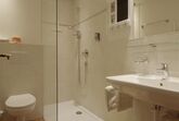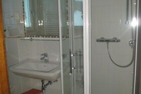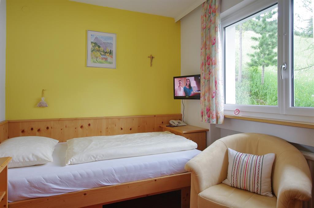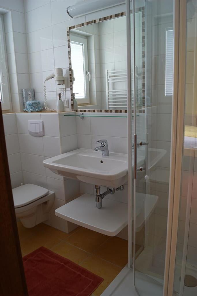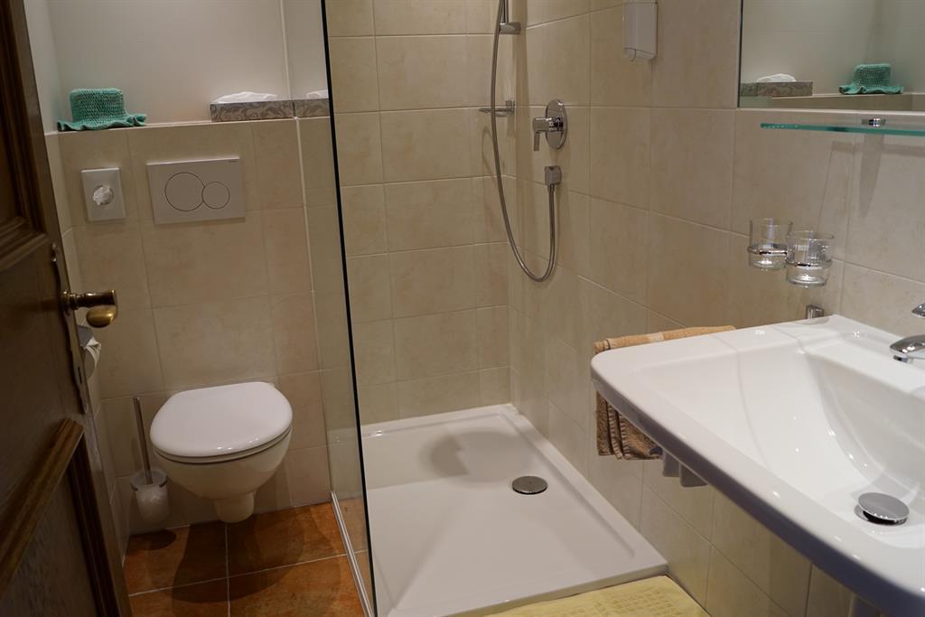 Unser Einzelzimmer ist im 1. Stock nach Osten gerichtet mit Blick auf den Wöster und hat ein großes Bett (120x200). Das Badezimmer hat ein großes Fenster und ist ausgestattet mit einer Dusche, WC und Bodenheizung.
