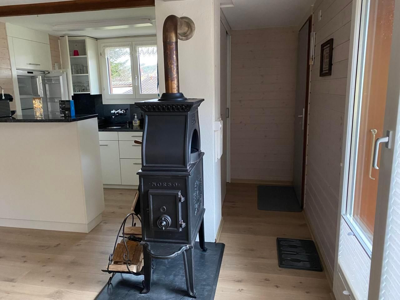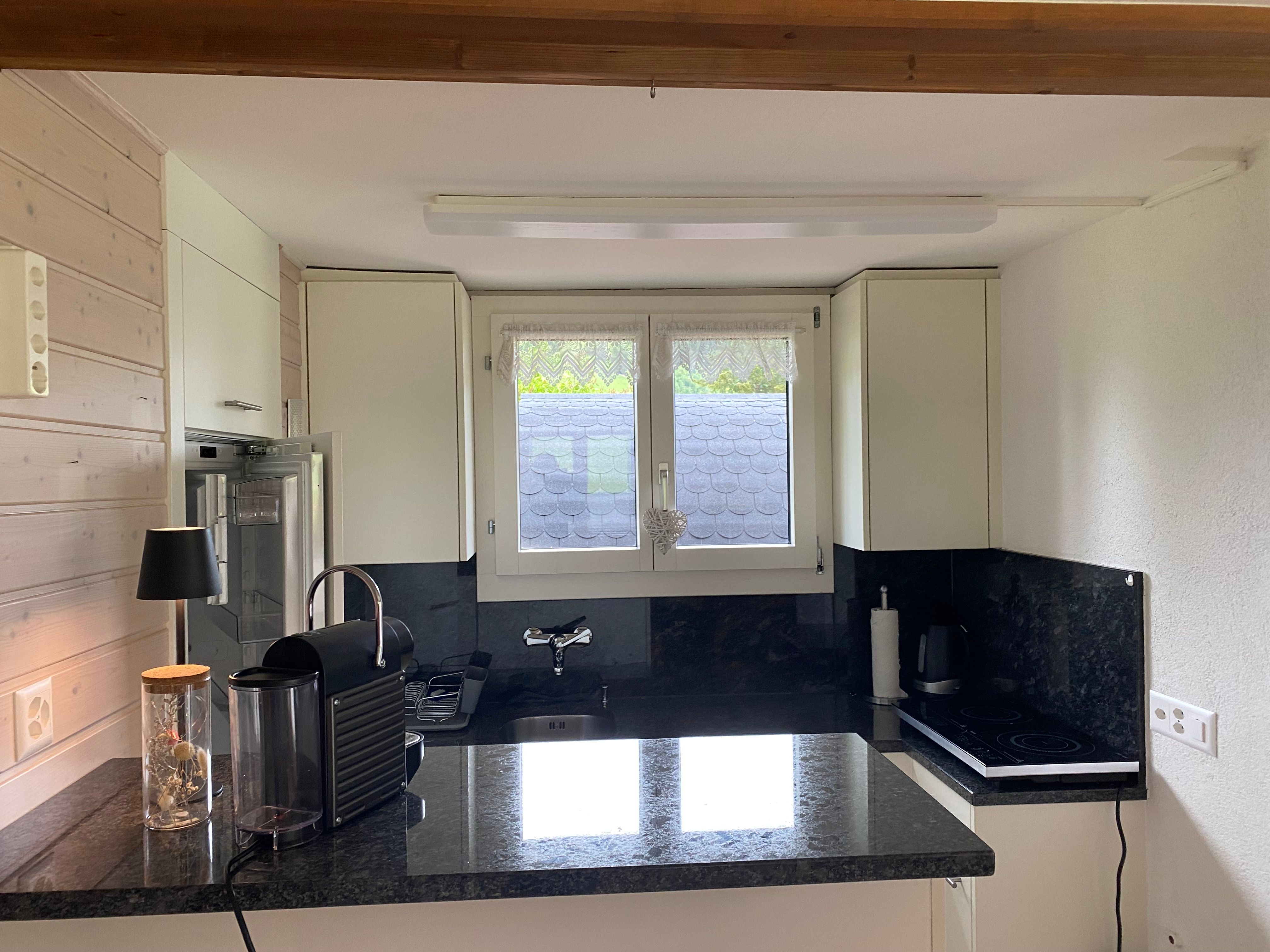Die Küche ist zweckmässig eingerichtet, aber alles was es braucht in einem kleinen Häsuchen (Kaffeemaschine, Kühlschrank, zwei Kochplatten). Es dient wirklich zum Detox von Alltagsgeräten, deshalb es gibt keine Geschirrmaschine oder ähnliches, auch ein Backofen gibt es nicht.