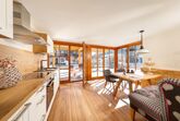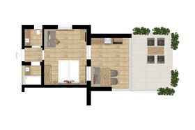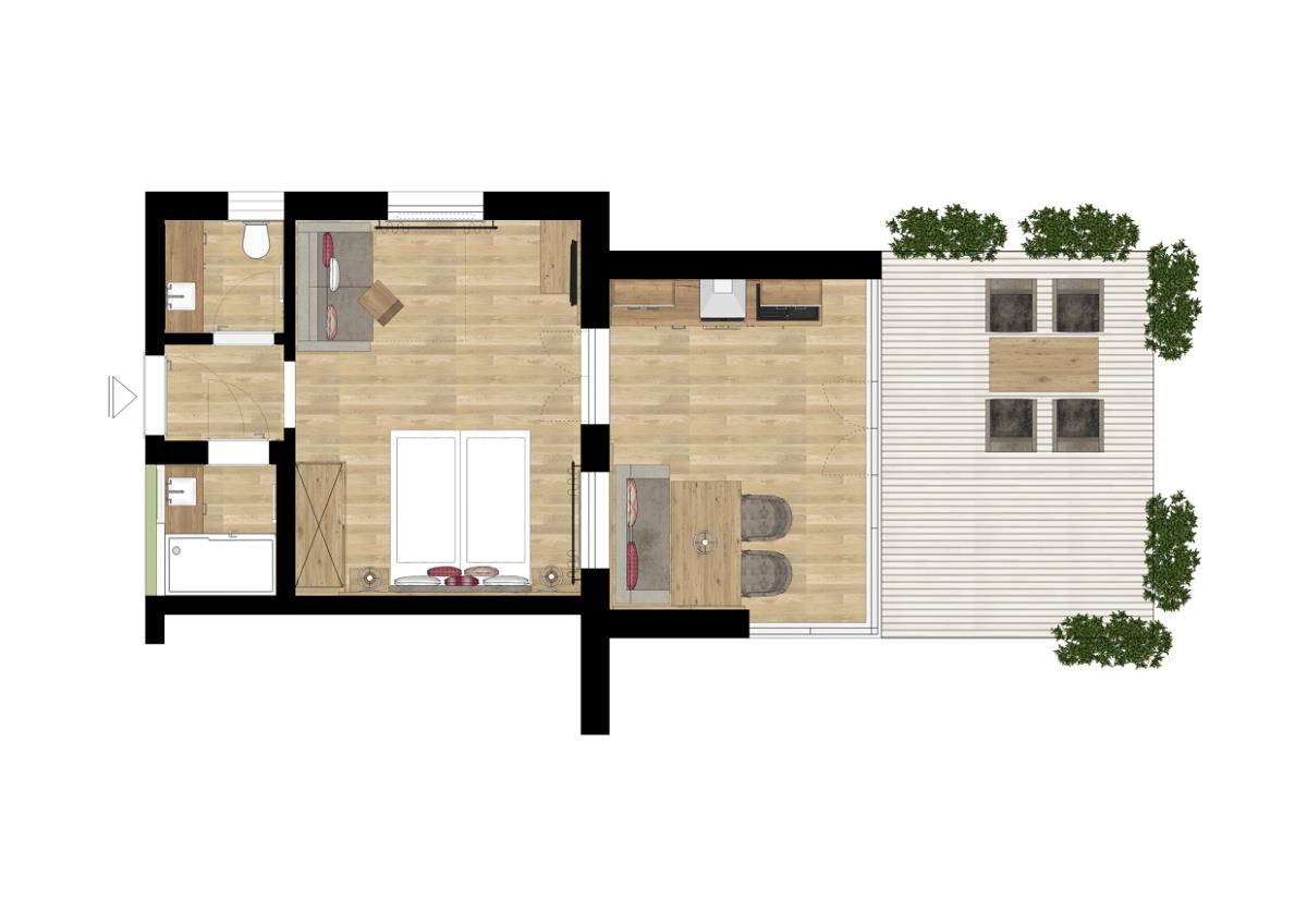 Schlafzimmer mit bequemen Doppelbett und Schlafcouch, offene Wohnküche mit Esstisch, Badezimmer mit Rainshower, 2 Waschbecken, separates WC.