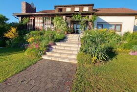 Von einer großen Parkfläche am Haus führt eine breite, flache Treppe, flankiert von Blumen in Ihre Erdgeschoss-Wohnung.