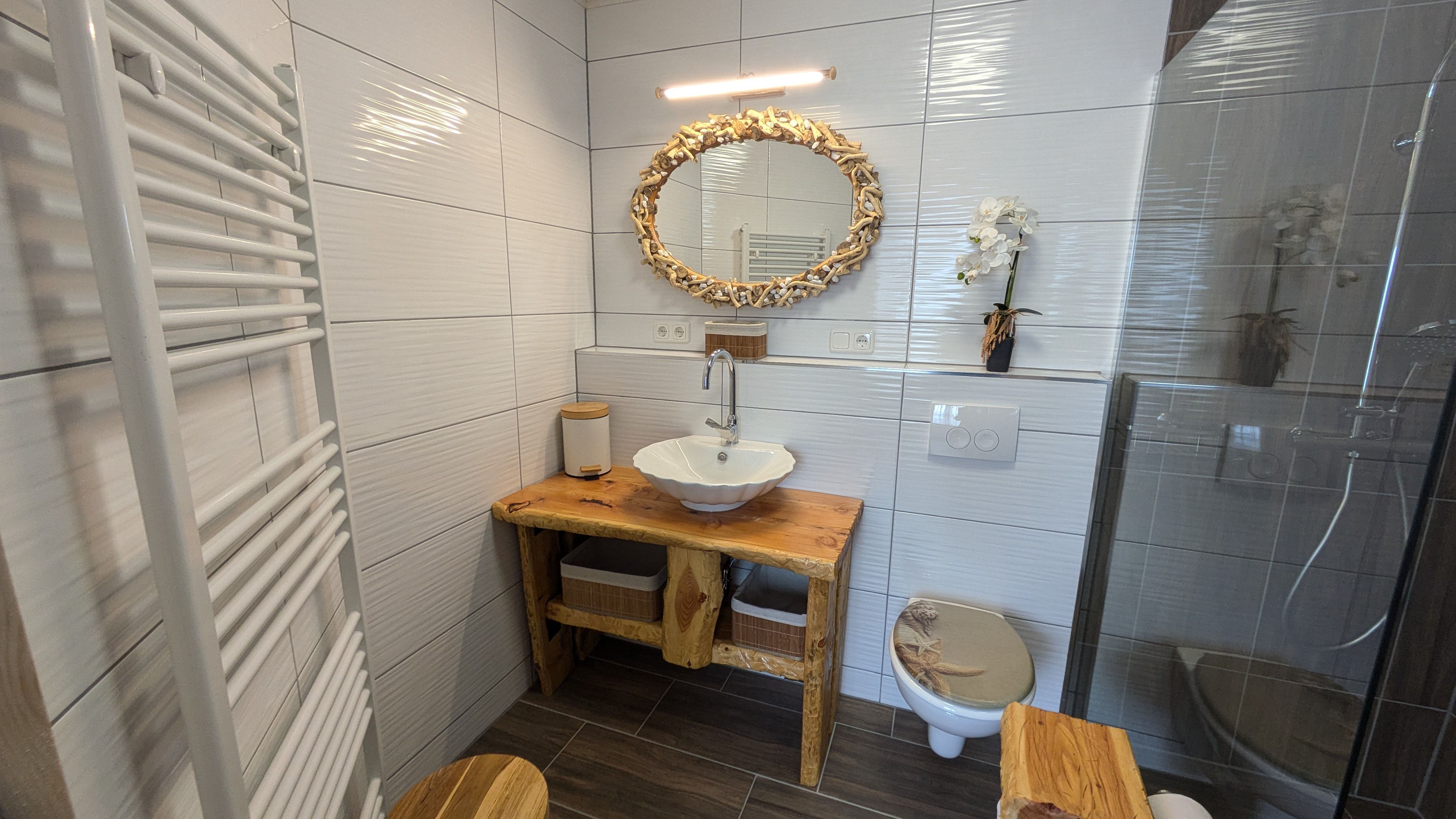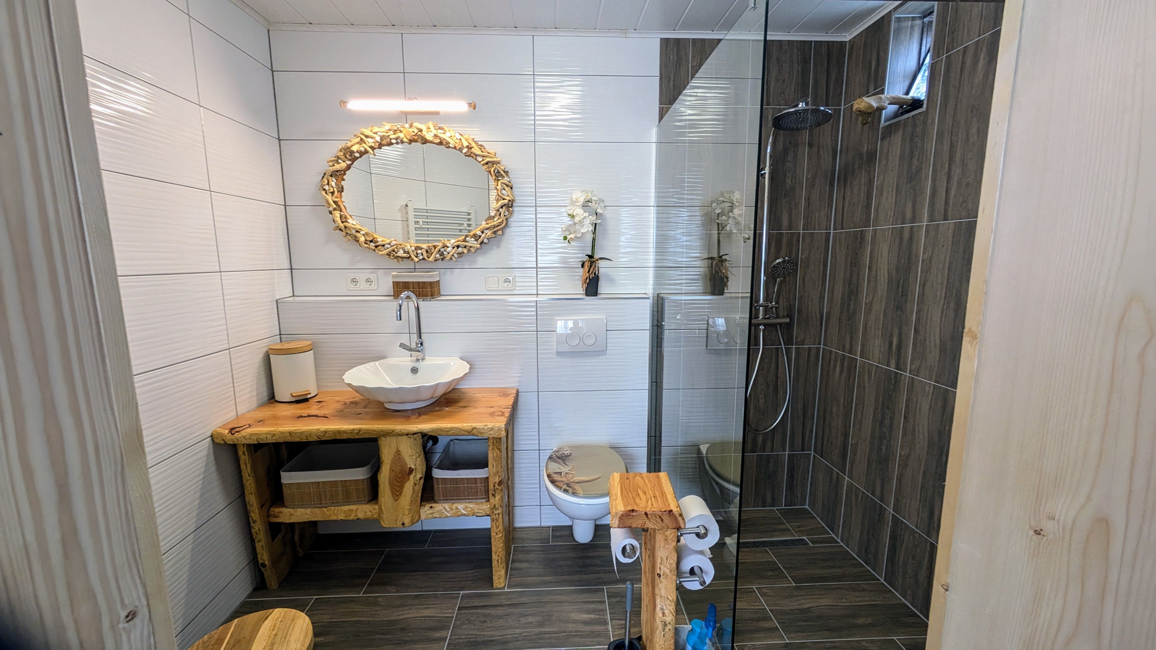 Das helle Bad betreten sie durch eine Glasschiebetüre. Dahinter verbirgt sich eine Walk-In Dusche mit Regenbrause. Eine Glasscheibe getrennt Dusche und Waschbereich. Eine Waschschale in Muschelform ziert den massiven Waschtisch aus Lärchenholz.