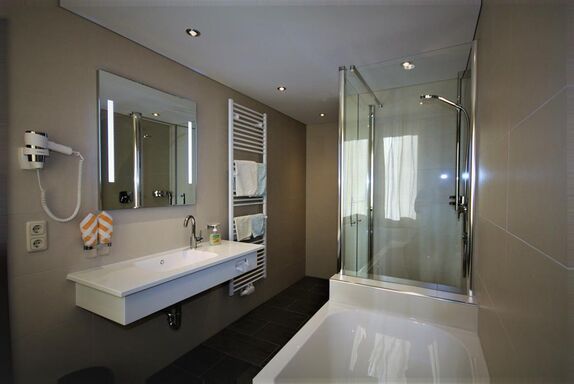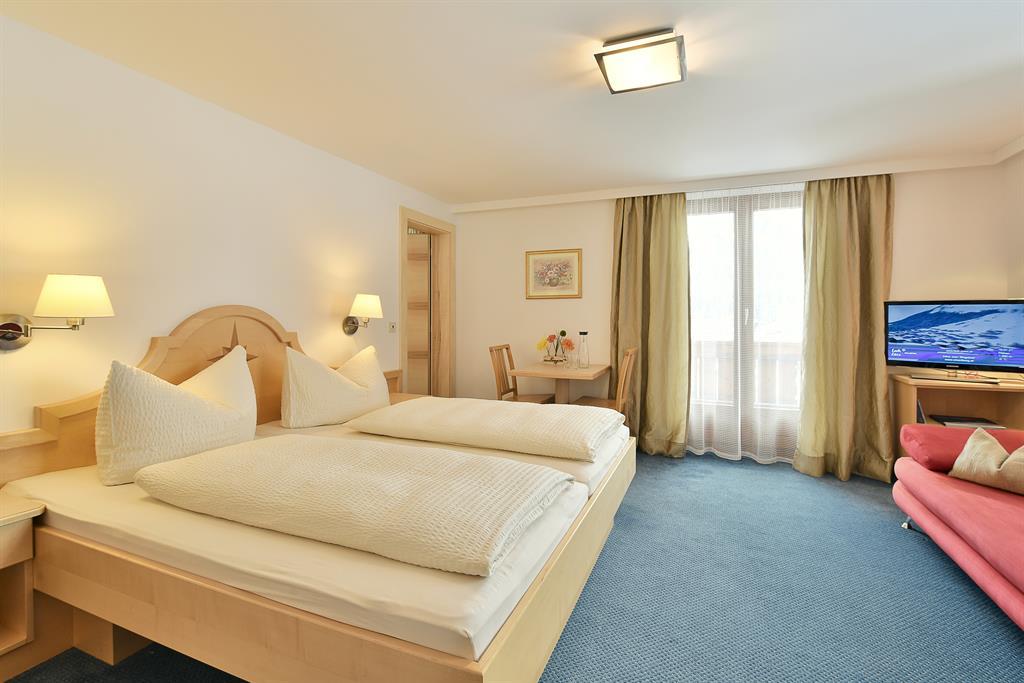 Ein Doppelbettzimmer mit Bad/WC/Balkon/TV/Tel/Safe. Ein sehr schönes Zimmer. Die Einrichtung ist neu aus hellem Holz und wirkt sehr freundlich und einladend. Dieses Zimmer ist ausgestattet mit einer Couch, Tisch und 2 Stuhl. Hier ist das Badezimmer sehr großzügig mit Waschtisch, Badewanne, Duschkabine, WC getrennt. Das Badezimmer hat ein Fenster mit Aussicht richtung Rüfikopf und Ortszentrum Lech.
