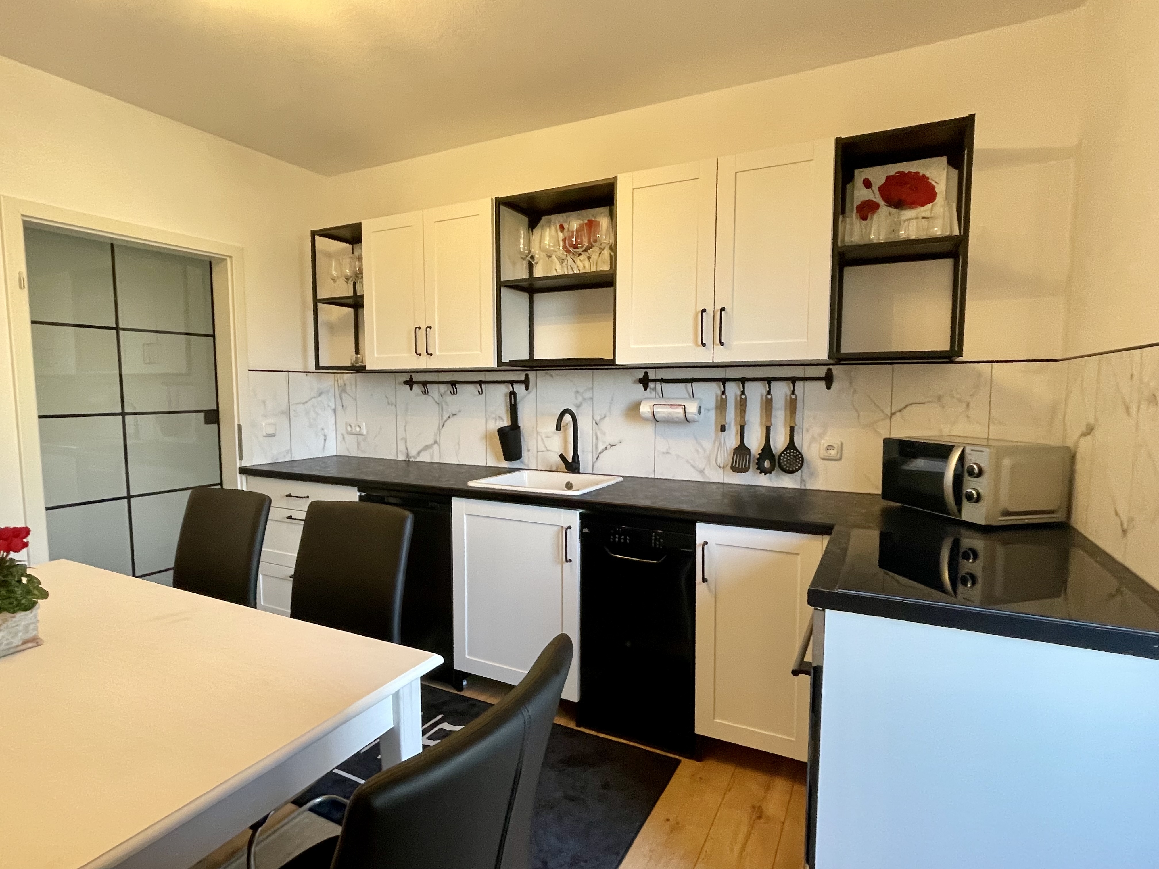 - eine voll ausgestattete Küche mit gemütlicher Essecke, Sitzbank und Stühlen