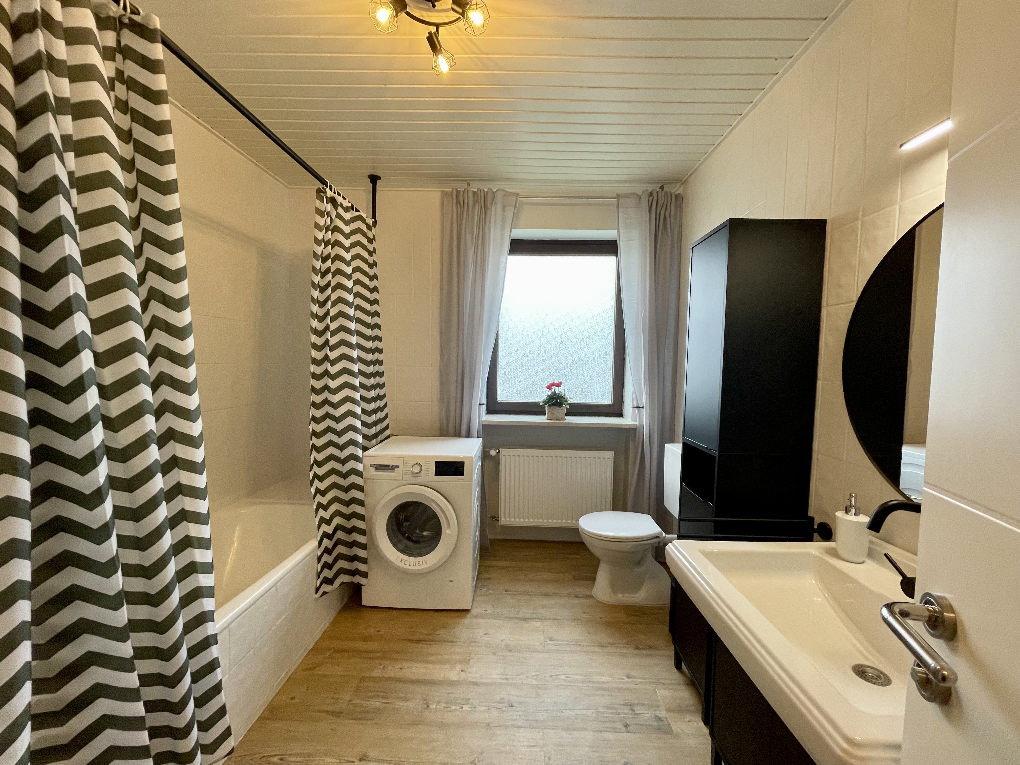 - helles Badezimmer mit Badewanne, separater Dusche und Waschmaschine