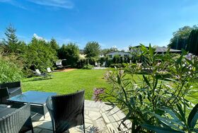 • ein großer Garten, ausgestattet mit Sonnenliegen, Tischen und Stühlen
